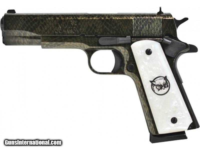 Description: Guns Listing ID: 179515 Same features as our standard 1911A1 in blue finish. Military style parts. Beautiful Finish!! Snake print is applied using Hydro Graphic dipping. Base coat is a dark goldish green, high grade epoxy. There is a clear coat over the entire finish to protect the print from the rigors of shooting. Gun comes with synthetic white, mother of pearl grips with owl head logo, or you can substitute in the same Black Dymondwood grips that come on the Copperhead. - CALIBER .45 ACP - MAGAZINE (1) 8rd capacity - SIGHTS GI Mil-Spec - GRIPS Synthetic white, mother of pearl - FINISH Water Moccasin Snake SOLD Manufacturer: IVER JOHNSON Model: 1911A1 WATER MOCCASIN .45ACP Caliber Info: .45 ACP Condition: new Barrels: 5 BARREL Action: SEMI AUTOMATIC Finish: BLACK Weight: 2.6 LBS. |