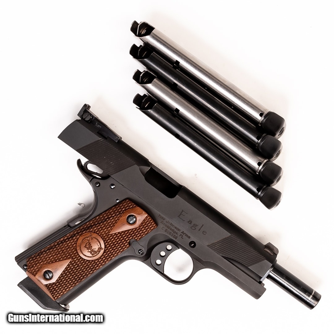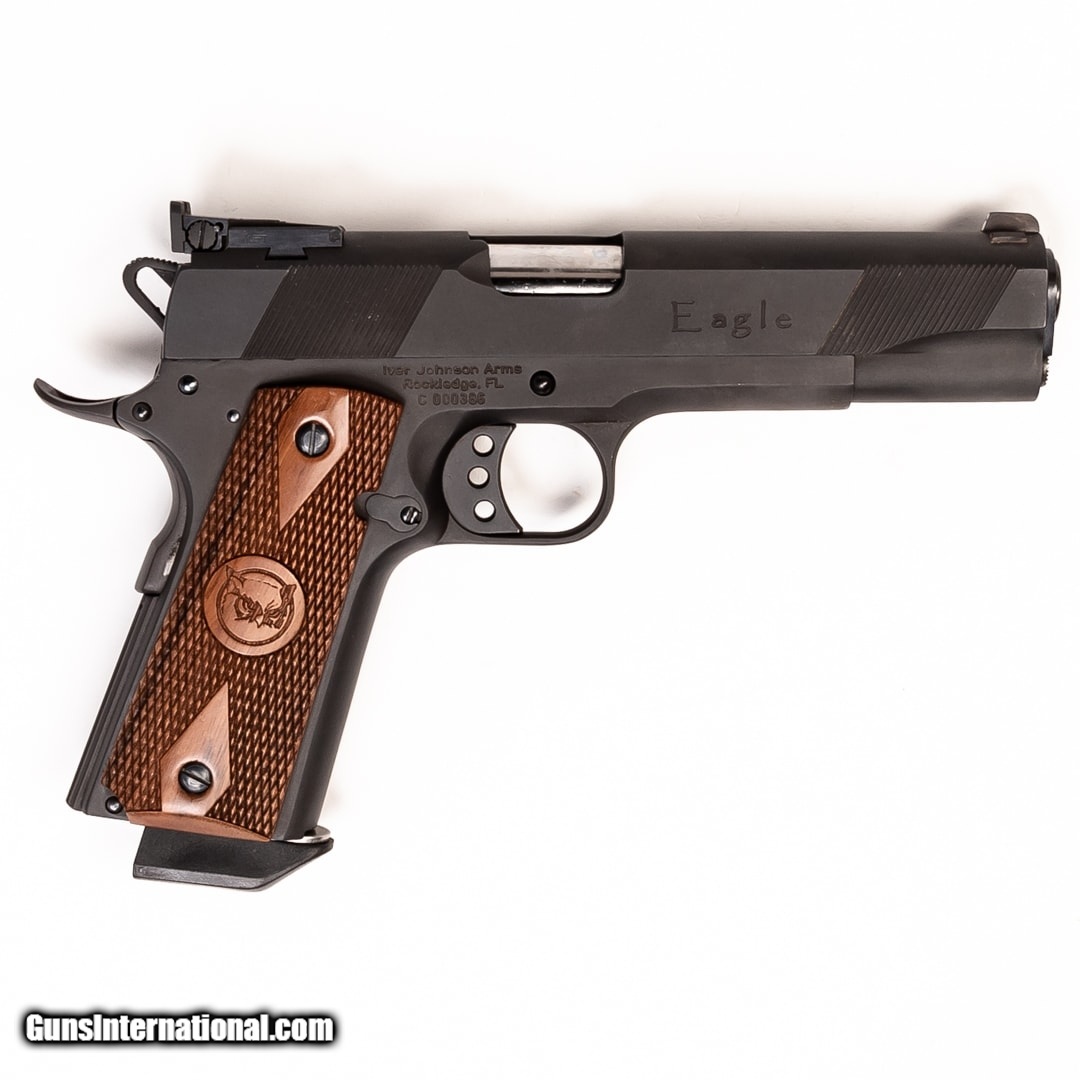 Description: Guns Listing ID: 482805 The Iver Johnson Eagle is a 1911, a classic ergonomic handgun that has lasted over the decades, faithfully serving at the side of many. Iver Johnson has a great reputation for firearm manufacturing, and it is hard to go wrong with a John Moses Browning Design. This handgun includes five 8-round magazines, the original wood Iver Johnson grips, and the original case. SOLD Manufacturer: IVER JOHNSON Model: EAGLE Caliber Info: .45 ACP Condition: Used - Certified Barrels: 4.8 BARREL Finish: BLACK |