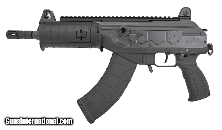 IWI Galil Ace Gap 7.62X39 caliber pistol. IWI Galil Ace pistol chambered in 7.62X39 with 8.3” barrel, quad rail handguard with covers, fixed sights, ambi safety and single point sling adapter. Comes with one magazine and box. New.