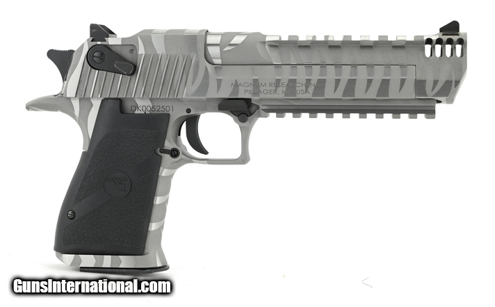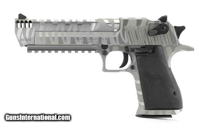 Description: IWI Desert Eagle .44 Mag caliber pistol. Stainless Steel with compensator and tiger stripe finish.
