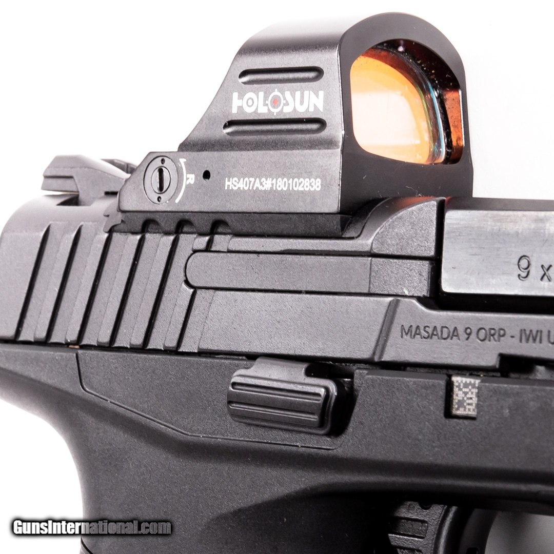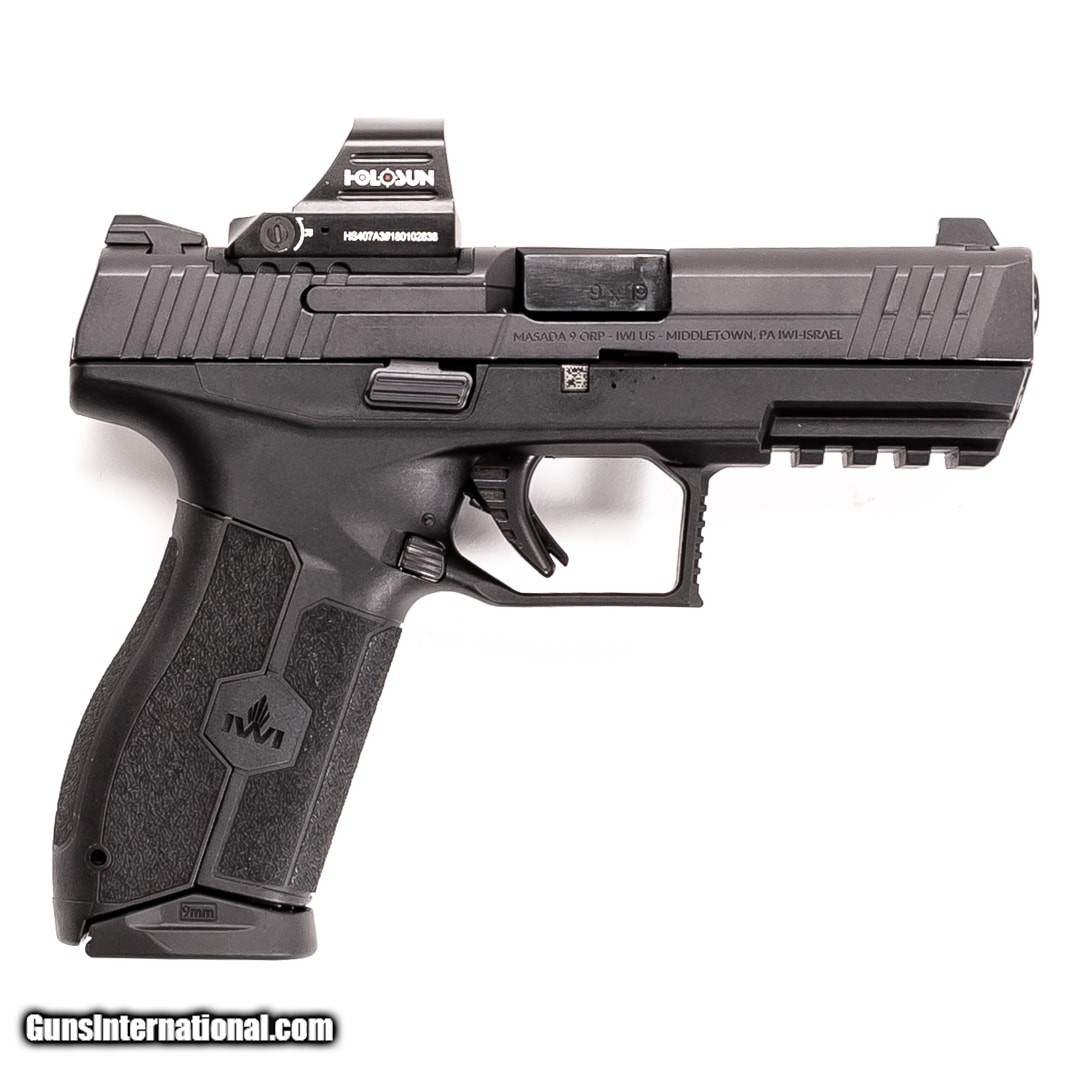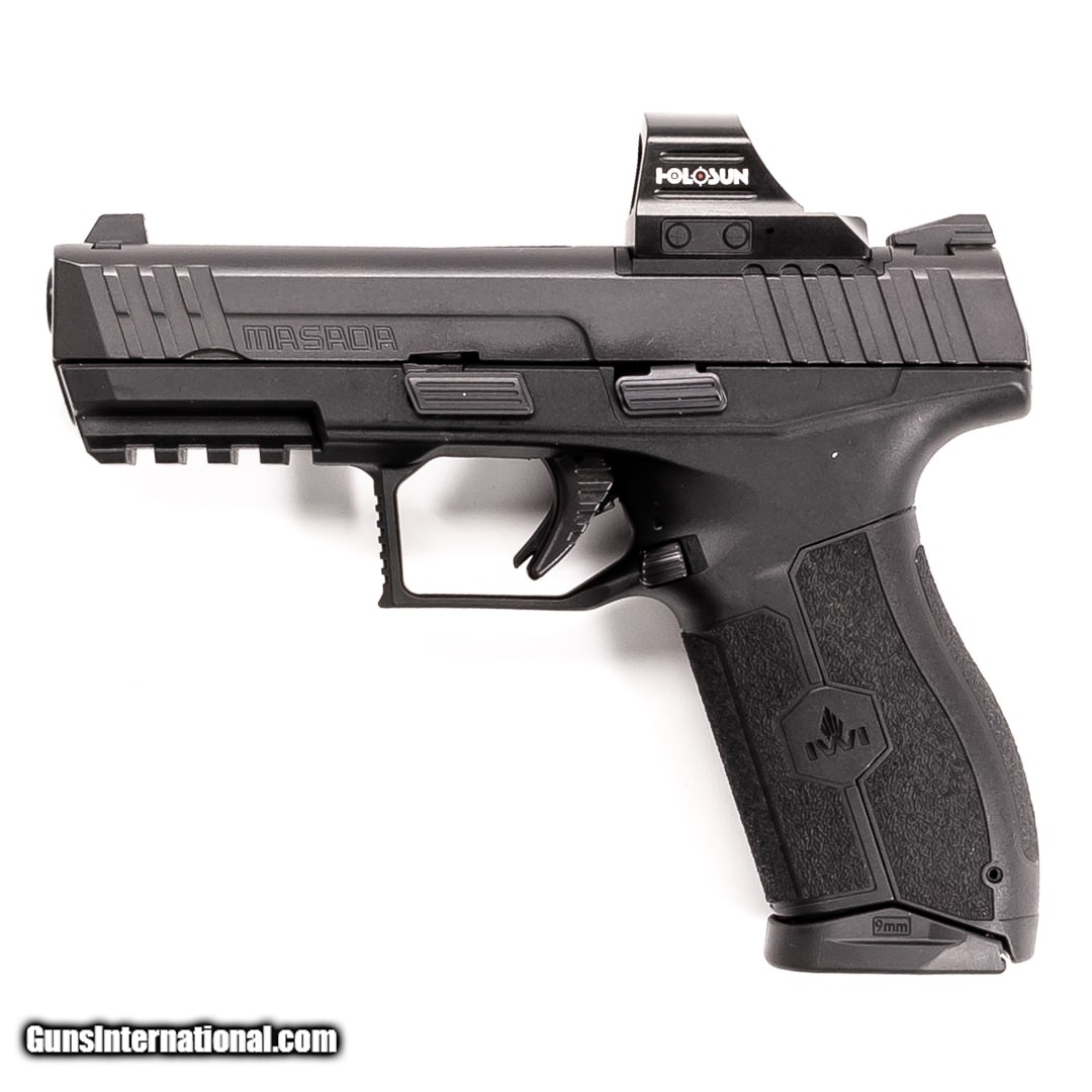 Description: Guns Listing ID: 309143 The IWI Masada 9 is an Israeli-made self-defense handgun well-equipped for duty use, personal protection, and target shooting. It offers a large trigger well for gloved hands, a low-bore axis for less muzzle flip, and textured grips. Israelis have become known for making phenomenal weaponry, and this Masada 9 is no exception. This pistol is in very good condition and comes with the original box, manual, three 17-round magazines, optic plates, Holosun red dot optic, and three backstraps. SOLD Manufacturer: IWI Model: MASADA 9 ORP Caliber Info: 9MM LUGER (9X19 PARA) Condition: Used - Certified Barrels: 4.1 BARREL Finish: BLACK |
