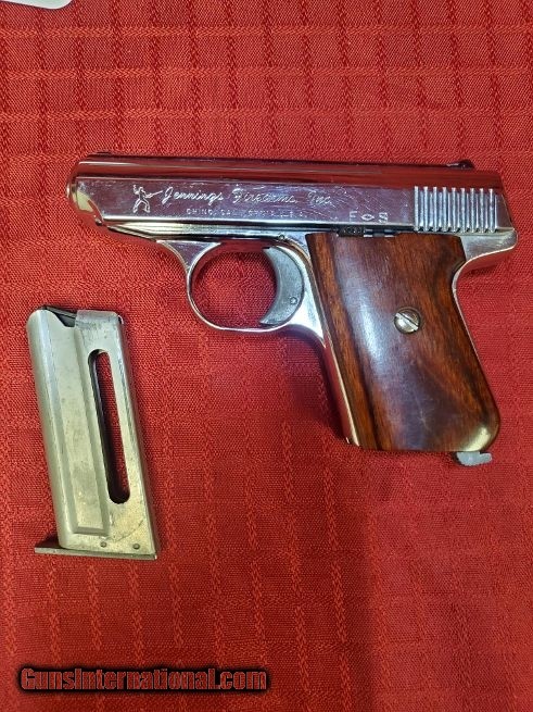 Description: Guns Listing ID: 485725 JENNINGS FIREARMS J-22 - .22LR/.22MAG - 6 ROUNDS - 2.5 \" 22 LR, 2 1/2\" barrel with a bright excellent bore. The chrome surfaces of this pocket pistol rate very good showing scattered light handling marks throughout. The smooth hardwood panel grips rate excellent showing little if any wear. Included is the factory box correctly end-labeled and numbered to the gun and two 6-round magazines. Manufacturer: JENNINGS Model: J-22 Caliber: .22 LONG RIFLE Magazines: ONE - 6 ROUND Sights: FIXED Weight: 16oz Overall Length: 5\" Barrel Length: 2.5\" SERIAL NUMBER: 295214 SKU NUMBER: DJ1027638 SOLD Manufacturer: JENNINGS FIREARMS Model: J-22 Condition: Used - Non-Certified Barrels: 2.5 Gauge Info: .22LR/.22MAG Finish: chrome |