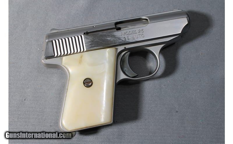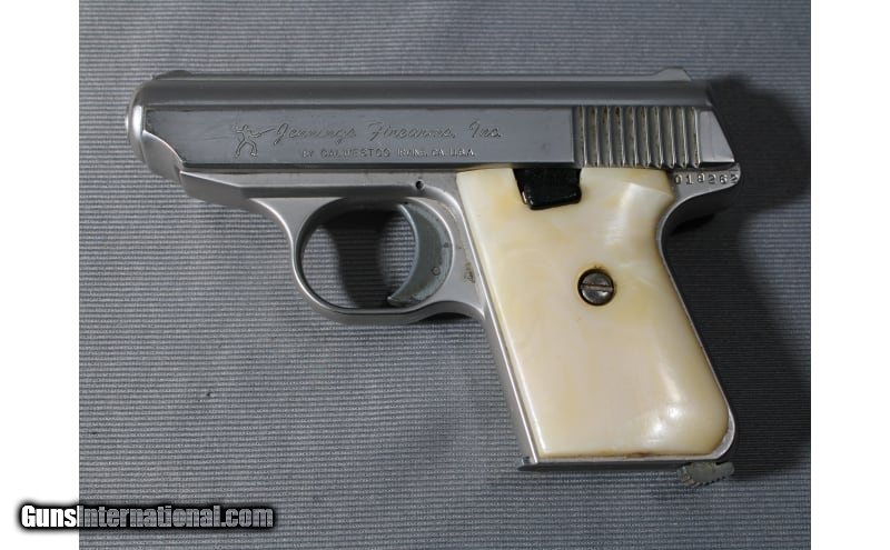 Description: Jennings Model 25 with faux pearl grips. Slide shows some scratches but otherwise finish seems good for it's age. Not often seen anymore. .25 ACP SOLD Metal Condition: good Bore Condition: bright Barrels: 2 1/2" barrel Weight: 14 oz. Sights: factory sight Item Location: Council Bluffs, IA |
