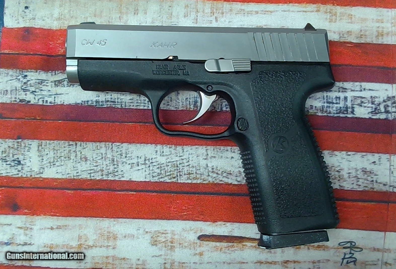 Description: Guns Listing ID: 904045 This pistol is in very good condition. It has a couple of blemishes on the top of the slide and the magazine has white paint on the bottom of it. The firearm is in perfect operational condition. This sale is for the firearm as pictured with one 6 round magazine. The Kahr Arms CW45 is a semi auto pistol chambered for .45 ACP. Features include a 3.6\" barrel, stainless steel slide, 3-dot sights, a striker fired action, and includes one 6 round magazine. SOLD Manufacturer: KAHR ARMS Model: CW 45 Caliber Info: .45 ACP Condition: Used - Non-Certified Barrels: 3.64 BARREL Finish: STAINLESS AND BLACK |