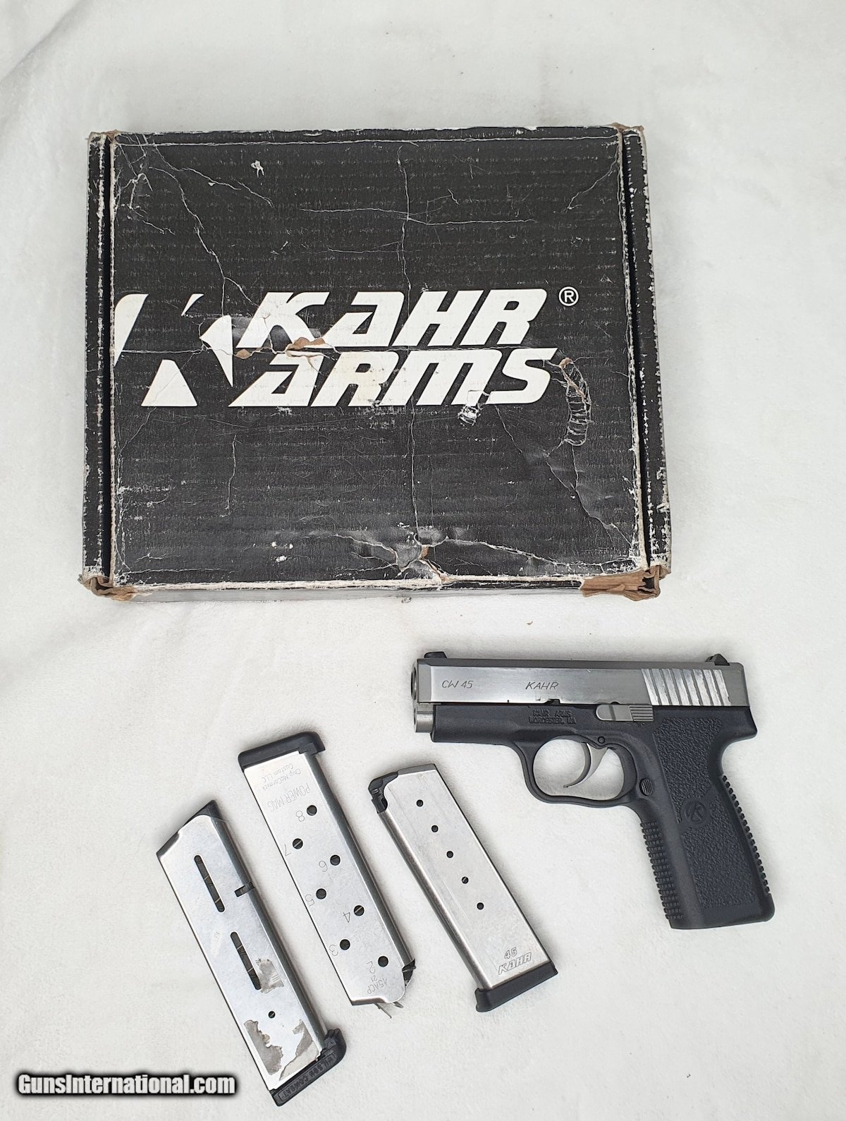 Description: Guns Listing ID: 557540 KAHR ARMS CW45 - .45 ACP, with three magazines, and original box. Gun is in good condition, light wear, light scratches seen on barrel. Grip is clean. One magazine has sticker residue on it .Box shows lots of wear. See photos for more details. SKU: FCN000693 KCD SOLD Manufacturer: KAHR ARMS Model: CW45 Caliber Info: .45 ACP Condition: Used - Non-Certified Barrels: 3.6 BARREL |