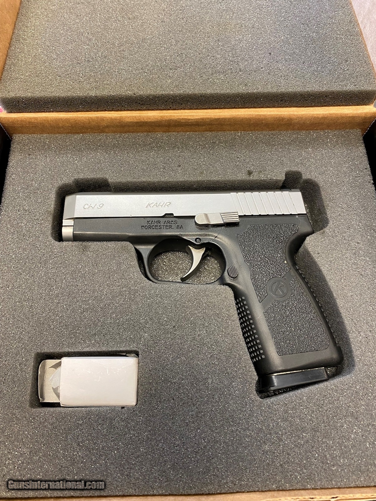 Description: Guns Listing ID: 50912 The Kahr Arms CW is a family of polymer-framed semi-automatic pistols with a stainless steel slide. Barrels are available at 2.6 or 3.6 in length and are adorned with a drift adjustable combat rear sight and a pinned in polymer front sight. As an excellent concealed carry gun textured polymer grips ensure a steady grasp for every shot fired from the CW. Details Caliber 9mm - Capacity 71 - Operation Trigger cocking DAO lock breech Browning-type recoil lug passive striker block no magazine disconnect - Barrel 3.565 conventional rifling 1-10 right-hand twist - Length OA 5.9 - Height 4.5 - Slide Width .90 - Weight Pistol 15.8 ounces Magazine 1.9 ounces - Grips Textured polymer - Sights Drift adjustable white bar-dot combat rear sight pinned in polymer front sight - Finish Black polymer frame matte stainless steel slide - Magazine 1-7 rd Stainless SOLD Manufacturer: KAHR ARMS Model: CW9 Caliber Info: 9MM LUGER (9X19 PARA) Condition: new Barrels: 3.5 BARREL |