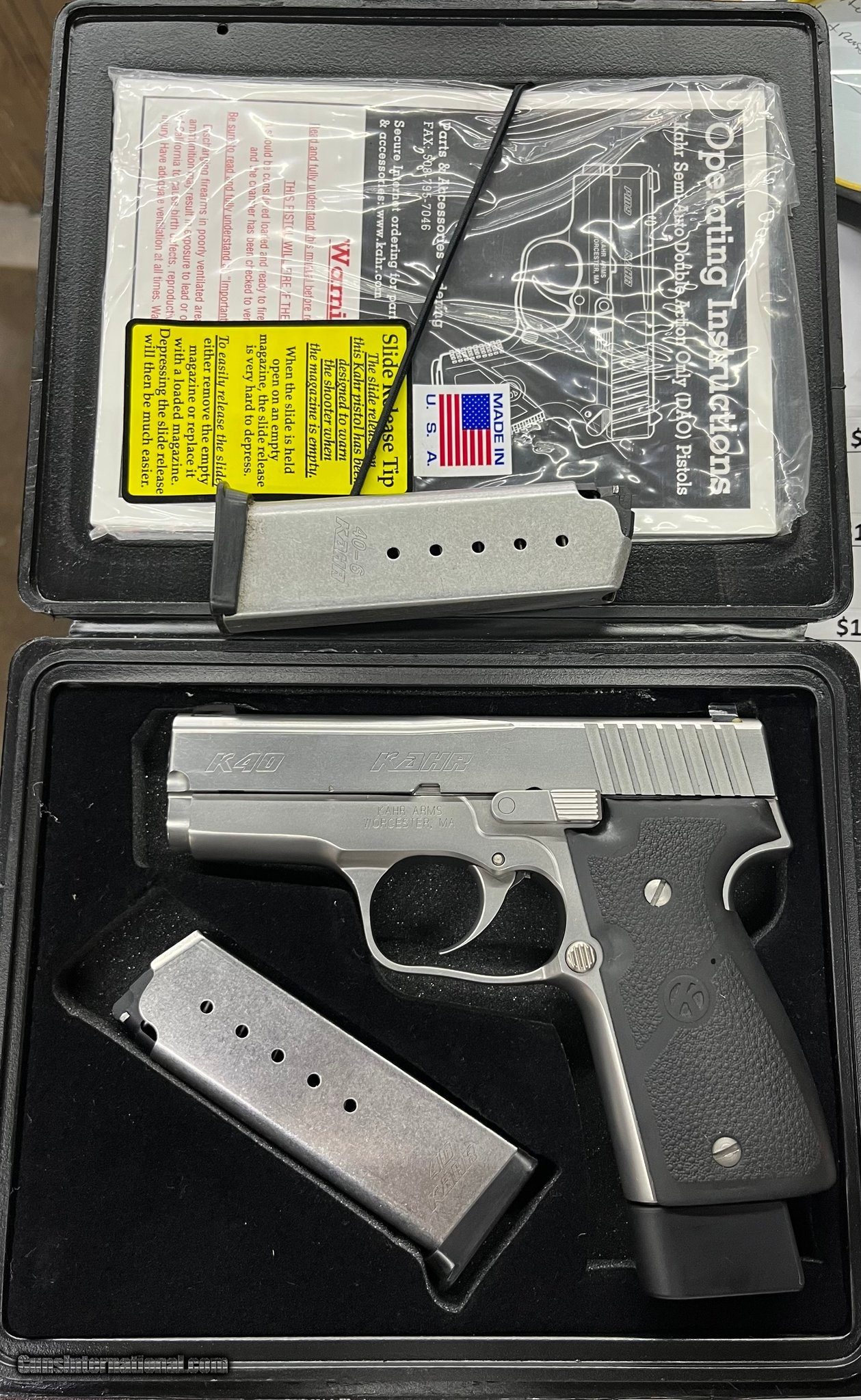 Description: Guns Listing ID: 560576 Comes with box & 3 magizines SOLD Manufacturer: KAHR ARMS Model: K40 Caliber Info: .40 CALIBER Condition: Used - Non-Certified Barrels: 3.5" BARREL Action: SEMI AUTOMATIC Finish: stainless |