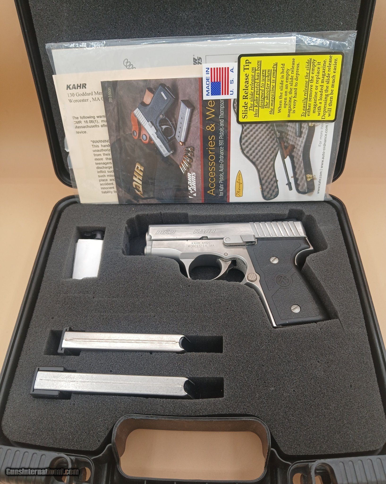 Description: Guns Listing ID: 548500 USED KAHR ARMS MK9. EXCELLENT CONDITION. FACTORY BOX & 3 MAGS. SEE PICS. SOLD Manufacturer: KAHR ARMS Model: MK9 Caliber Info: 9MM LUGER (9X19 PARA) Condition: Used - Non-Certified Barrels: 3 BARREL Action: SEMI AUTOMATIC Finish: STAINLESS Weight: 1.4 LBS. |
