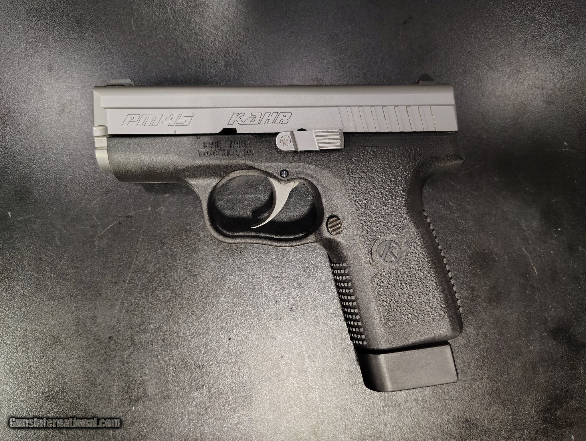 Description: Guns Listing ID: 532097 with original case and 2 magazines SOLD Manufacturer: KAHR ARMS Model: PM45 Caliber Info: .45 ACP Condition: Used - Non-Certified Barrels: 3 BARREL Action: SEMI AUTOMATIC Finish: stainless two tone |