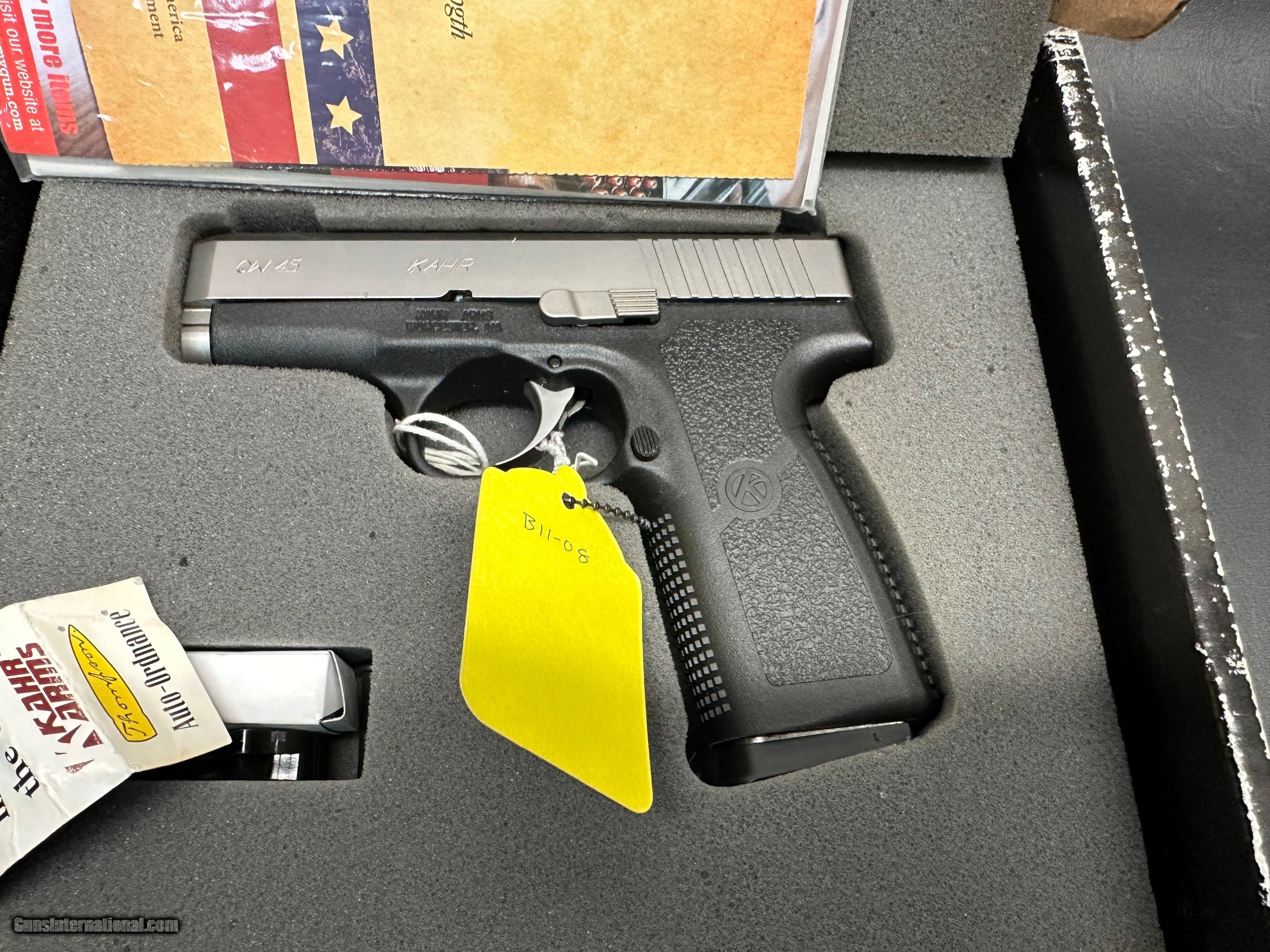 Description: New old stock Kahr 45 ACP Pistol Compact design with 6 rd magazine. 3.5" Barrel Stainless Steel slide and barrel. No Credit Card Fees 25.00 shipping SOLD Handgun Caliber: .45 ACP (.45 Auto) Manufacturer: Kahr Model: CW 45 Barrel Length: 3.5 Condition: New Old Stock Action: Striker Fired double action only Item Location: Buxton Maine |