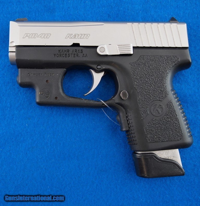 Description: Kahr PM-40 W-CTC .40 S&W, 3" bbl, bright shiny bore, good rifling, two white dot sights, CTC Red Laser, Stainless Steel slide, polymer frame, and one 5 round magazine. Add 3% for Credit Card Shipping $25.00 SOLD |