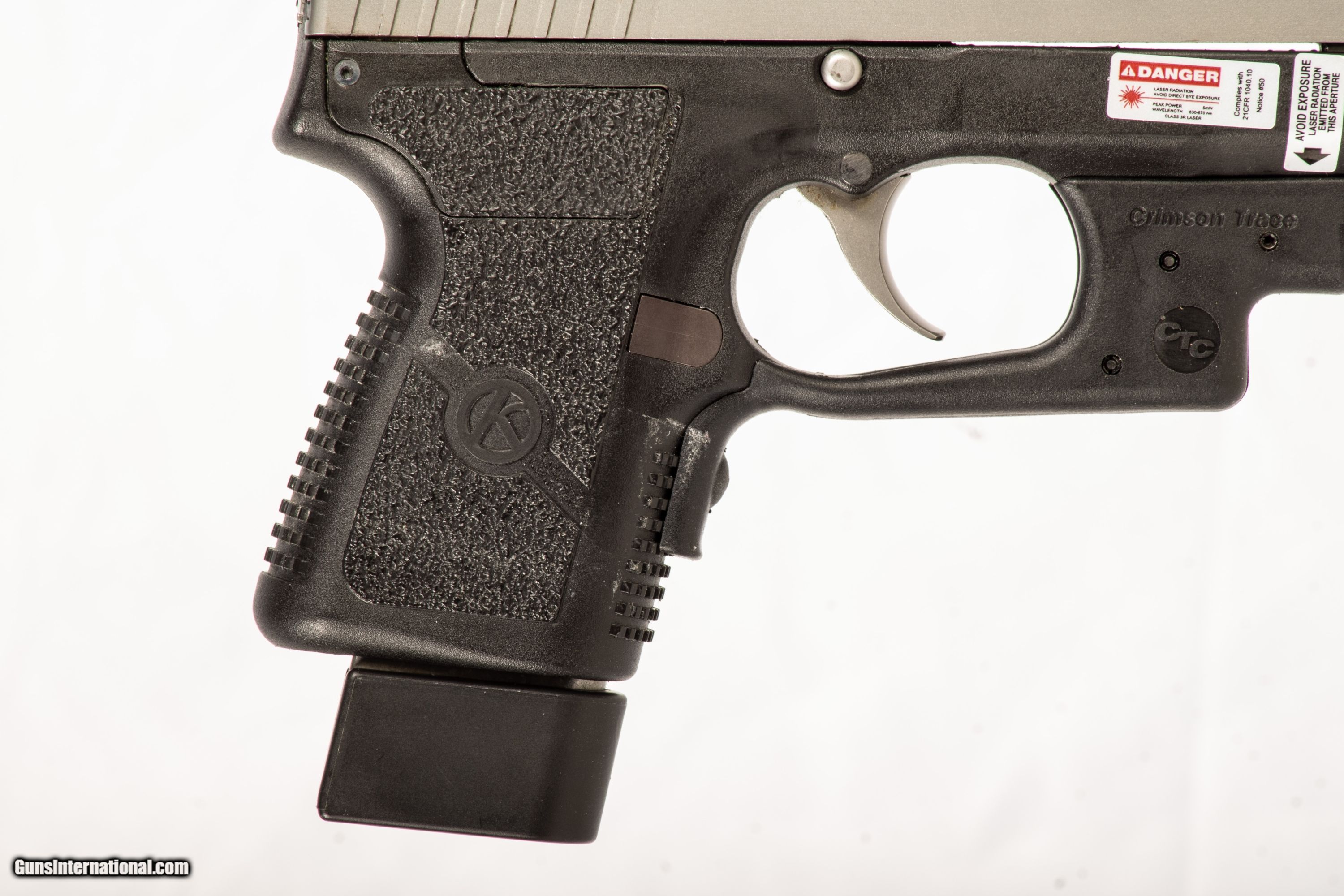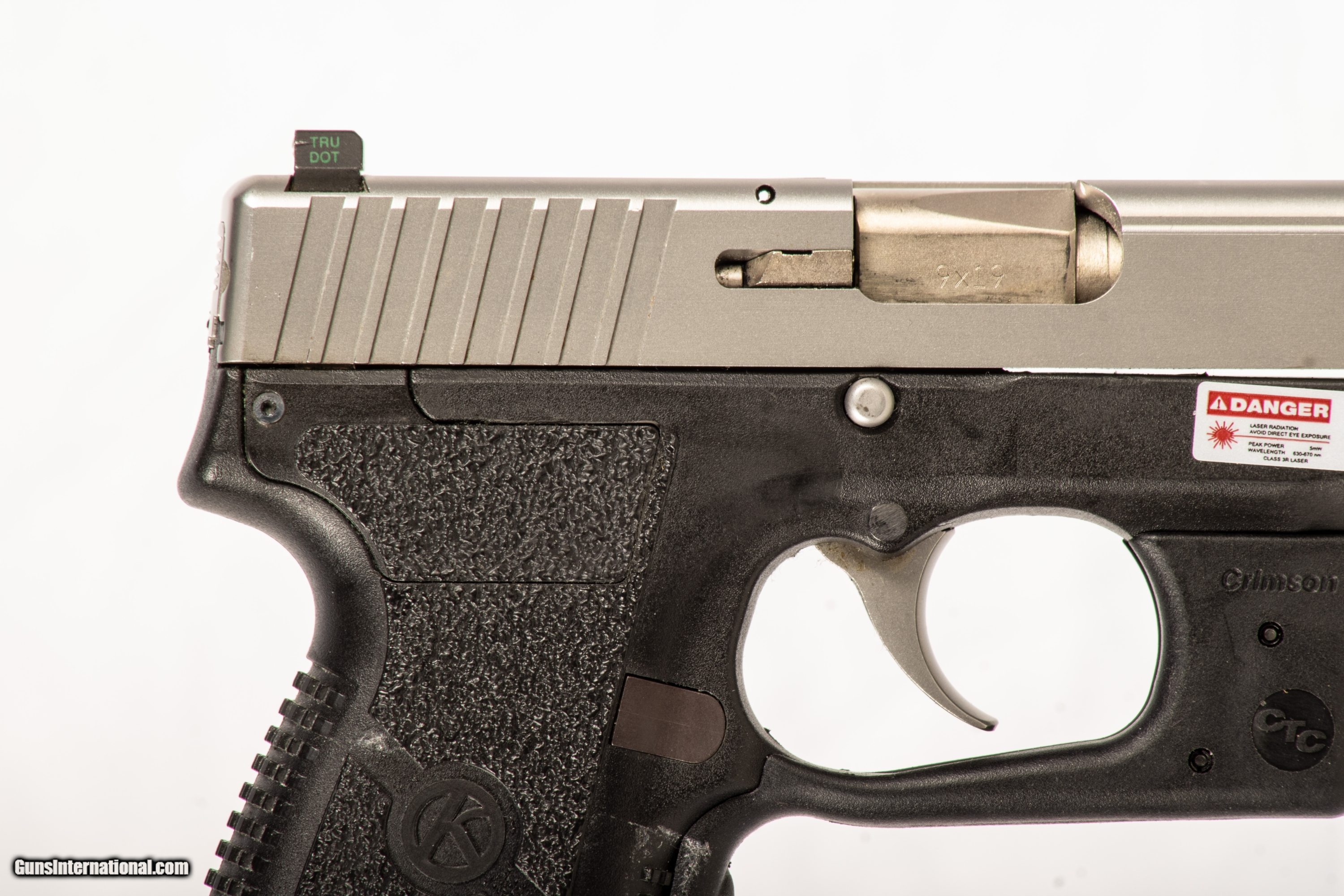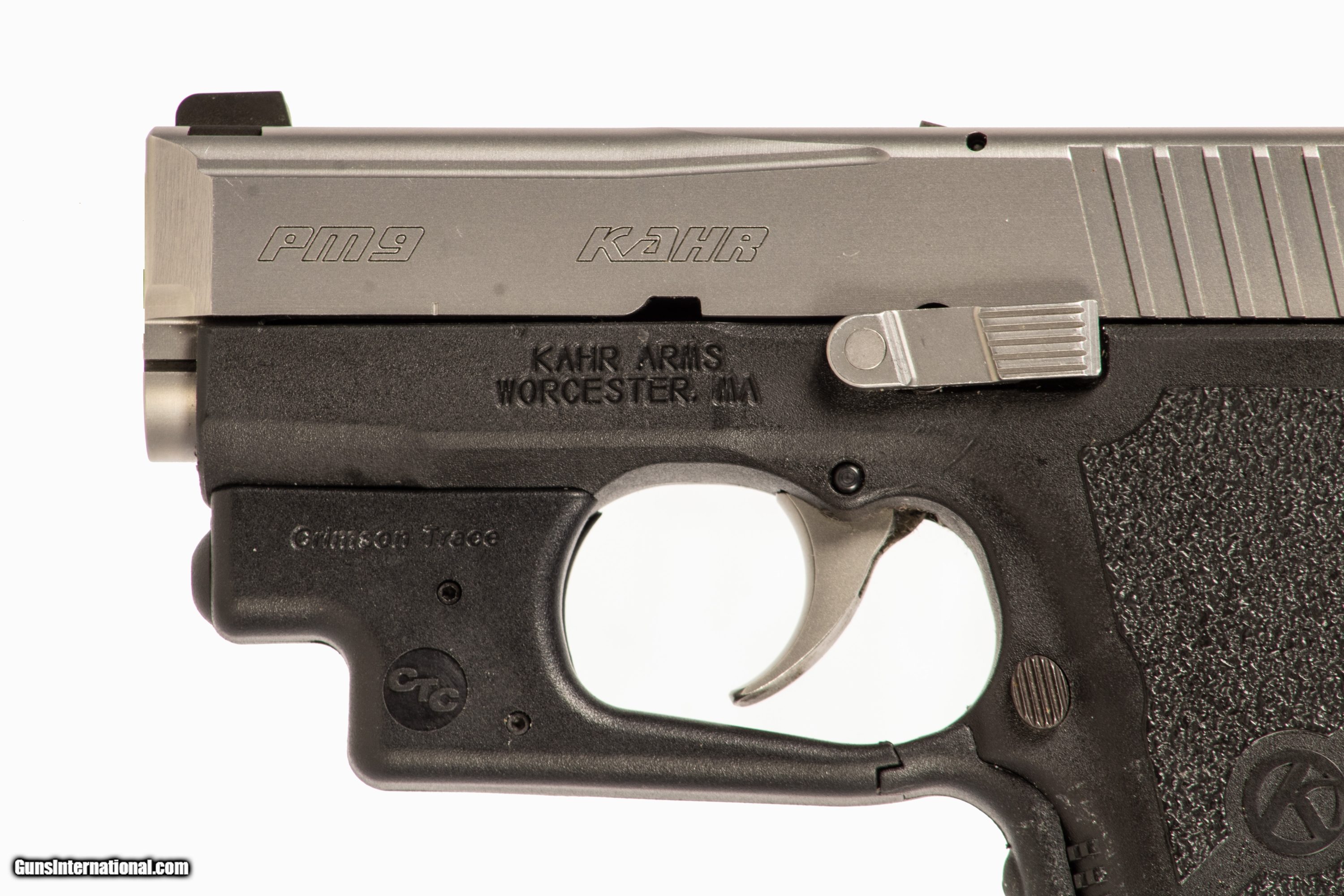 Kahr PM9 chambered in 9mm with a 3 inch barrel bright & shiny bore and a crimson trace laser. This gun is in good condition and is covered by Dury's Lifetime Warranty.