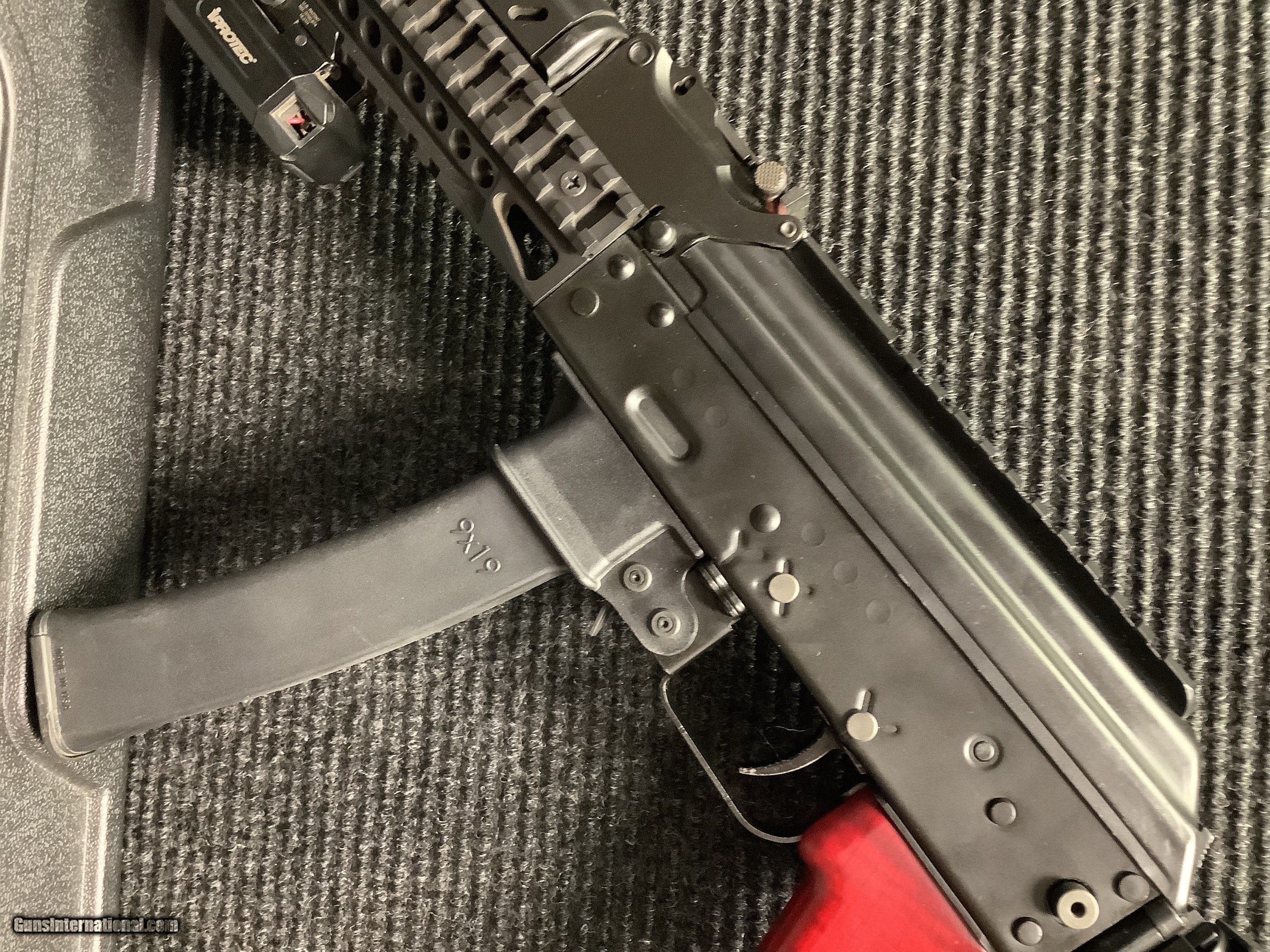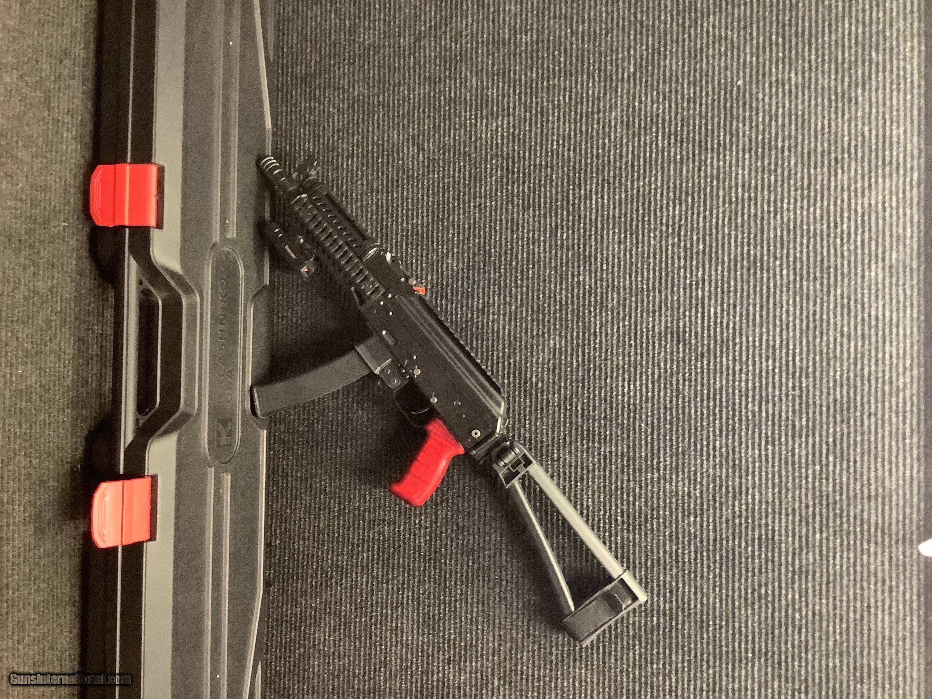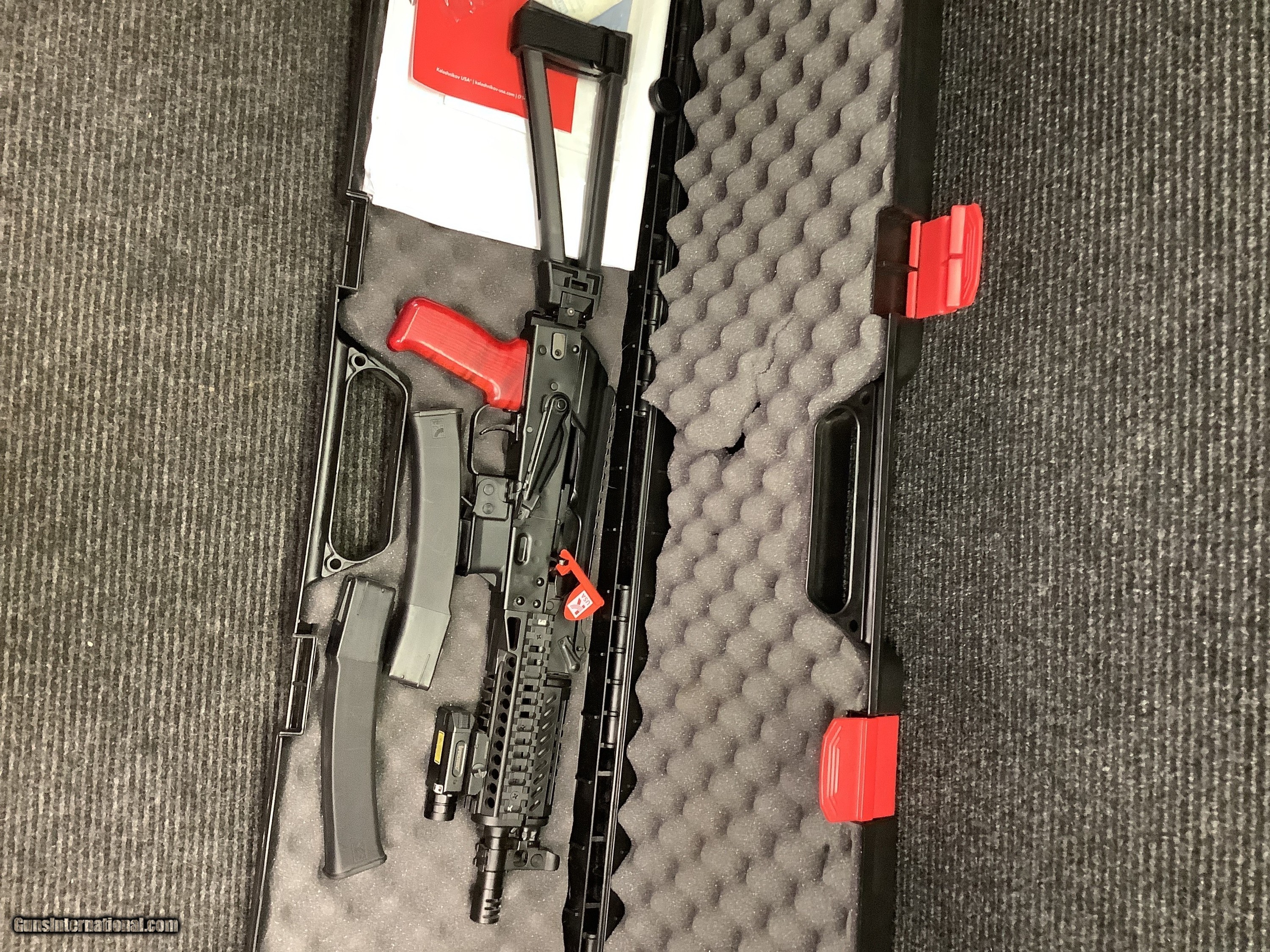 Description: Up for sale is a Kalashnikov K9 chambered in 9mm, featuring a red wood handle and SB Tactical brace with a laser/light attachment. It does come with two magazines. With a barrel length of 9.25" this is a very fun sub-gun to enjoy at the range. The K9 is an easy-to-operate AK-style pistol that works on a blowback operating system. It is chambered in 9×19mm with a barrel length of 9.25″ and accepts 30 and 10 round Kalashnikov USA™ magazines. The K9 comes ready to be easily converted into a short-barreled rifle (SBR) with a hinge block and a quick detach mount at the rear of the receiver if you choose to use a brace or a buttstock with it.* *You can enjoy shooting your K9 in pistol configuration while awaiting approval from the Bureau of Alcohol, Tobacco, Firearms and Explosives (ATF) to convert it into a short-barreled rifle (SBR). Credit card accepted but does not qualify for 3% cash discount (price ends for). This item can only be shipped to and remain in the USA. We will NOT ship to US territories, APO/FPO addresses, or freight forwarding companies located in the USA. We only sell to US citizens and only ship to the CONTIGUOUS United States SOLD Handgun Caliber: 9x19mm Parabellum (9mm Luger, 9x19mm NATO) Manufacturer: Kalashnikov Model: K9 Serial Number: K90006485 Barrel Length: 9.25” |