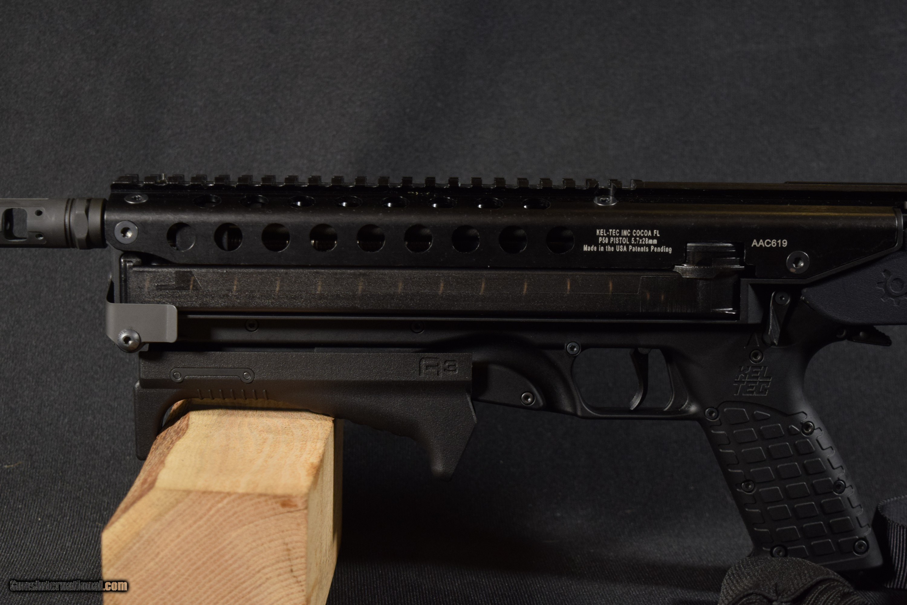 Description: The Kel-Tec P50 doesn’t come with a white Ferrari and salmon blazer, however it does come with some other amazing features including two 50-round magazines. This 5.7x28mm chambered handgun is sure to gather props from your buddies and range rats alike. Picatinny-style rails and QD mounts offer plenty of real estate for accessories to meet the needs of the job at hand. Don’t let the small size fool you. This little KelTec pistol is a tack driver. The 5.7 cartridge comes in several variants from sporting to hunting to serious personal defense. Protective details around the world utilize its efficiency while sport shooters and hunters love the cartridge for its accuracy and distance capabilities. This item come's with a case and 2 magazines. Overall condition is great with some minor wear to the item. Pre-Owned - Kel-Tec P50 5.7x28 9.6"
