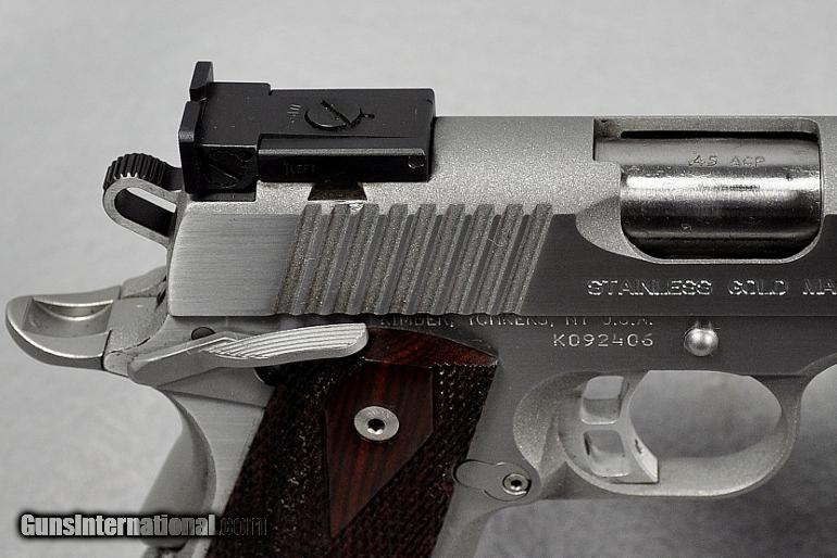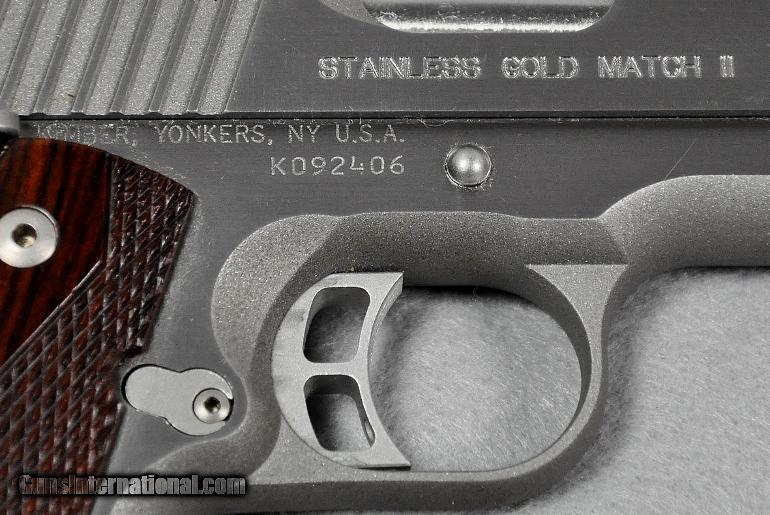 Description: Kimber, semi-automatic pistol, Model Gold Match II, caliber .45 ACP, s/n K092406, Five inch (5") STAINLESS STEEL MATCH BARREL AND BUSHING with bushing tool, finish is brushed stainless steel on sides of slide and frame and top of slide and bottom of frame bead blasted, there are a couple of very minor insignificant storage marks in finish which could be easily polished out by a professional such as the factory custom shop, sights are adjustable micrometer rear and ramp front, condition of bore is MINT, FEATURES: serrated slide front & rear, THREE MAGAZINES, skeletonized PREMIUM MATCH GRADE trigger and hammer, ambidexterous safety, BEAVERTAILTHUMBREST, cross hatched arched mainspring housing, HAND FITTED MATCH BARREL BY KIMBER CUSTOM SHOP, INCLUDES A FACTORY KIMBER .22 RIMFIRE TARGET CONVERSION KIT WITH TWO (2) .22 MAGAZINES, fantastic fully loaded rig, Retail value $1300 plus, Sale priced at $1095. We have been in business for 7 years under the same ownership and selling guns for 41 years. We are receiving SEVERAL e-mails daily. All buyers are taken on a strict first come-first served basis depending on the date and time we receive their e-mail. We strive to describe all of our sale items accurately and fully and include professional quality photos of each item. We do our best to point out negatives (if any) regarding a sale item. Although we offer a 3-day, no questions asked, return policy it has rarely been used the entire time we have been in business. The first potential buyer who states that he definitely wants an item gets it. Those having questions who do not commit to purchase in their first inquiry will have their questions answered but may lose the sale if another buyer e-mails after they do and commits to purchase before we can get back to the first inquirer. This happens almost daily and disappoints a lot of people. If you see something you want- commit to buy it. You will not be disappointed. We cater to first time GI buyers. You can purchase from us with total confidence. We will guide you through the purchasing process if need be. We add guns and gun related items to GI virtually every day. Want to visit a gun show right on your computer? It as simple as 1, 2, 3. 1) Go to the Guns International homepage. 2) Look UNDER the search box on the homepage and CLICK DIRECTLY ON THE WORDS Advanced Search (Help!), 3) Type Bonnie's guns into the Sellers Screen name box and click on the Search box at bottom of screen. All of the guns and related items we currently have listed on GI will come up with photos and complete descriptions that are available for purchase right now. We keep our ads current. This stuffs for sale immediately. No fooling around trying to beat out other people. No stupid fees. Who has the time and money for that? That's the beauty of GI. Tell all your friends. USA sales only including California. Thank you SOLD |