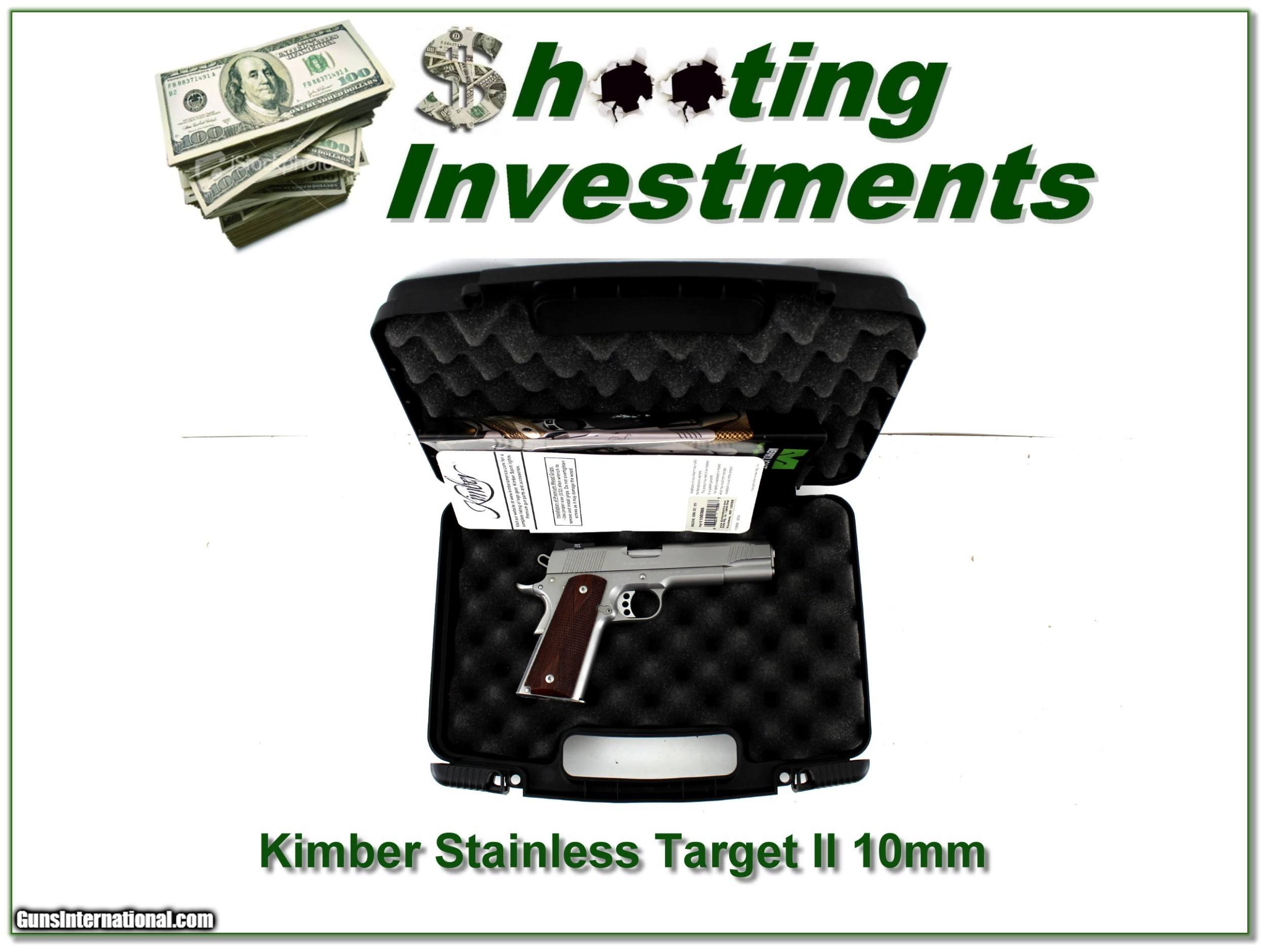 Description: This is a new in the case Kimber Target II Stainless in the harder to find 10mm. It comes as seen in original case with all papers. Shipping and insurance is $39. Please email me with any questions or larger pictures. (Consign your quality firearms with Shooting Investments for only 12%! Let me know if you have any you would like to sell!) 22-0876 Payment: Payment is by Money Order, Cashiers Check or Personal Check. I can now also accept Credit Cards (MasterCard, Visa, Discover & American Express) with a 3% convenience fee. Shipping: The shipping charge will be listed in each description. It is $49 for most long guns. Some heavy guns, over 48in boxes or those insured for over $2000 will be higher. Shipments to Alaska and Hawaii are higher because air shipment is required. Most firearms are shipped on Tuesday and Thursday and usually in 5 days of receipt of payment. We package all shipments carefully and insure them. Optics are shipped Priority Mail and most other non-firearm shipments are shipped First Class. Returns: Our return policy is simple. If for any reason you are not pleased with your purchase, you may return your item for a full refund of purchase price. Ammunition cannot be returned. It is important to us that you are happy. Guns cannot be fired or dissembled before returning them and they must be returned in the same condition as received. Notification of a return must occur with-in 3 days of receipt at your dealer. Shipping, convenience and dealer fees are not refundable and are the responsibility of the buyer. Lay-a-way: If needed, we offer a 60 day lay-a-way option on most firearms. It is 1/3 now, 1/3 in 30 days and 1/3 in 60 days. Lay-a-way firearm sales are final and if not completed the first payment cannot be returned. Consigning your firearms with Shooting Investments: We will help you get top dollar for your firearms. While most local guns shops charge 20% or more, our fee is only 12% with a minimum of $75. At your local gun shop it might take months to sell. Selling on-line provides instant access to thousands of interested buyers. You won’t find any other on-line dealer willing to sell your firearms for only 12% or listing every gun on 3 separate s. Selling through an House typically costs the seller 15% and the buyer an addition 15% (so 30%) and you have to wait several months to sell and longer to receive funds. If properly priced, we will sell your firearms in a few weeks. Send us an email or give us a call and we’ll explain how easy it is for you to get top dollar. Trading: Trading for use is really just buying your gun to re-sell. If you have a gun you want to trade, please email a picture and we will let you know what we can give or it. You will always get more if we sell it for you on consignment. Help for California Buyers: We are happy to ship to California. It is the buyer’s responsibility to make sure any item you buy is legal in your state. We are also happy to help with your purchase of a firearm from someone other than us. If you see a gun you would like to buy but the seller can’t or won’t ship to California they can ship to use and we’ll then ship it to your California dealer. The cost for this service is only $30 + shipping. Let us know if we can help! SOLD |