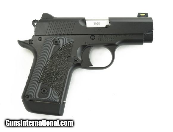 Description: Kimber Micro 9 9mm caliber pistol. Pocket pistol with black finish. Has fiber optic sight and extended magazine. Excellent condition with box.