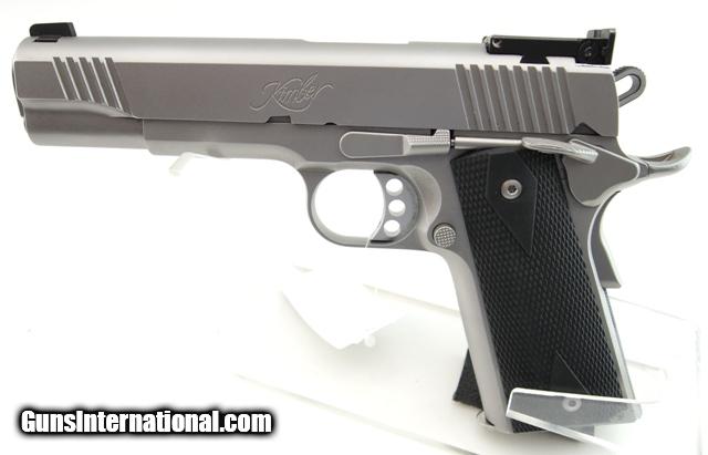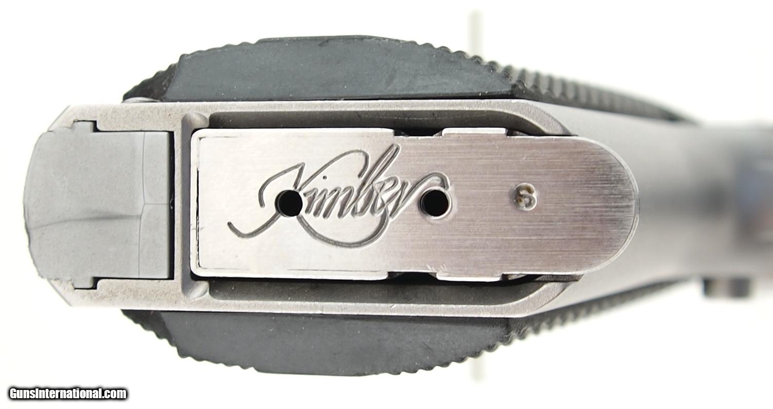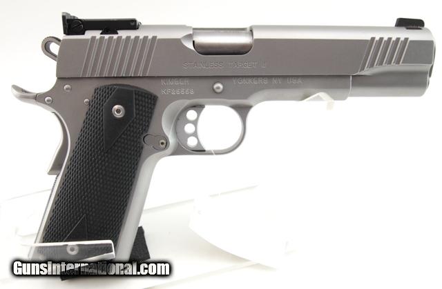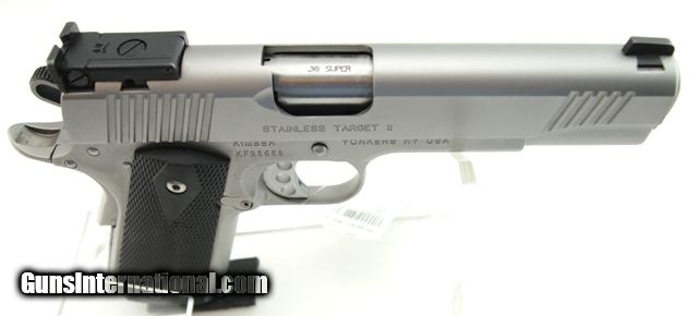 Description: Kimber, Stainless Target II, 38 Super, 5" bbl, shiny clean bore, good rifling, stainless finish, adjustable target sights, checkered mainspring housing, front cocking serrations, skeletonized hammer and trigger, extended beaver tail safety, and textured black grips. Add 3% for Credit Card Shipping $25.00 SOLD |
