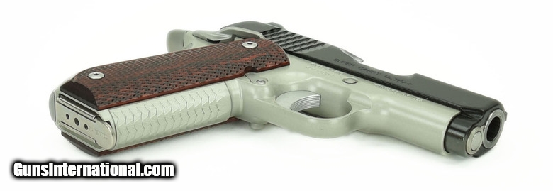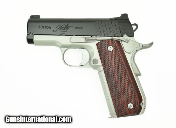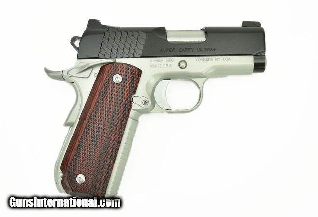 Kimber Super Carry Ultra .45ACP caliber pistol. 3” custom carry gun with a full size grip. It has a 2-tone finish, night sights, and a round butt grip frame. It comes with a box and is in excellent condition.