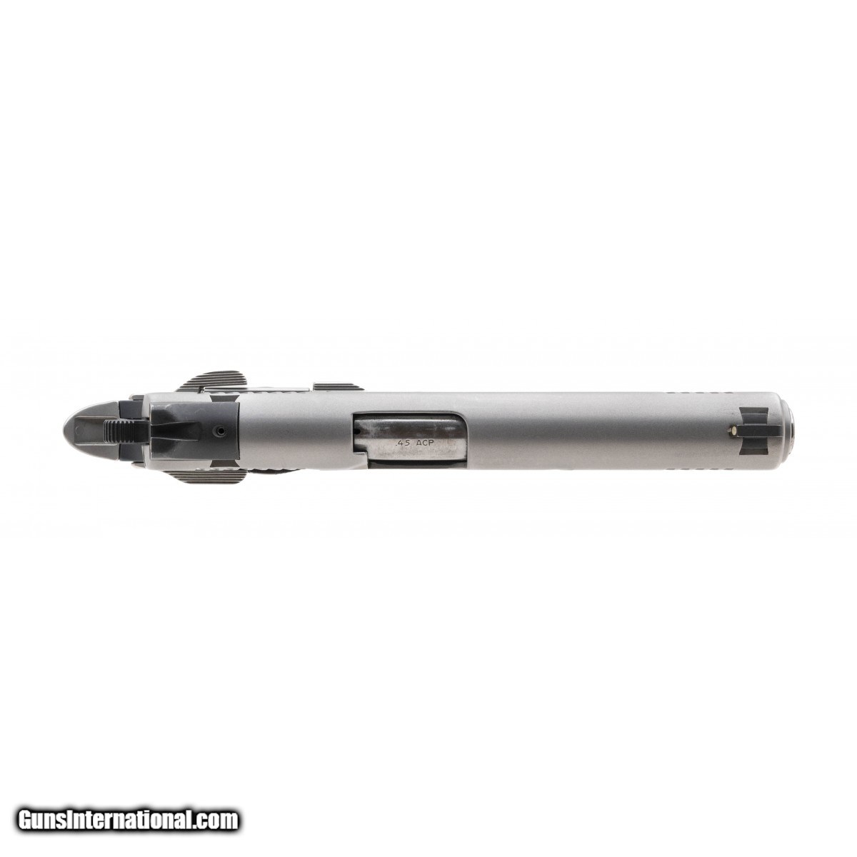 Description: " SN:K148707. Modern production, .45ACP with a 5"" barrel. Bore is excellent condition. Two-tone handgun with Novak style night sights, front-rear serrations slide, wood grips and manual ambidextrous thumb safety. Overall Condition is in very good. SOLD |