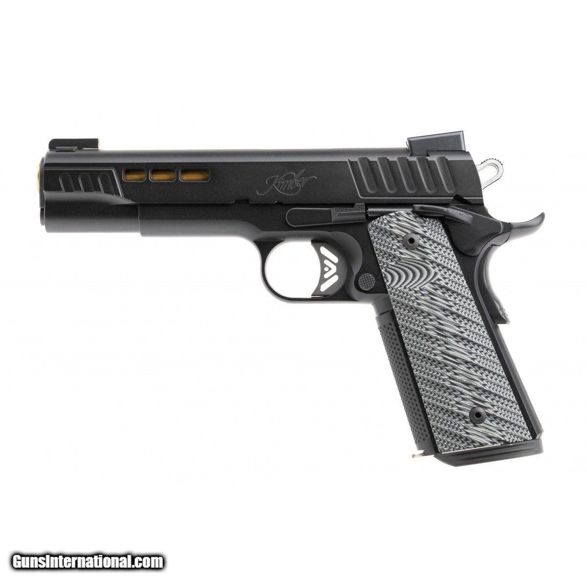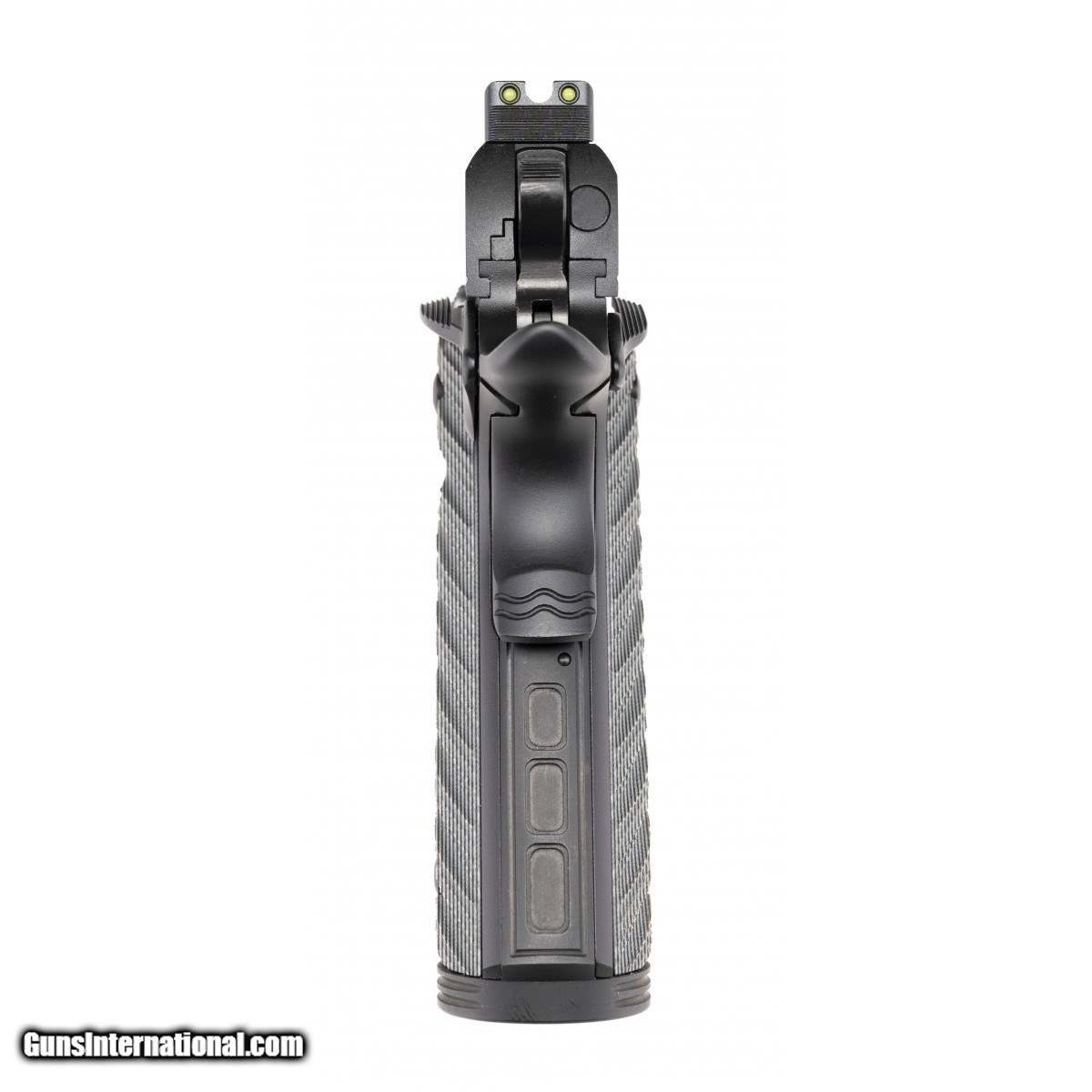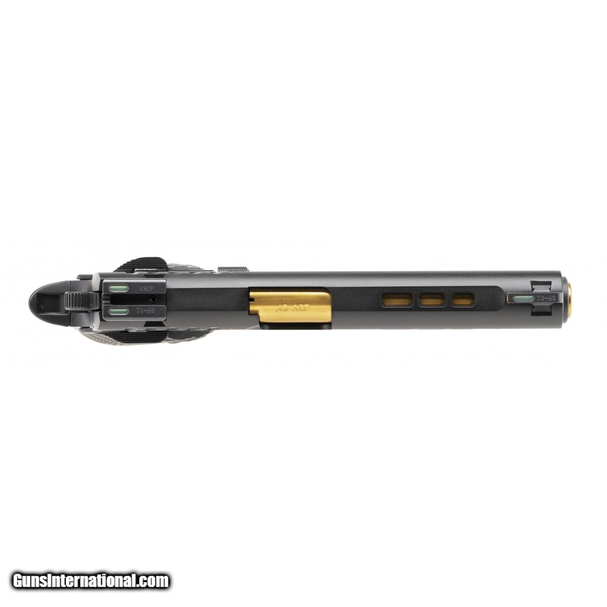 Full size model with slide cuts, TiN coated gold barrel, magwell, fiber optic night sights, and grey grips. Comes with box and is in excellent condition.