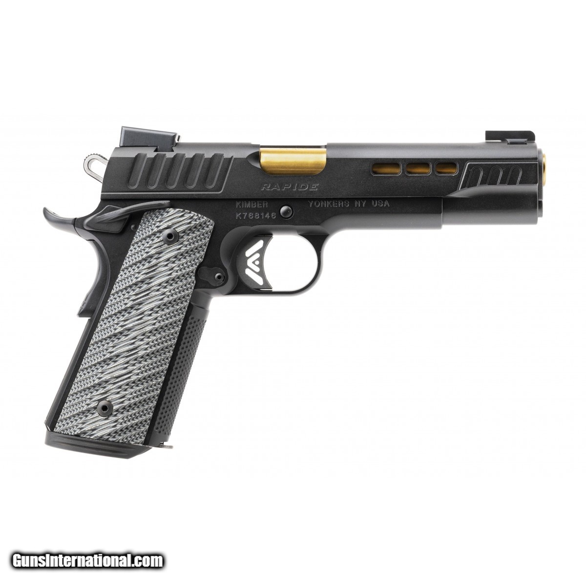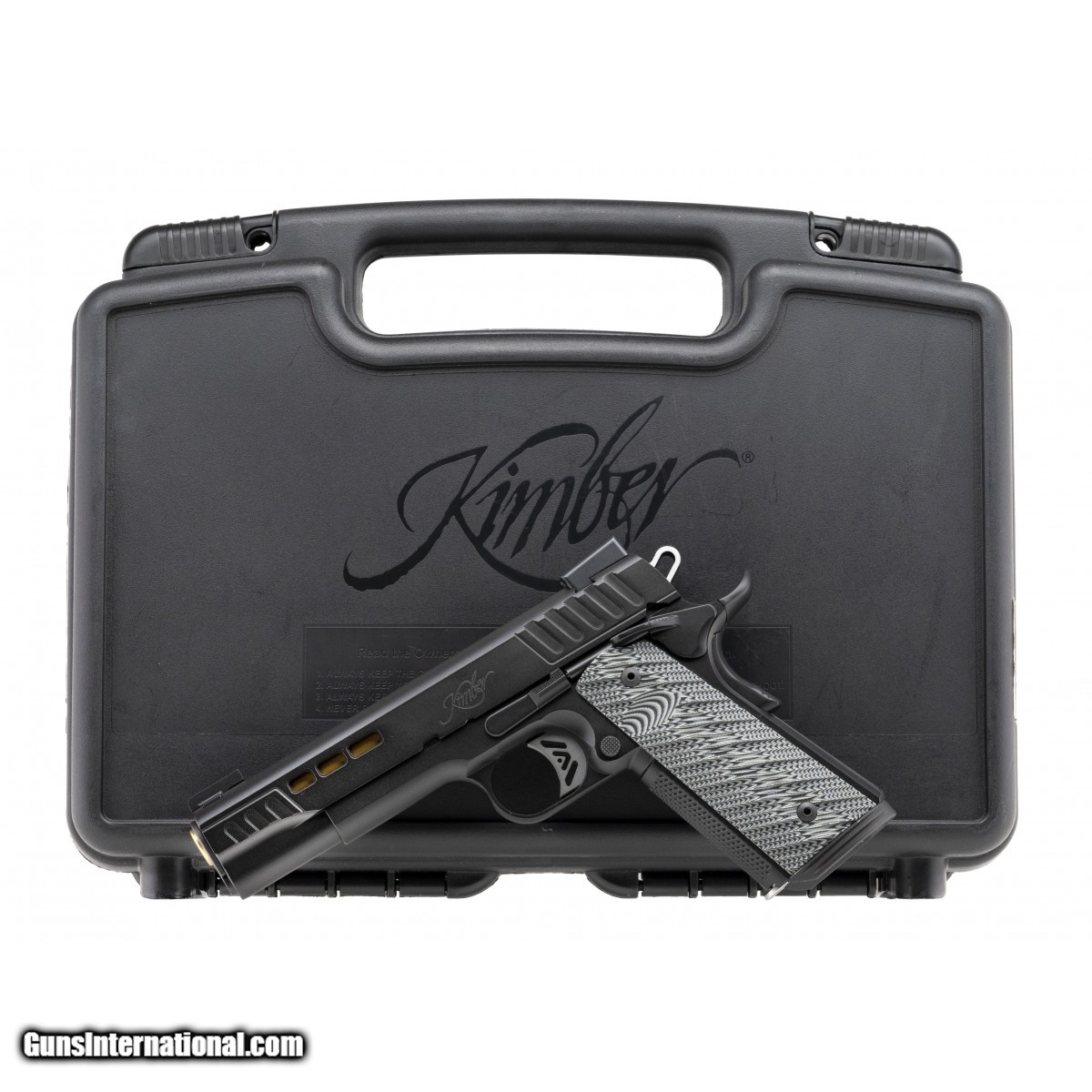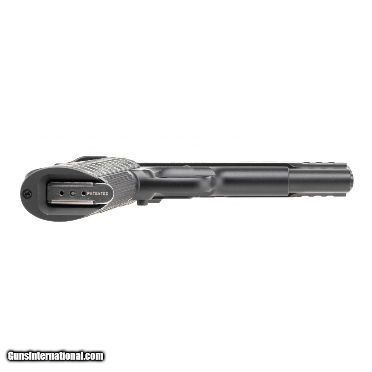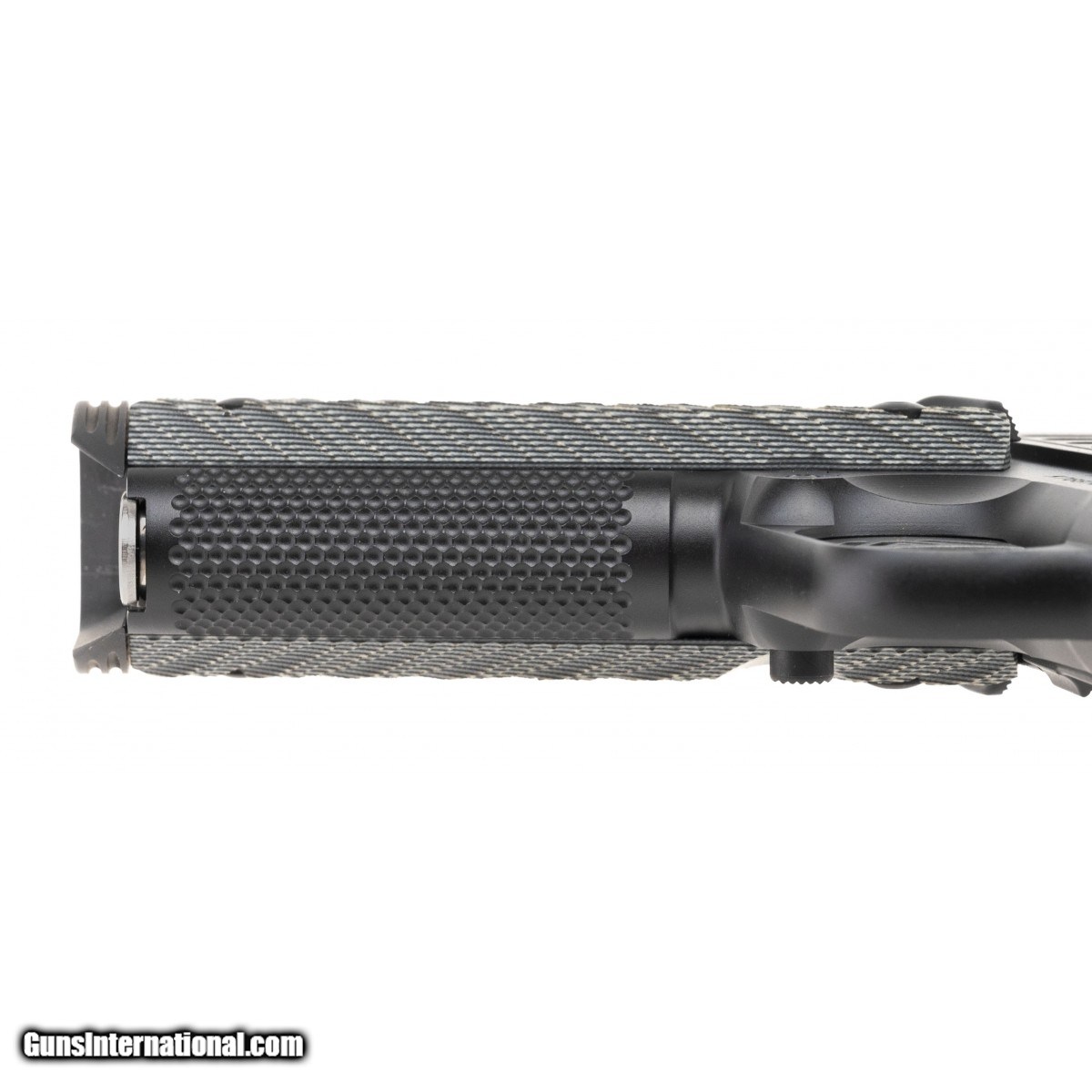 Full size model with slide cuts, TiN coated gold barrel, magwell, fiber optic night sights, and grey grips. Comes with box and is in excellent condition.