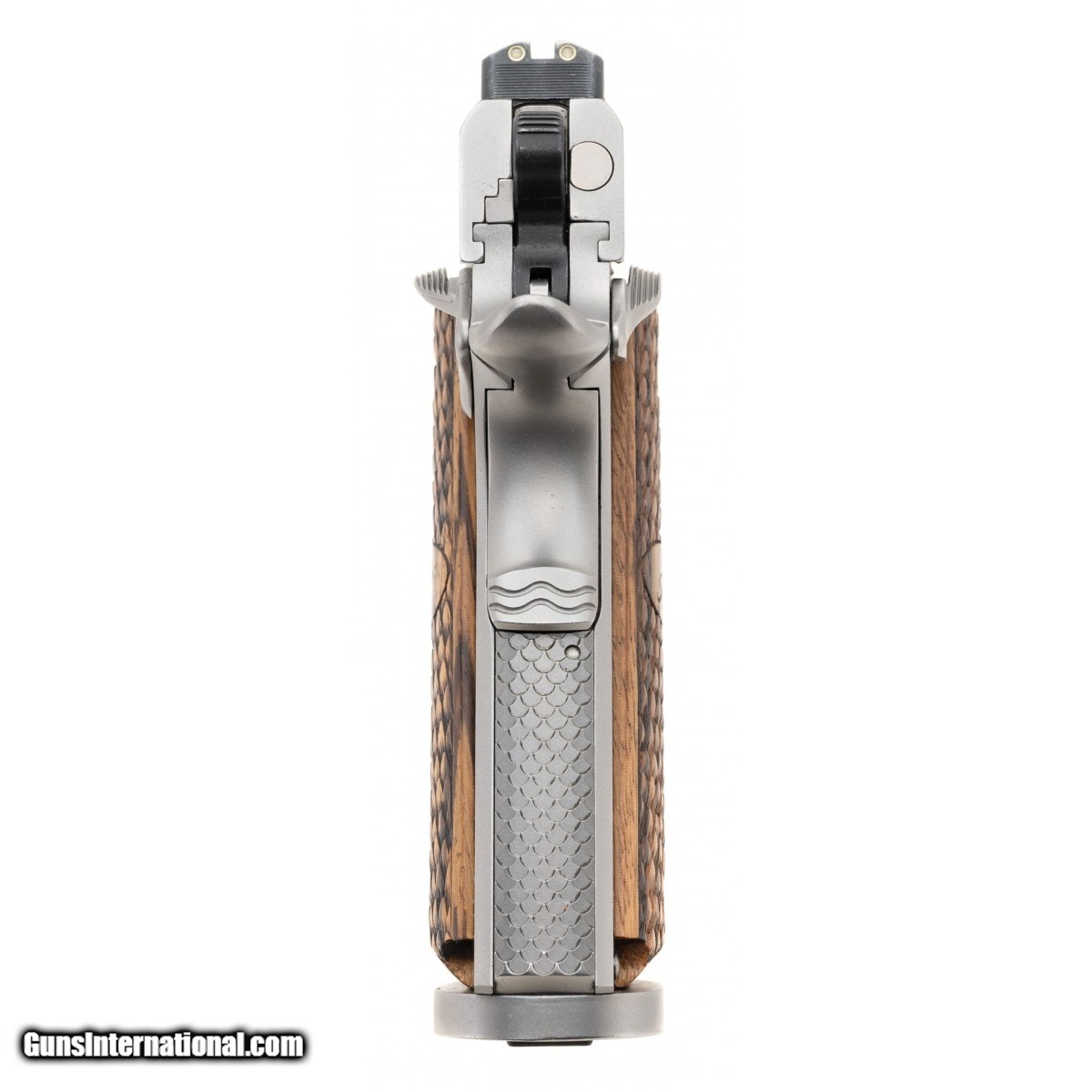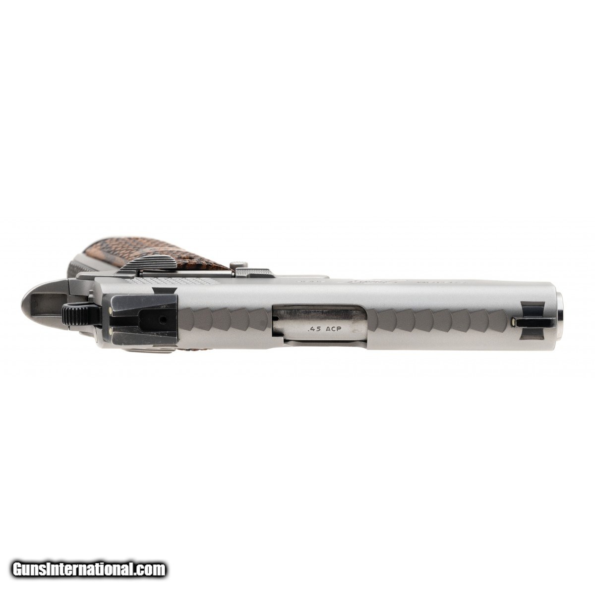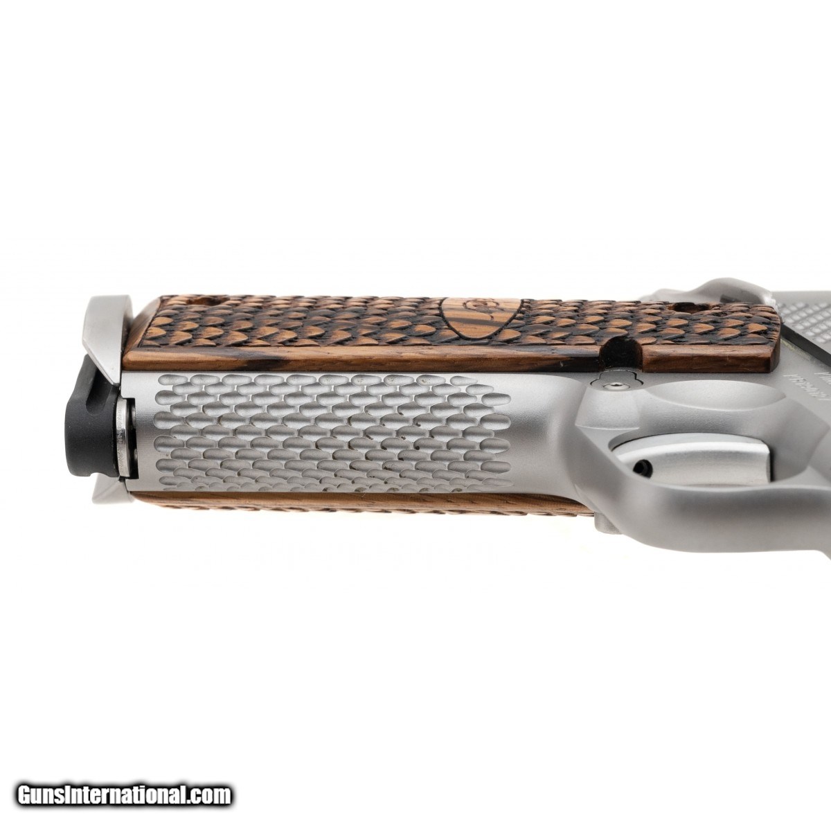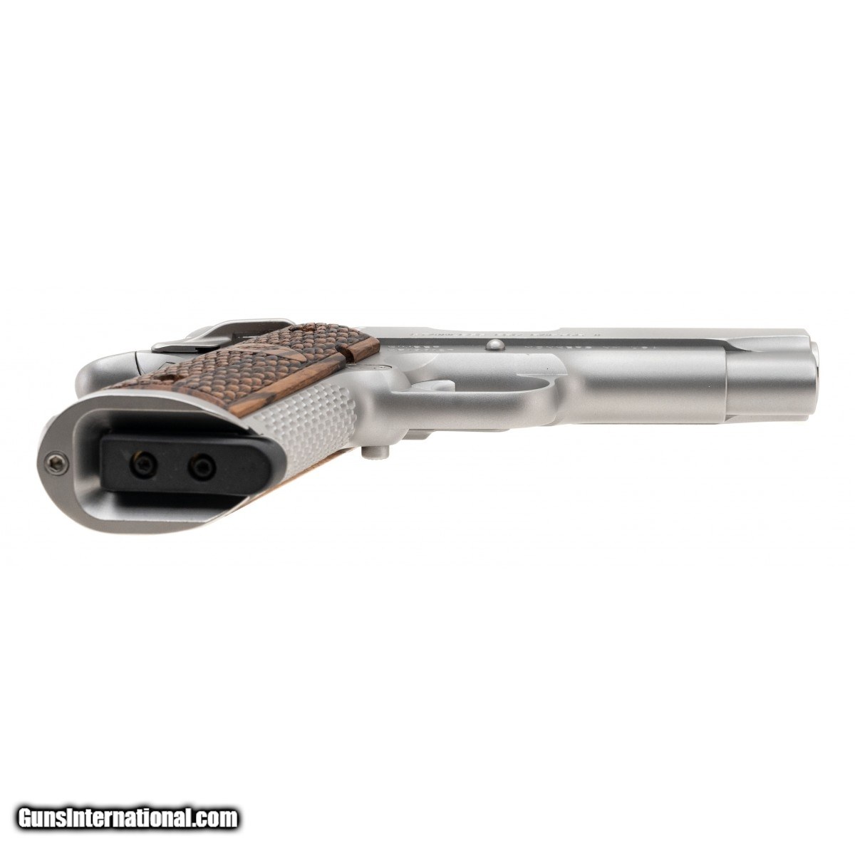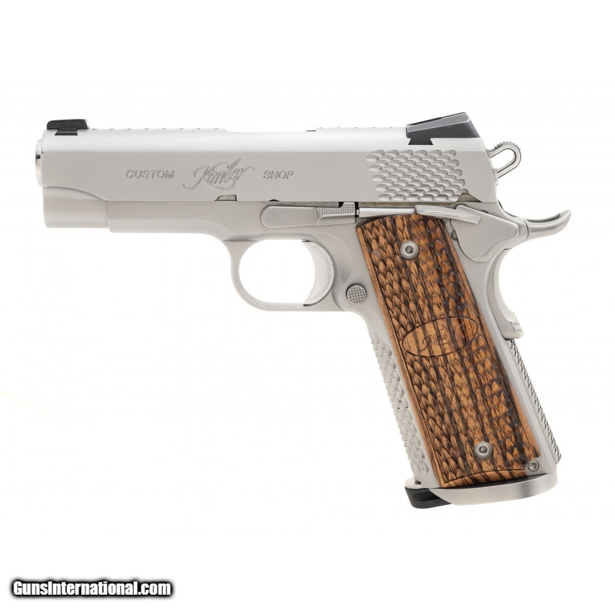 Description: "SN: KR190127. Modern production. .45ACP with a 4"" barrel, bore is excellent. Compact 1911 handgun with stainless finish, night sights, ambidextrous safety and scale pattern wood grips. Overall excellent condition. Comes with box, extra magazine and laminated wood grips. SOLD |