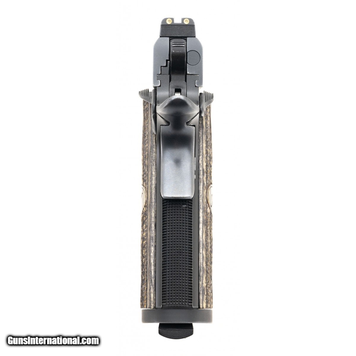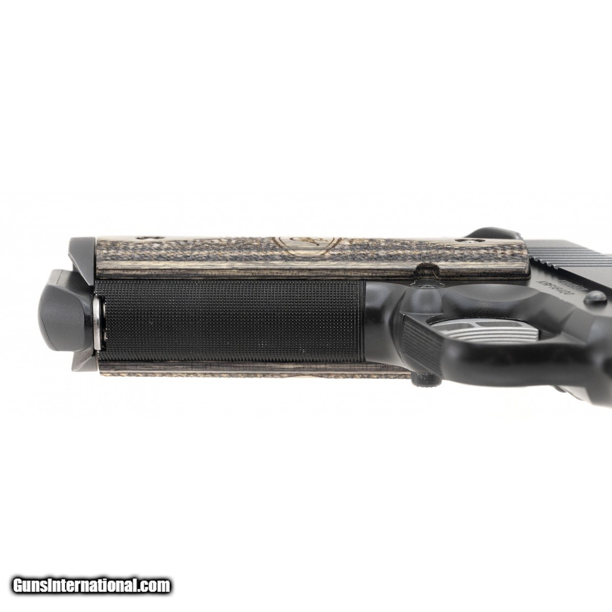 Description: " SN: KRF15420. Modern production. 9x19 parabellum with a 4"" barrel, bore is excellent. Compact 1911 handgun with alloy frame, charcoal gray finish, night sights, ambi safety and laminated wood grips. Overall excellent condition. Comes with box, extra magazine and spare wood grips. SOLD |