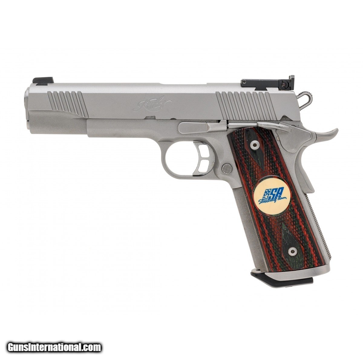Description: " SN: K099781. Modern production. .45 with a 5"" barrel. Bore is excellent with strong rifling. Brushed stainless 1911 with USA shooting team grips in very good condition. Overall very good condition with light handling wear noted on the slide. Consignment. SOLD |