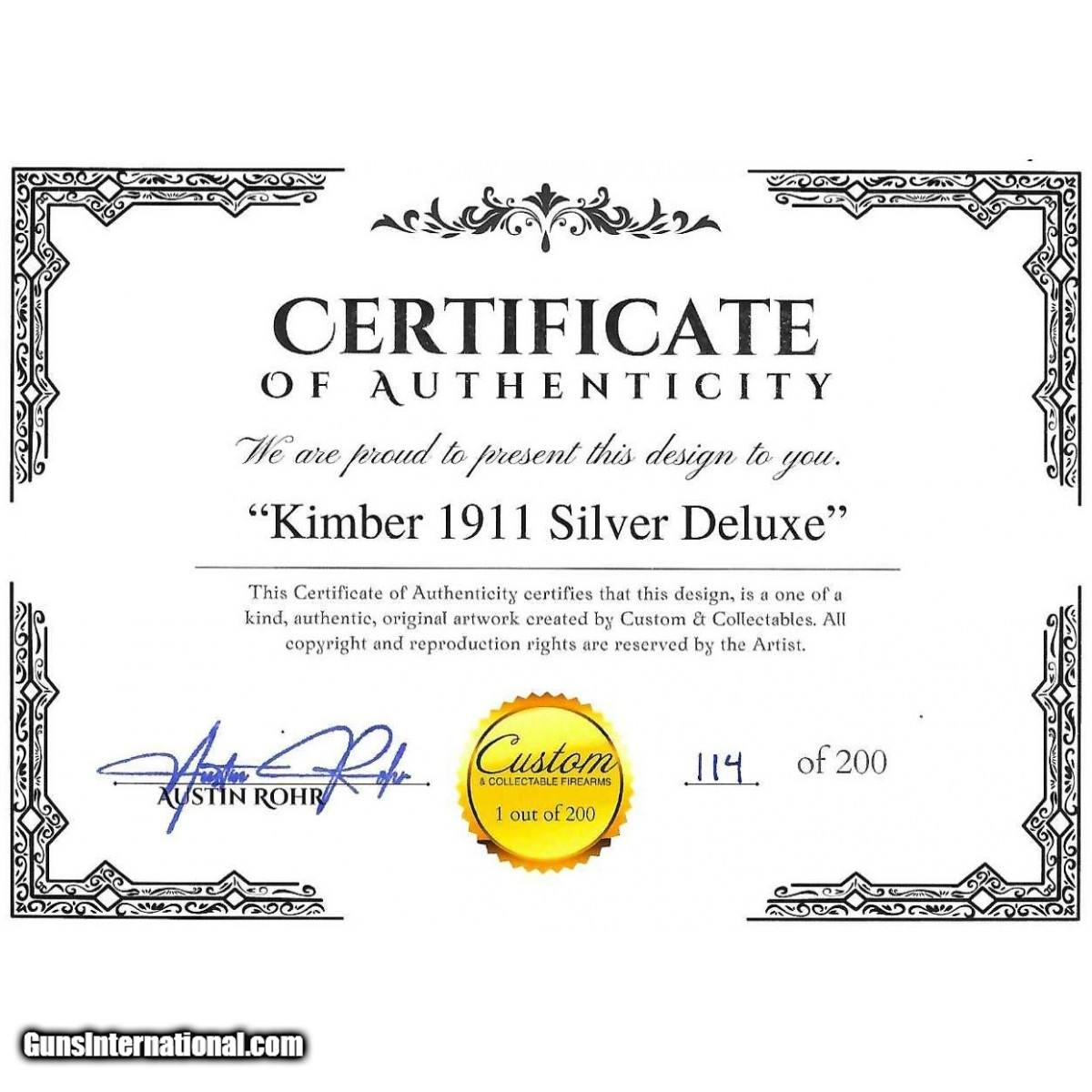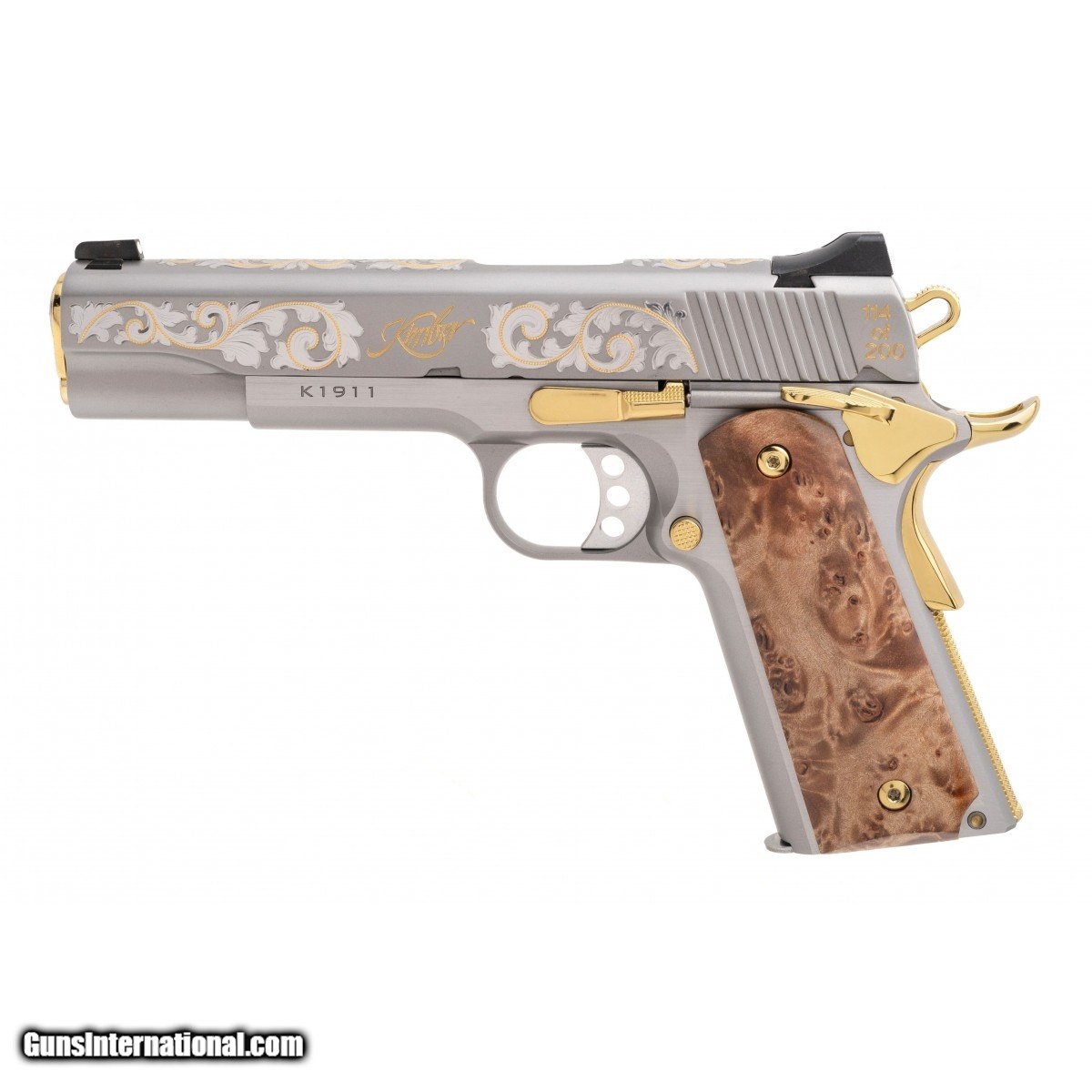 Custom & Collectable Kimber K1911 Stainless Deluxe Pistol. .38 Super with a 5"" stainless barrel. 1 of 200 made (114) 1911 pistol with 24K gold inlay and Natural Maple Burl Grips.. New. UPC: CNCSILCLASS38