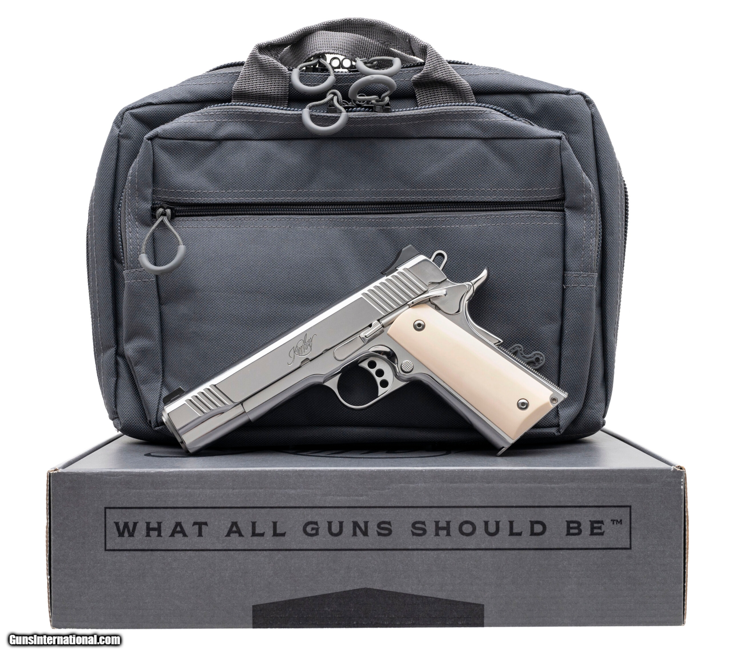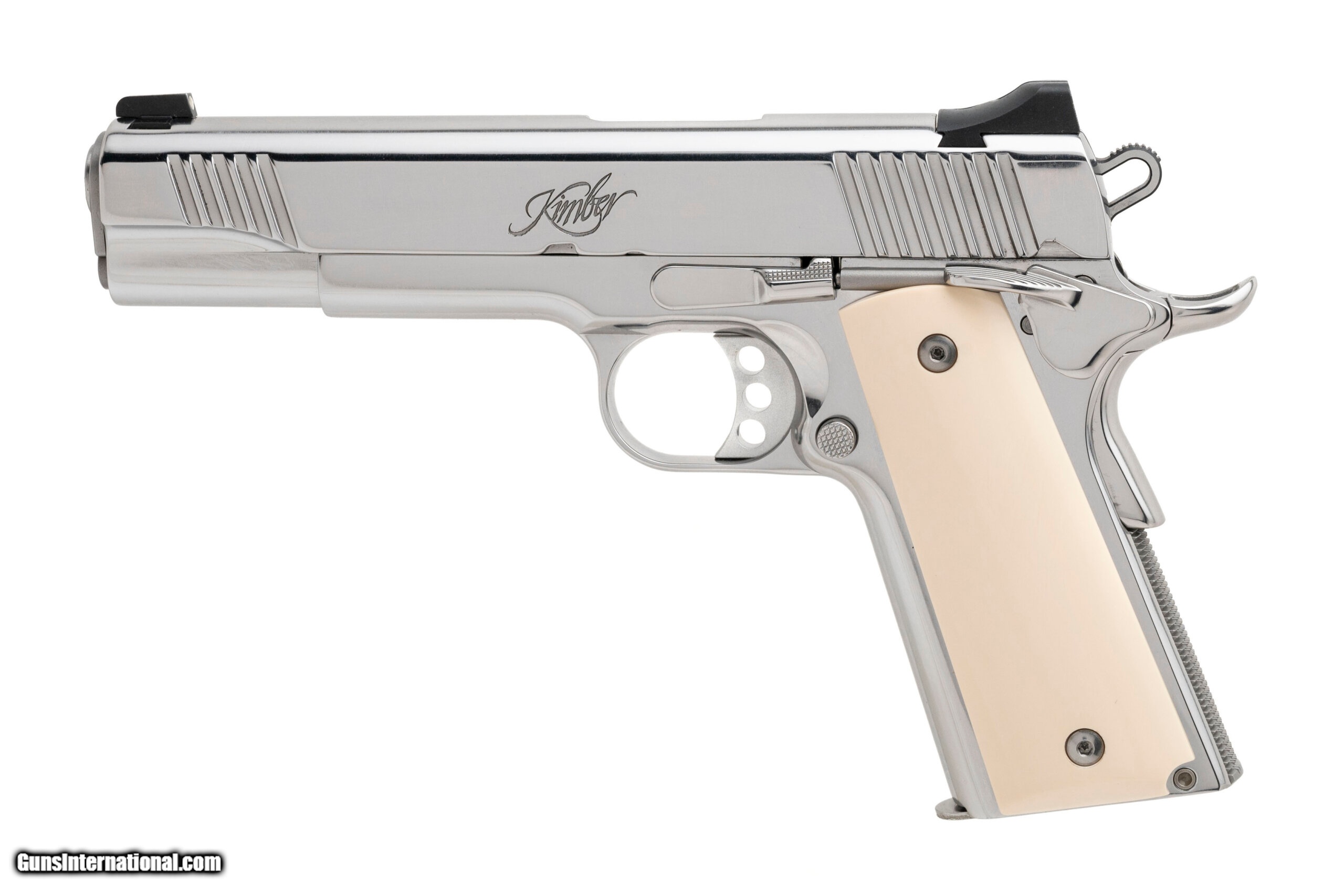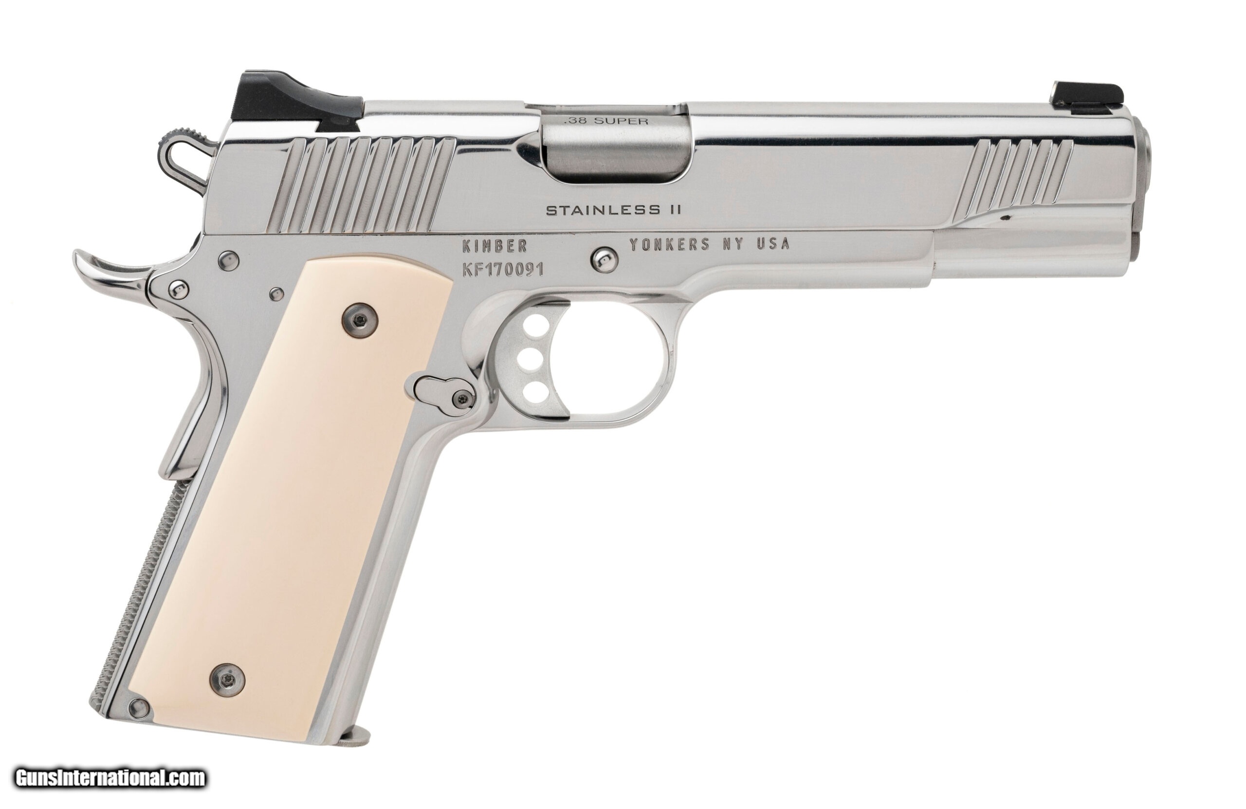Description: "Kimber Stainless II 1911 Pistol. .38 Super with an 5 barrel. Government 1911 pistol with an High Polished Stainless Steel frame, G10 ivory grips, and night sights. New. UPC: 669278323978 (STOCK PHOTO) SOLD |