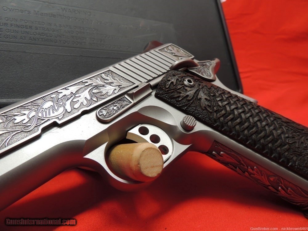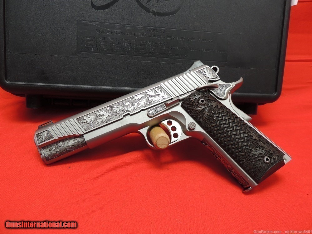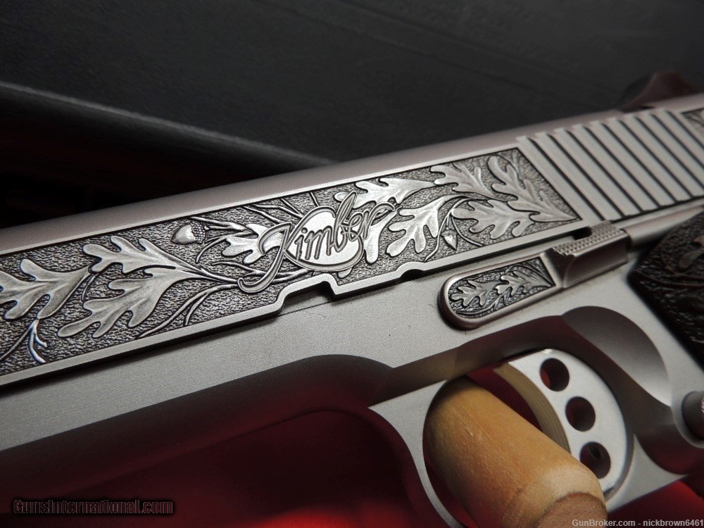 Description: Guns Listing ID: 861321 CUSTOM ENGRAVED KIMBER 1911 STAINLESS II IF YOU ARE LOOKING FOR A BEAUTIFUL ENGRAVED 1911 FOR YOUR COLLECTION WE HAVE THE PERFECT FIREARM FOR YOU! THIS PEICE WOULD LOOK GREAT IN THE SAFE OR ON DISPLAY IN YOUR GUN ROOM. THE PERFECT GUN TO OWN TO HAVE BRAGGING RIGHTS WITH ALL YOUR GUN LOVING FRIENDS! Specifications Specifications and Features: Serial # K809142 Kimber Part # 3200007CA Semi Automatic Pistol .45 ACP 1 - 7 Round Magazine Rate-of Twist: 1-in-16\" Slide: Satin Silver Finish with Fixed Low Profile White 3 Dot Sights 5\" Barrel Frame Finish: Satin Silver Grips: Black Synthetic with Double Diamond Checkering Overall Length: 8.7\" Weighs Approx. 38 oz. SOLD Manufacturer: KIMBER Model: 1911 Caliber Info: .45 ACP Condition: Used - Non-Certified Barrels: 5 BARREL Finish: STAINLESS |