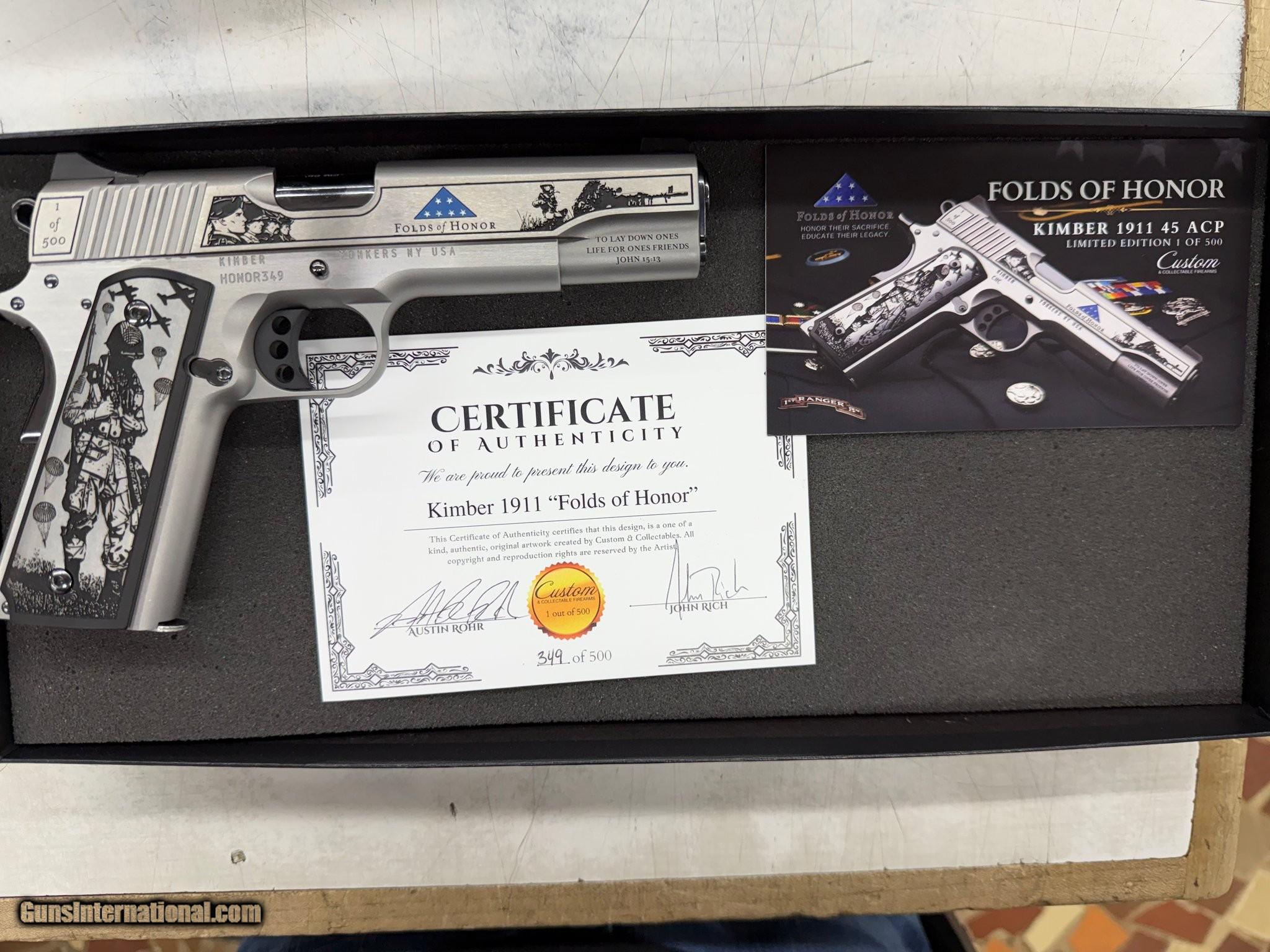 Description: Guns Listing ID: 607767 Brand new Kimber 1911 limited edition Folds of Honor semi auto pistol. Number 349 of 500. Comes in original box, 1 7rd mag, certificate of authenticity, card that tells about the folds of honor gun by John Rich, and collectors coin. Manufacturer: KIMBER Model: 1911 Caliber Info: .45 ACP Condition: Used - Non-Certified Barrels: 5" BARREL Action: SEMI AUTOMATIC Finish: black & stainless Price: $2,400.99 Contact Seller |