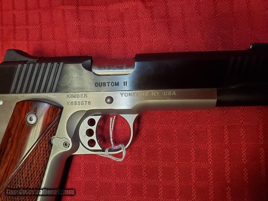 Description: Guns Listing ID: 1388209 KIMBER Custom II (Two-Tone) 1911 - .45 ACP with BEAUTIFUL Rosewood Grips **ONE KIMBER MAG & CASE One of the finest all-around pistols available from Kimber®, complete with a brushed-polished carbon slide, stainless steel frame & rosewood grips. Specifications: Height (inches) 90° to barrel: 5.25 Weight (ounces) with empty magazine: 38 Length (inches): 8.7 Magazine capacity: 7 Magazine well Recoil spring (pounds): 16.0 Full-length guide rod Frame Material: Stainless Steel Finish: Brush polish Width (inches): 1.28 Slide Material: Steel Finish: Brush polished, black Front serrations Barrel Length (inches): 5 Material: Stainless steel, match grade Stainless steel match grade bushing Twist rate (left hand): 16 Sights: Fixed low profile Radius (inches): 6.8 Grips: Smooth/checkered Rosewood Manufacturer: KIMBER Model: CUSTOM II Caliber: .45 ACP Magazines: ONE - KIMBER 8 ROUND MAG Sights: TRI-DOT - WHITE HIGHLIGHTED Weight: 38OZ Overall Length: 8.7\" Barrel Length: 5\" SERIAL NUMBER: K659576 SKU NUMBER: DJ1023722 SOLD Manufacturer: KIMBER Model: 1911 custom II Caliber Info: .45 ACP Condition: Used - Non-Certified Barrels: 5 BARREL Finish: TWO TONE BLACK AND STAINLESS |
