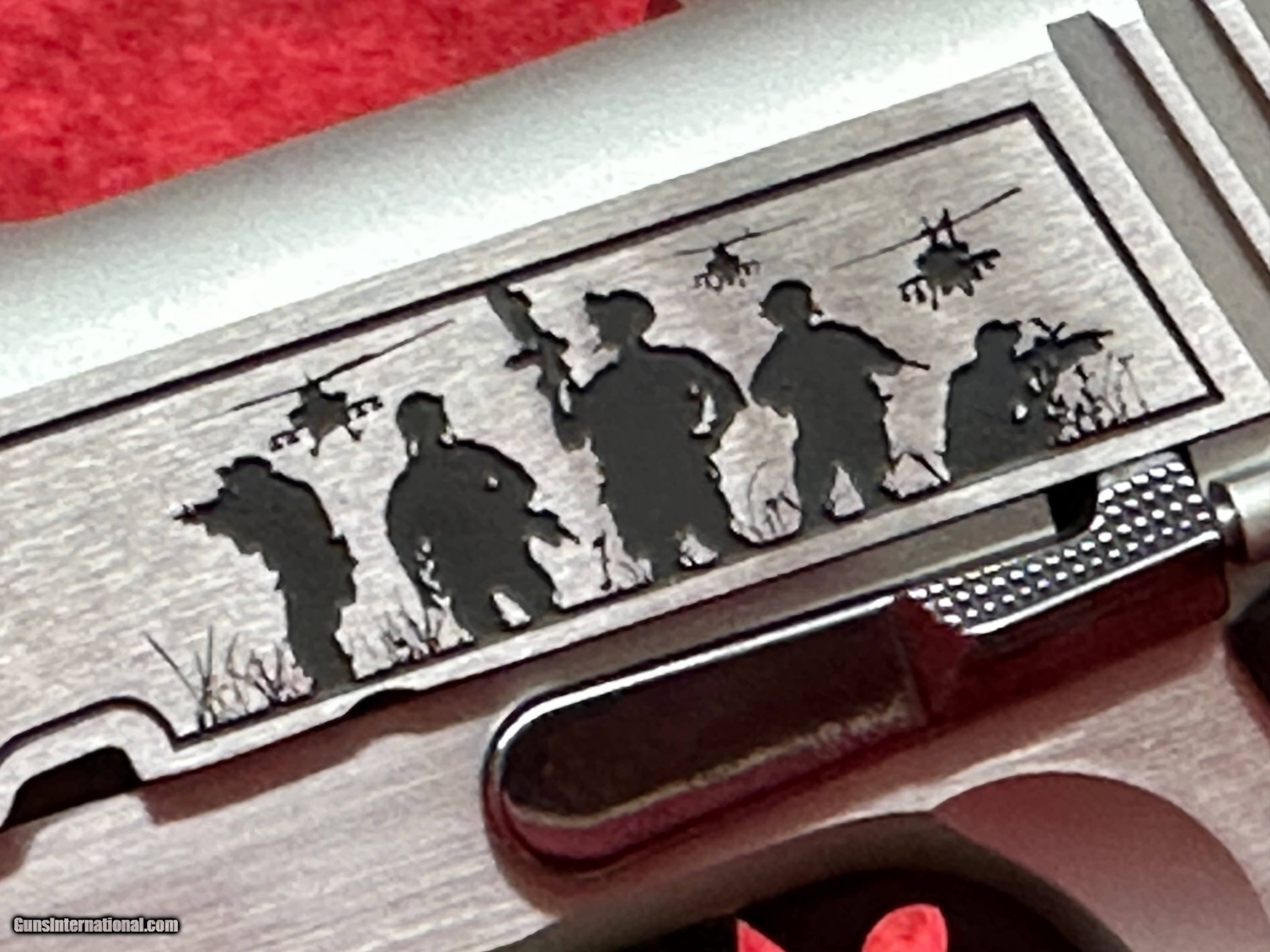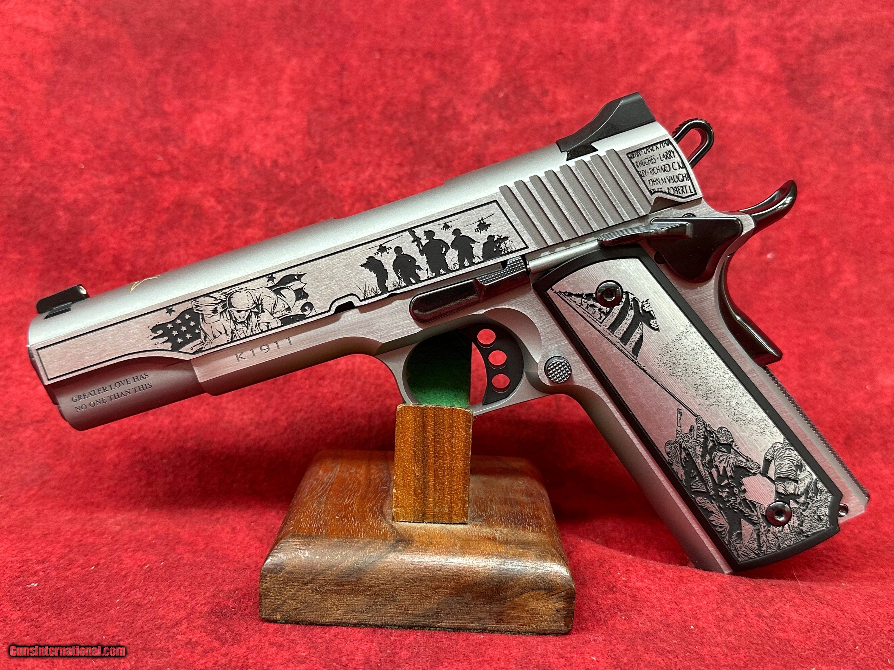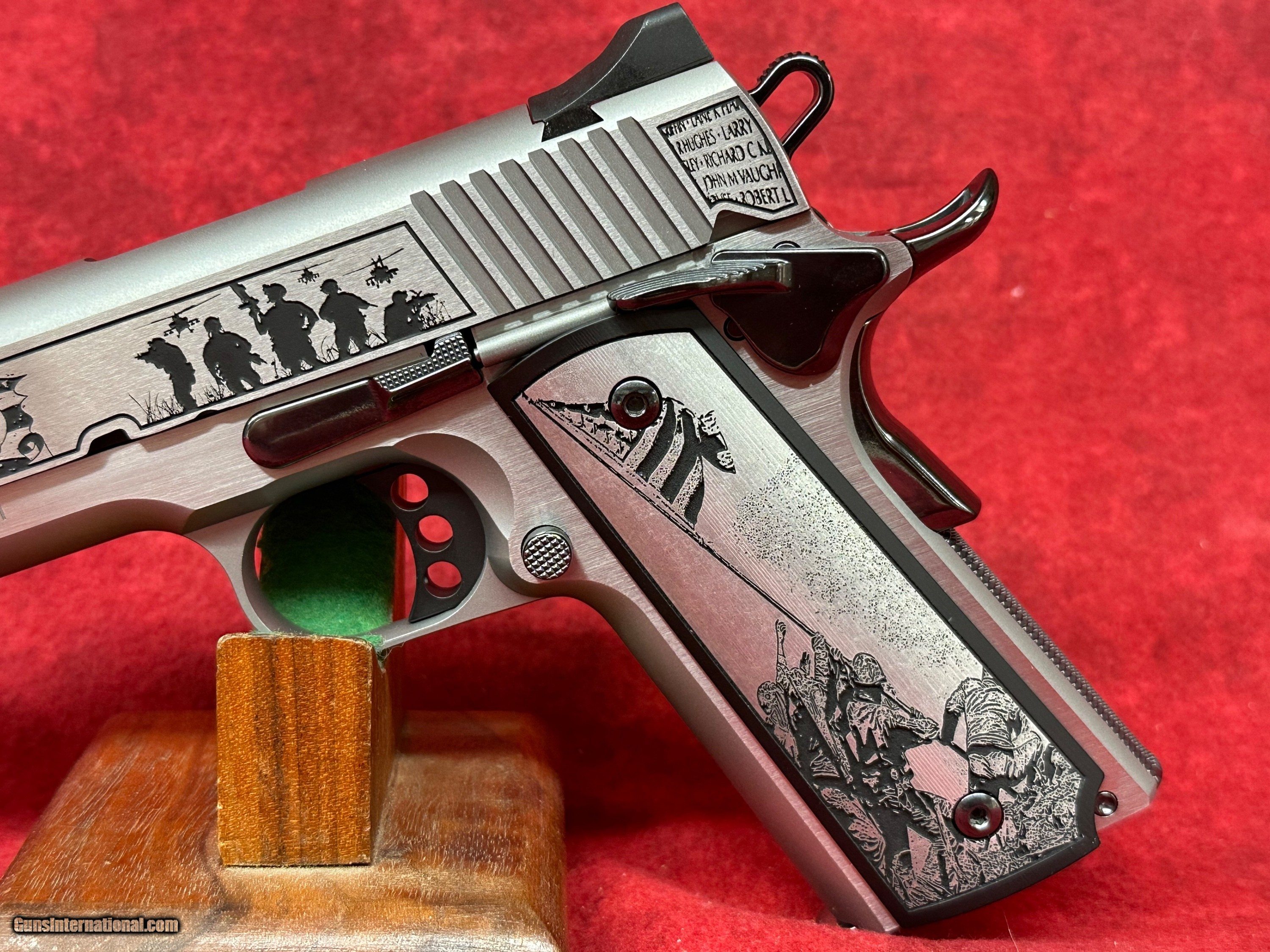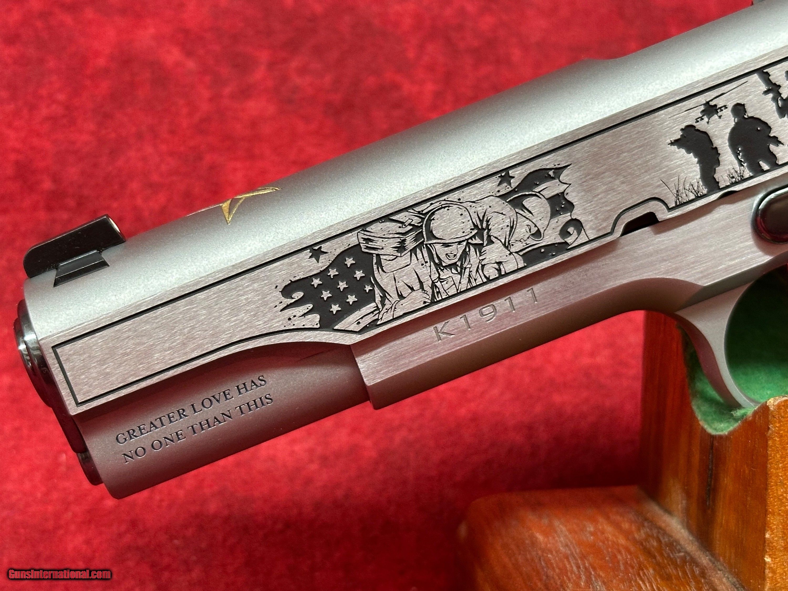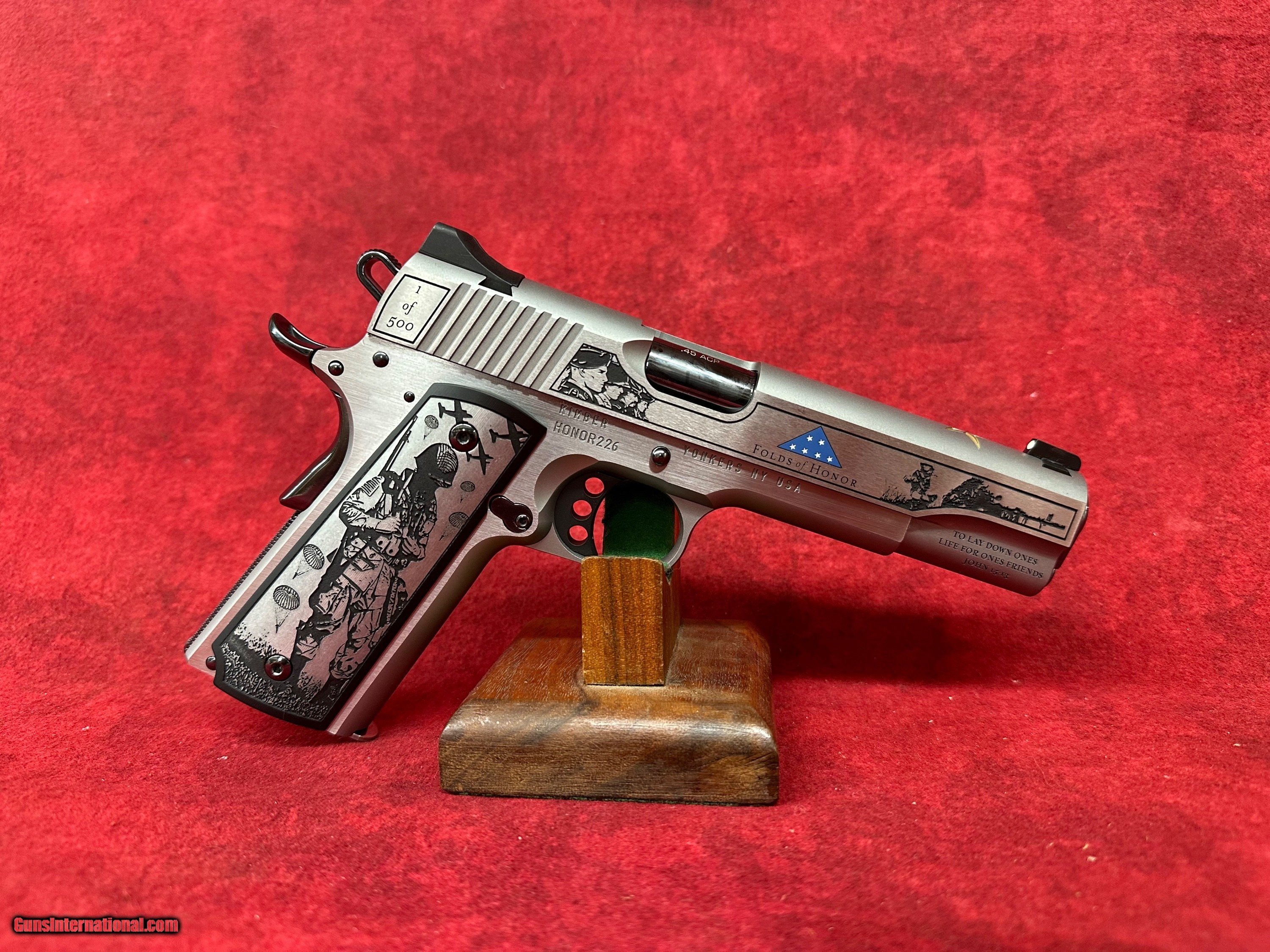 Description: Kimber 1911 Folds of Honor 45 ACP (CNCFOLDSHONOR) Custom & Collectable Firearms is proud to partner with Folds of Honor, a nonprofit organization that provides educational scholarships to the families of fallen or disabled U.S. service members and first responders. This limited-edition firearm is a true collector’s piece, engraved with historic war scenes and produced in a run of just 500 sequentially numbered Kimber 1911 pistols—each with an exclusive serial number run. This special series is proudly endorsed by country music star John Rich, a passionate supporter of Folds of Honor foundation. 100% of THE PROCEEDS are donated to the Folds of Honor Foundation. Details: ?? Gold Star Tribute – Elegantly etched into the top of the slide. ?? Limited Series – Only 500 sequentially numbered pieces. ?? Chambered in .45 ACP. ?? Verse engraved on the dust cover: "Greater love has no one than this: to lay down one's life for one's friends."-John 15:13 Specifications Caliber.45 ACP FinishScenic Engraved with backfill Barrel & ControlsHigh Polished Black DLC GripsCustom Scenic Engraved SeriesSequential 1 of 500 Firearms will need to be transferred through a FFL holder. Buyer to pay 45.00 S&H to lower 48. Prices reflect cash discount. There will be 3% added to credit card sales. Email us with any questions or call 1 605 793 2263 if we dont get back to you within 24 hours, either we didnt get your email, or you are not getting ourswe try to answer all our emails as quick as possible. Handgun Caliber: .45 ACP (.45 Auto) Manufacturer: Kimber Model: 1911 Folds Of Honor Barrel Length: 5 Condition: Brand New Price: $1,949.00 Buy Now Contact Seller |
