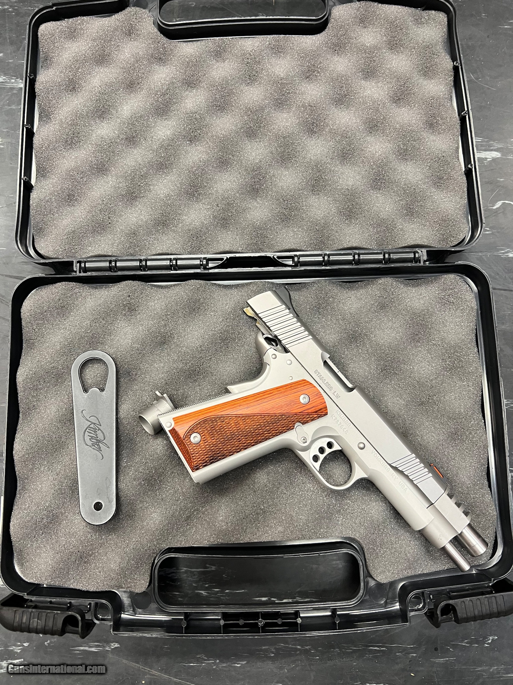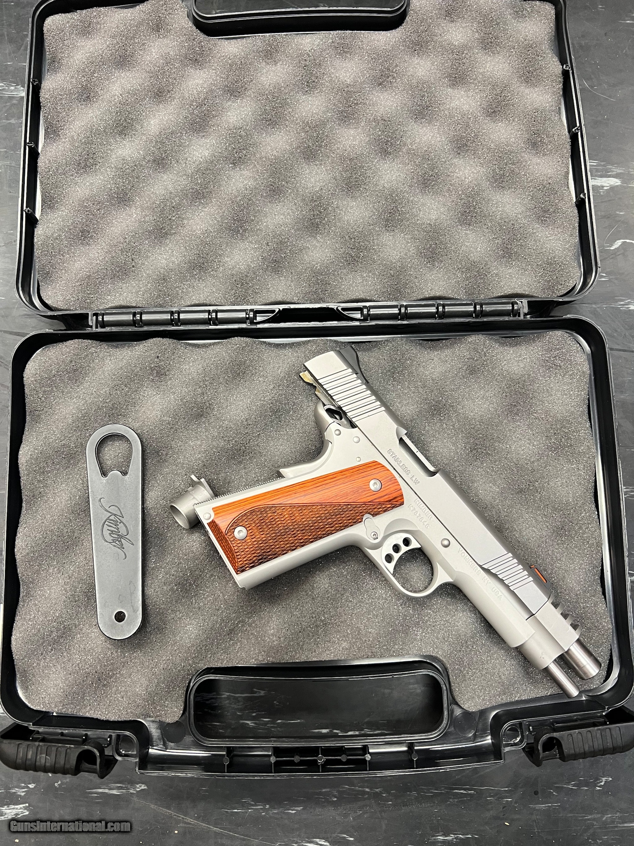 Description: Guns Listing ID: 1111327 Height (inches) 90° to barrel: 5.25. Weight (ounces) with empty magazine: 31.2. Length (inches): 8.7. Magazine capacity: 9rd., 9mm or 8rd., .45acp. Recoil spring (pounds):14.0. Used in case SOLD Manufacturer: KIMBER Model: 1911 LW Stainless Caliber Info: .45 ACP Condition: Used - Non-Certified Barrels: 5.25 BARREL Finish: STAINLESS |