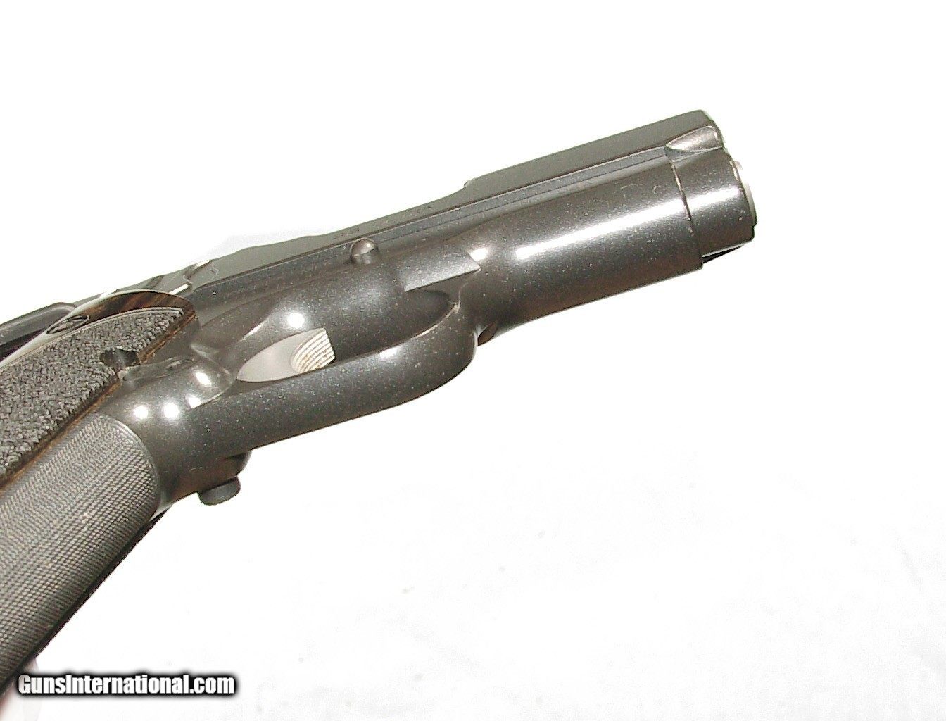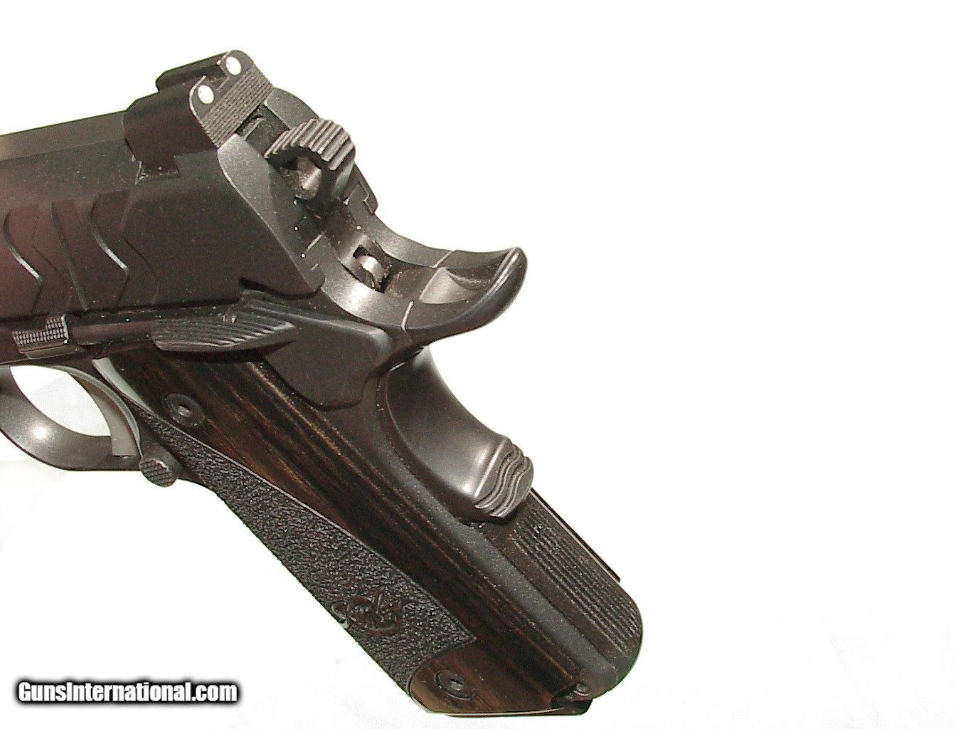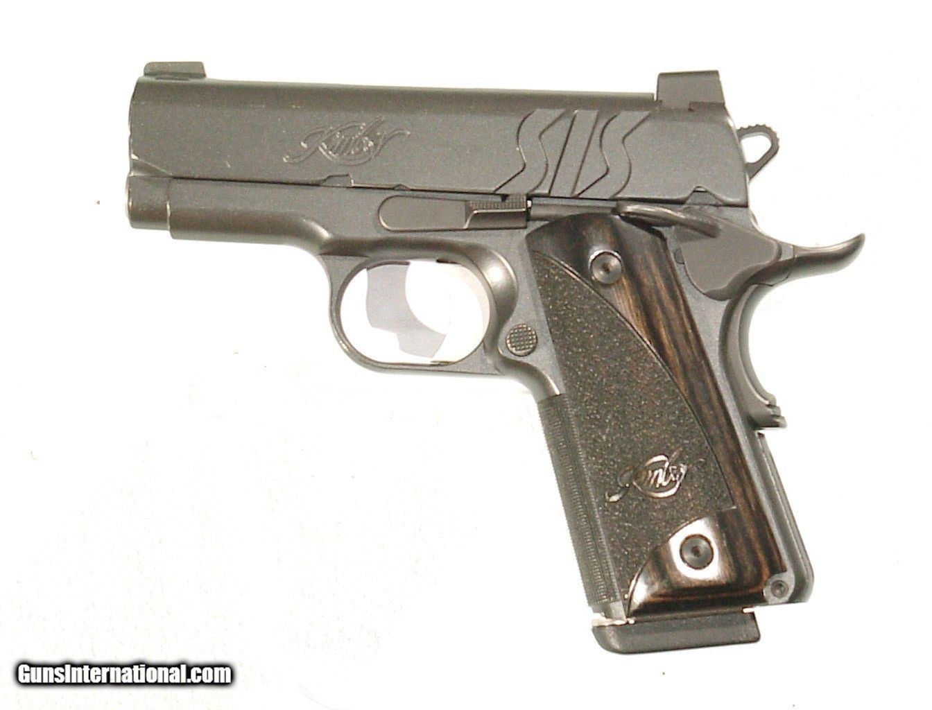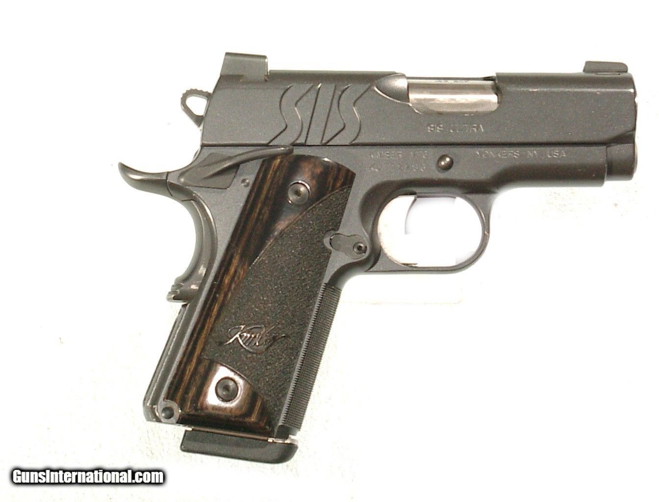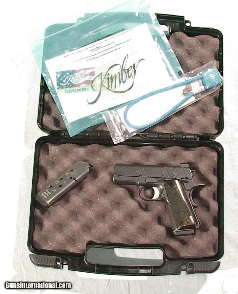 Description: .45 a.c.p. caliber, 3" barrel with single stack magazine. SIS (Special Investigative Squad) L.A.P.D. specs. In as new original condition. I believe that this was only test fired. In it's original Kimber carrying case with extra mag and paperwork. SOLD |
