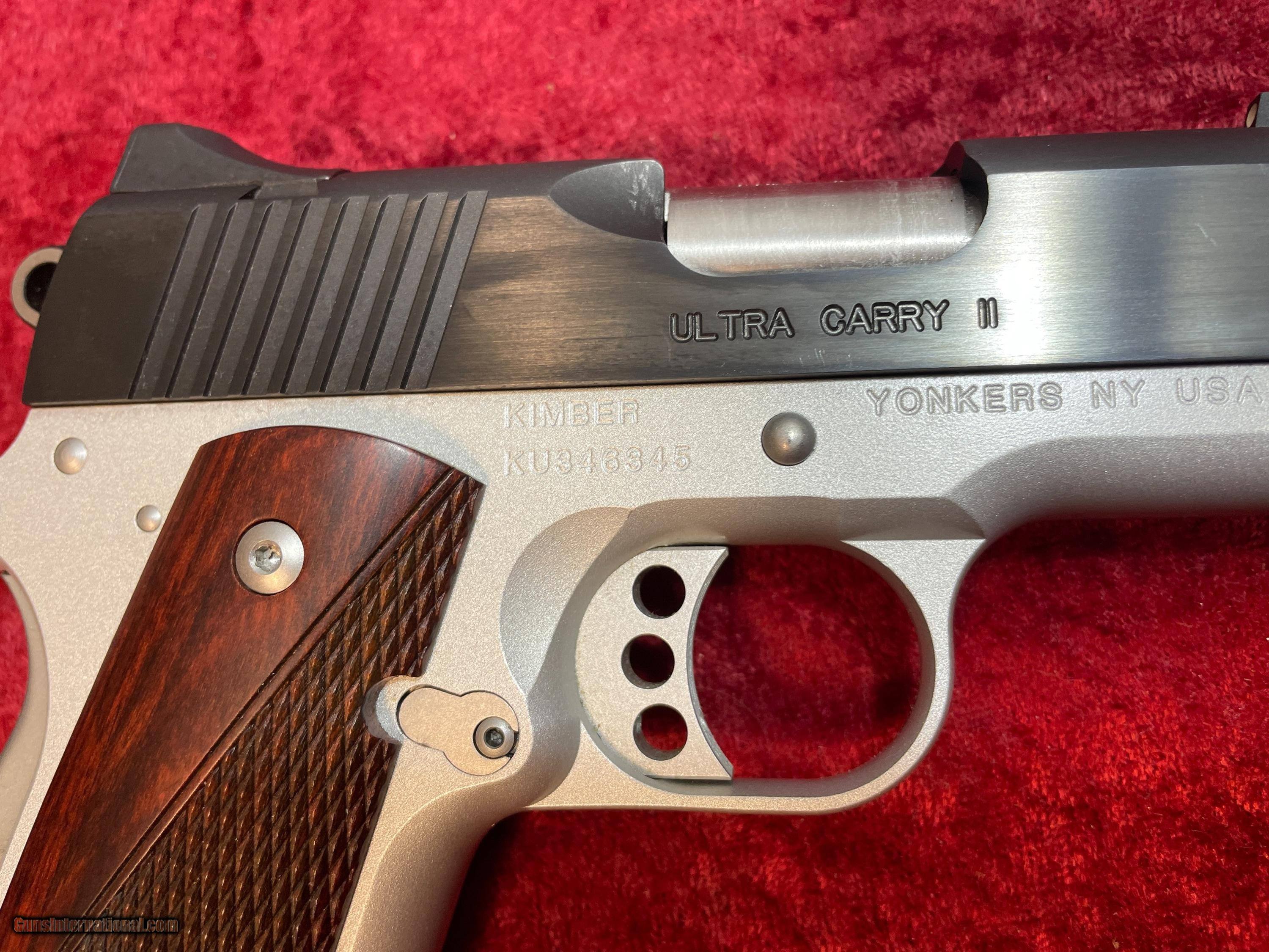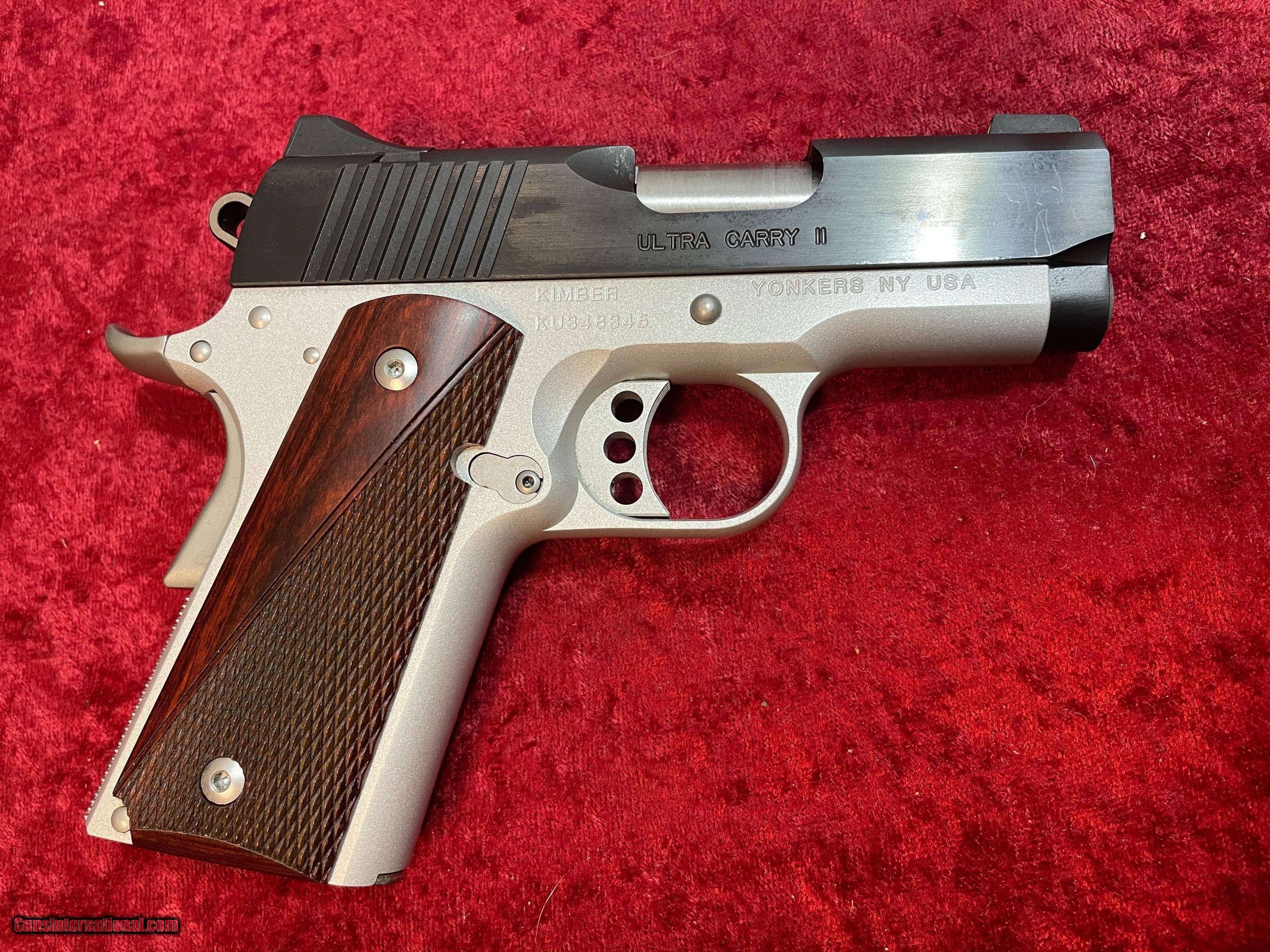 Description: Kimber 1911 Ultra Carry II Two-Tone 7rd 3" 45 acp #KIM3200321 Galco Avenger Belt holster inluded ($169 value) The Ultra Carry II (Two-Tone) is a hallmark of Kimber quality, complete with a brushed-polished carbon slide, aluminum frame and smooth/checkered rosewood grips. Aluminum Frame, Smooth/Checkered Rosewood Grips, Aluminum, three hole standard trigger. This used pistol is in very good condition showing a few light handling marks on the right side of the barrel from holster wear. Please see pictures of actual pistol you will receive. Comes with (4) 7-round mags and Galco F189WC AV424 leather holster, Original box & paperwork.