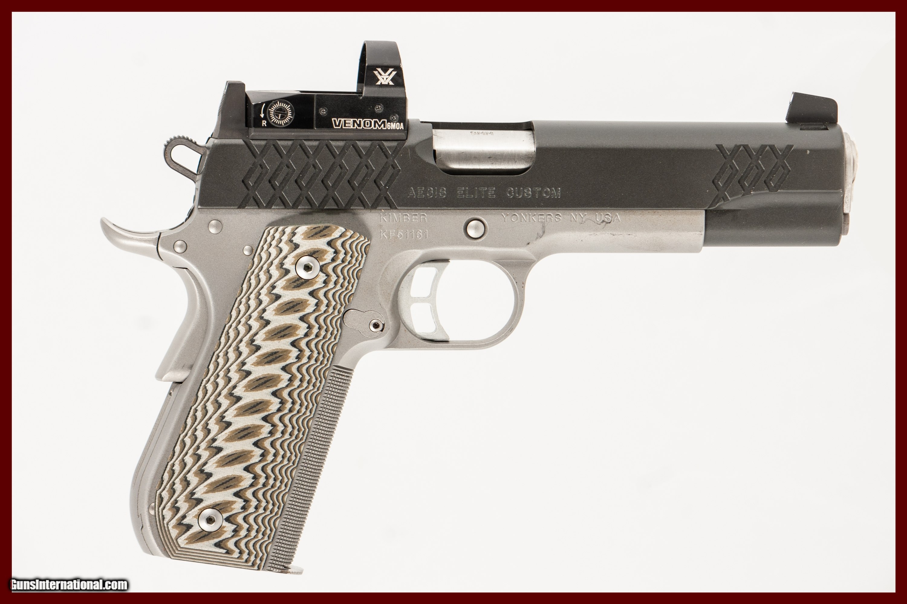 Kimber Aegis Elite Custom chambered in 9mm with a 5 inch barrel bright & shiny bore Vortex Venom red dot sight and original case. This gun is in excellent condition and is covered by Dury's Lifetime Warranty.
