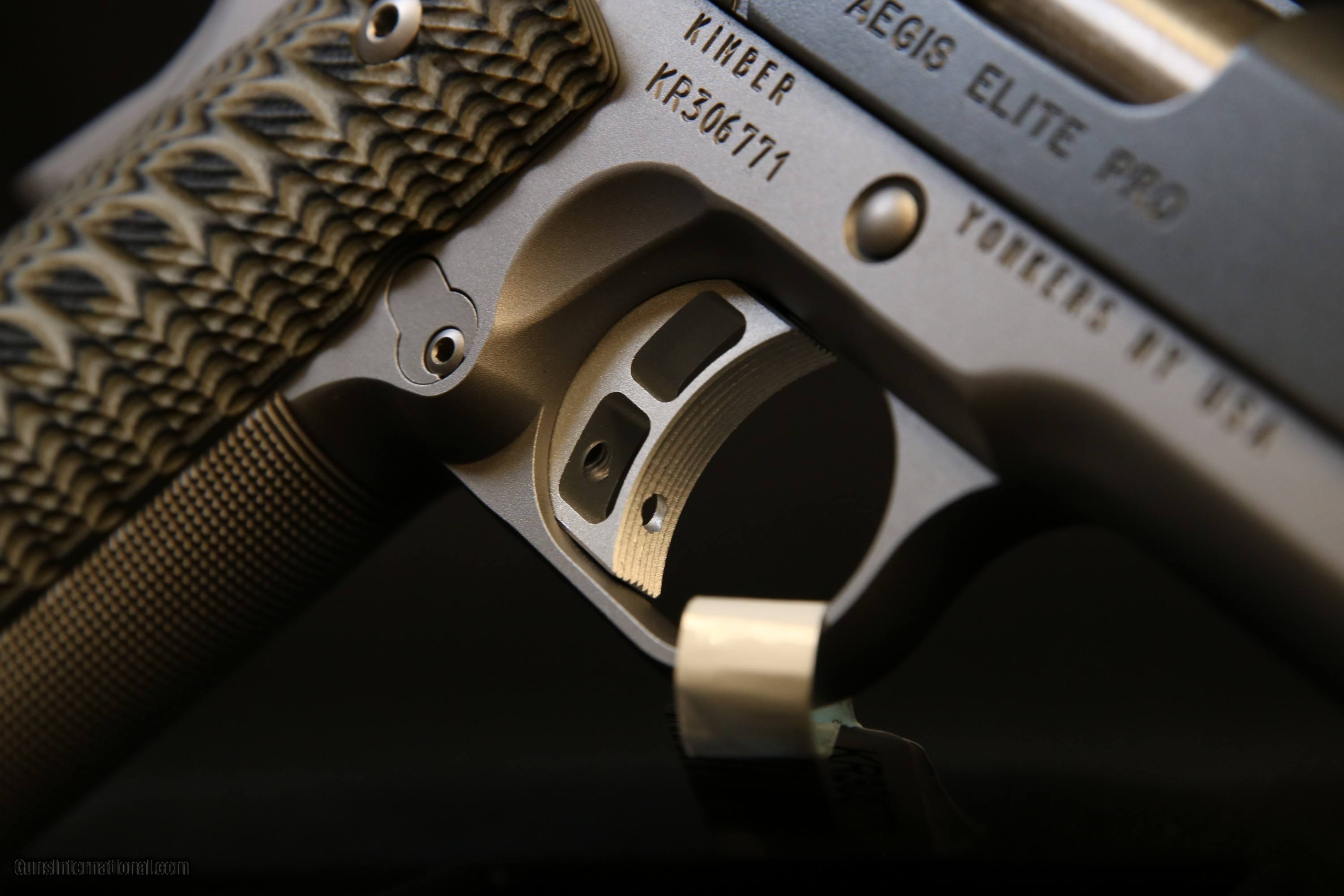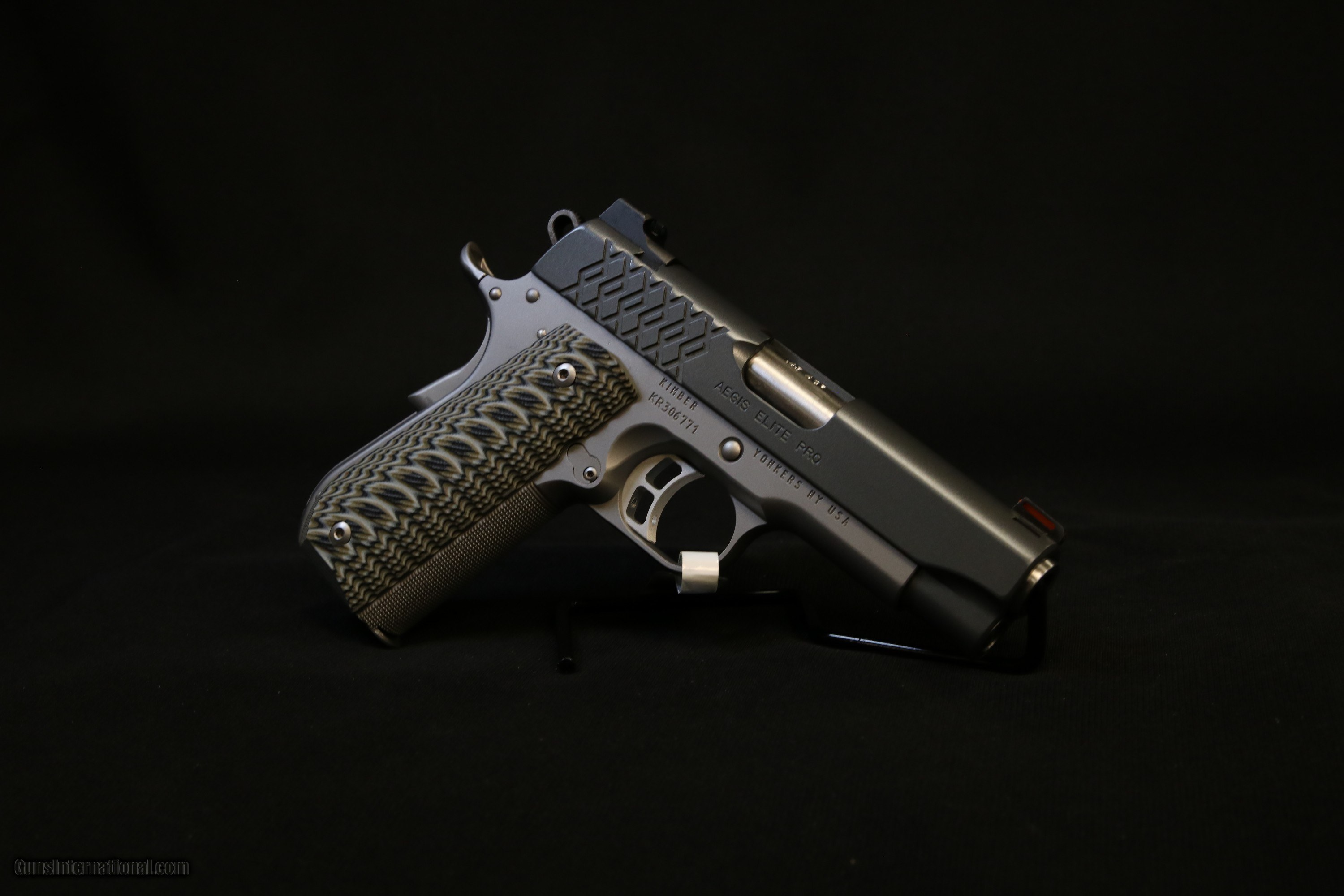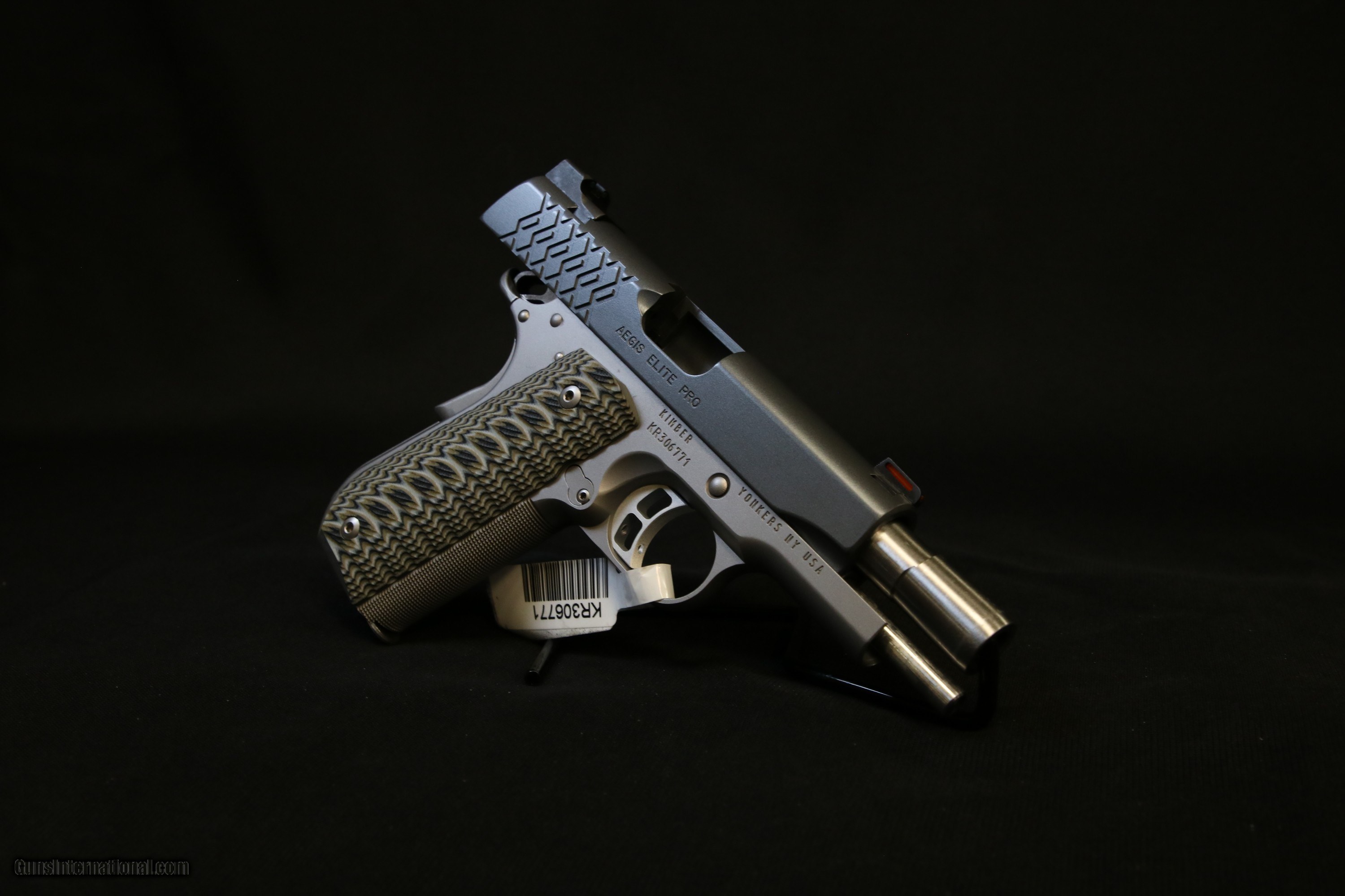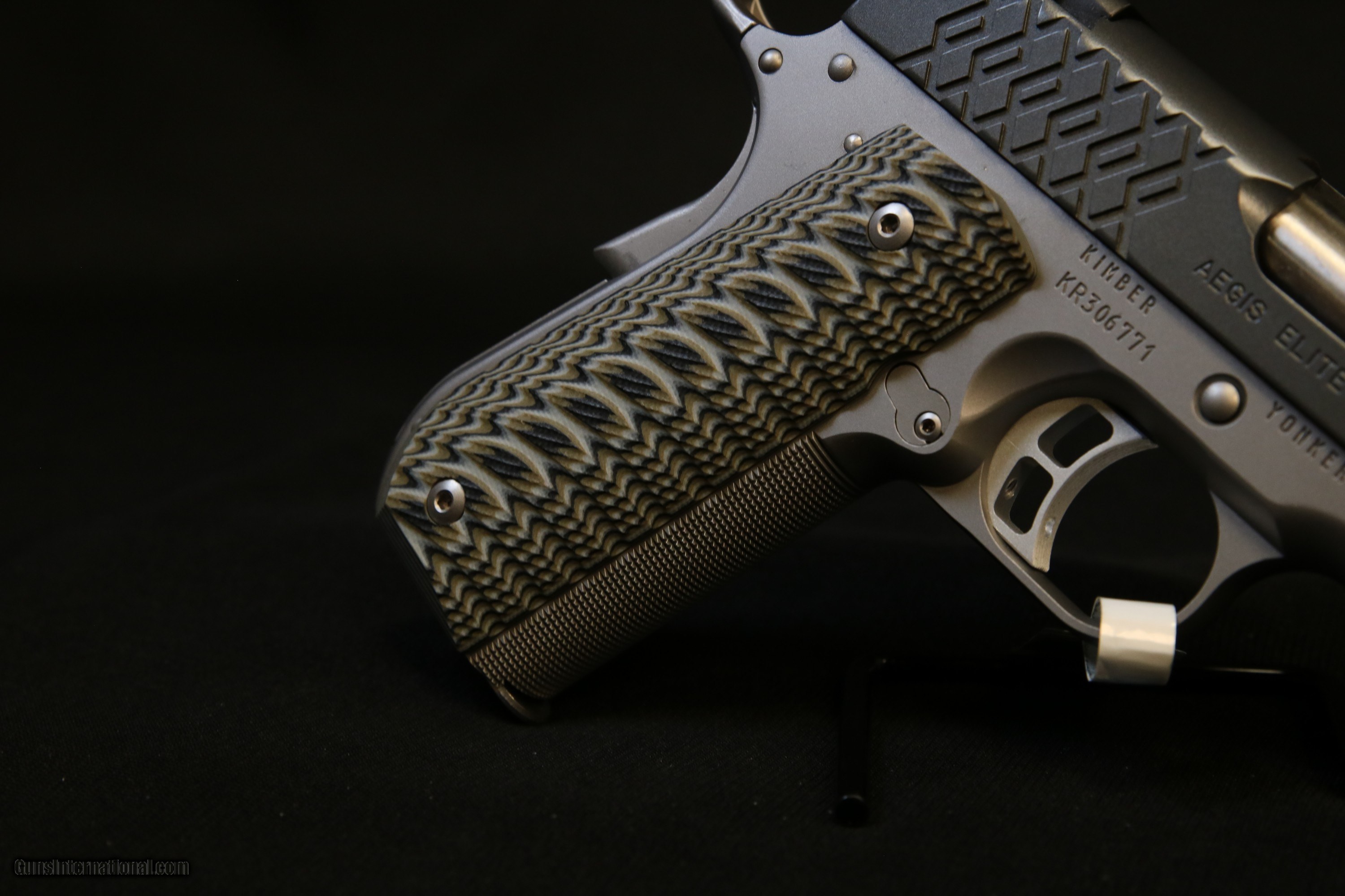 Description: The Aegis Elite Pro has green and red fiber optic sights for a bright, clear sight picture. Available in 9mm and .45 ACP, it has distinctive rear and forward Aegis Elite X (AEX) slide serrations. Kimber AEGIS ELITE PRO (FO) Single 45 ACP 4" Handgun