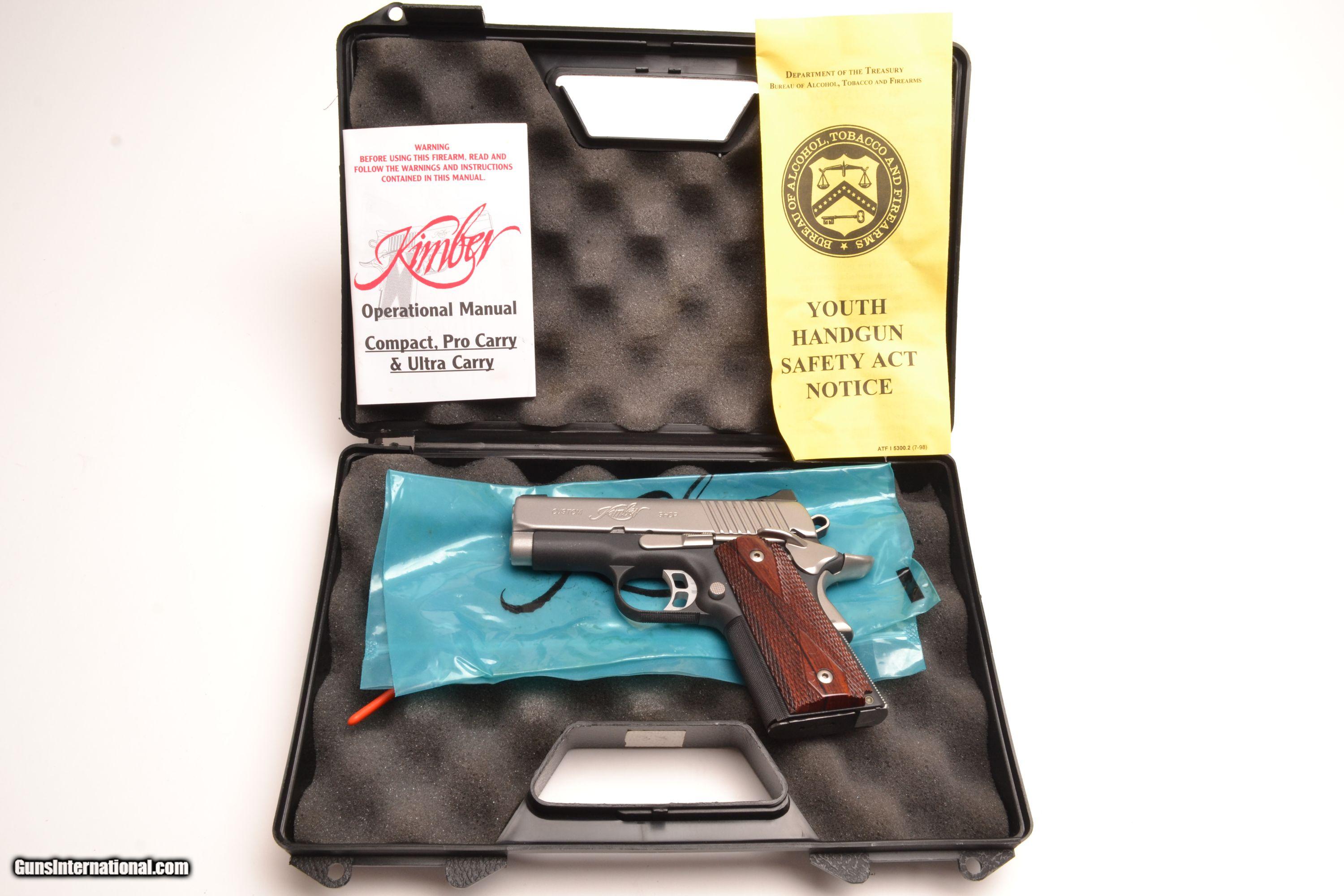 Description: .45 ACP cal., Custom Shop pistol featuring Tritium night sights, stainless steel slide with black anodized aluminum frame, 3 in. (Ultra CDP II, 25 oz.), SA, Carry Melt treatment, ambidextrous thumb safety, double diamond pattern checkered rosewood grips, 30 LPI checkered front strap and under trigger guard (new 2003), two-tone finish. As new in box/unfired