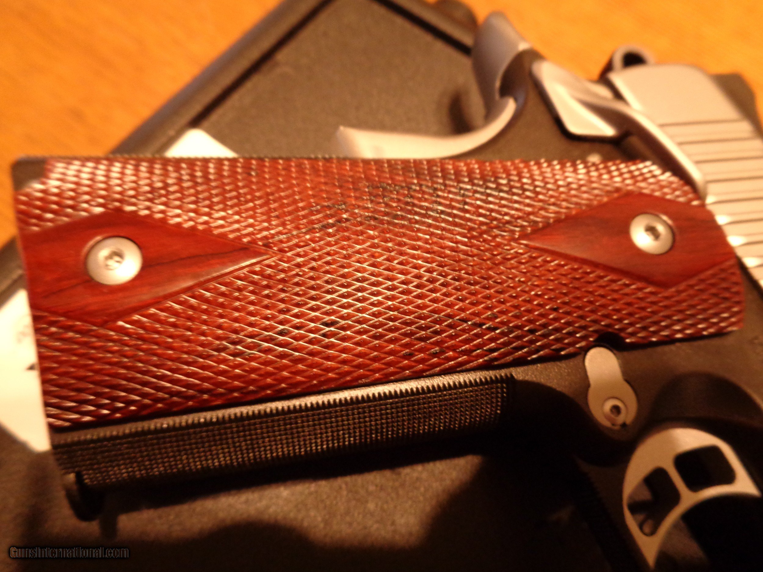 Description: Specifications Height (inches) 90° to barrel: 5.25 Weight (ounces) with empty magazine: 31 Length (inches): 8.7 Magazine capacity: 7 Ambidextrous thumb safety Carry Melt treatment Recoil spring (pounds): 16.0 Full-length guide rod Frame Material: Aluminum Finish: Charcoal gray, KimPro II Width (inches): 1.28 30 lines-per-inch front strap checkering 30 lines-per-inch checkering under trigger guard Slide Material: Stainless steel Finish: Satin Silver, KimPro II Front serrations Barrel Length (inches): 5 Material: Stainless steel Stainless steel match grade bushing Twist rate (left hand): 16 Sights Fixed low-profile 3-dot tritium night sights Radius (inches): 6.8 Grips Rosewood Trigger Premium Aluminum Trigger Factory setting (approximate pounds): 4.0 - 5.0 Product Code Product #: 3000234 UPC: 669278302348 Credit cards add 4% shipping is 40.00 includes insurance SOLD Manufacturer: Kimber Caliber Info: .45 ACP |