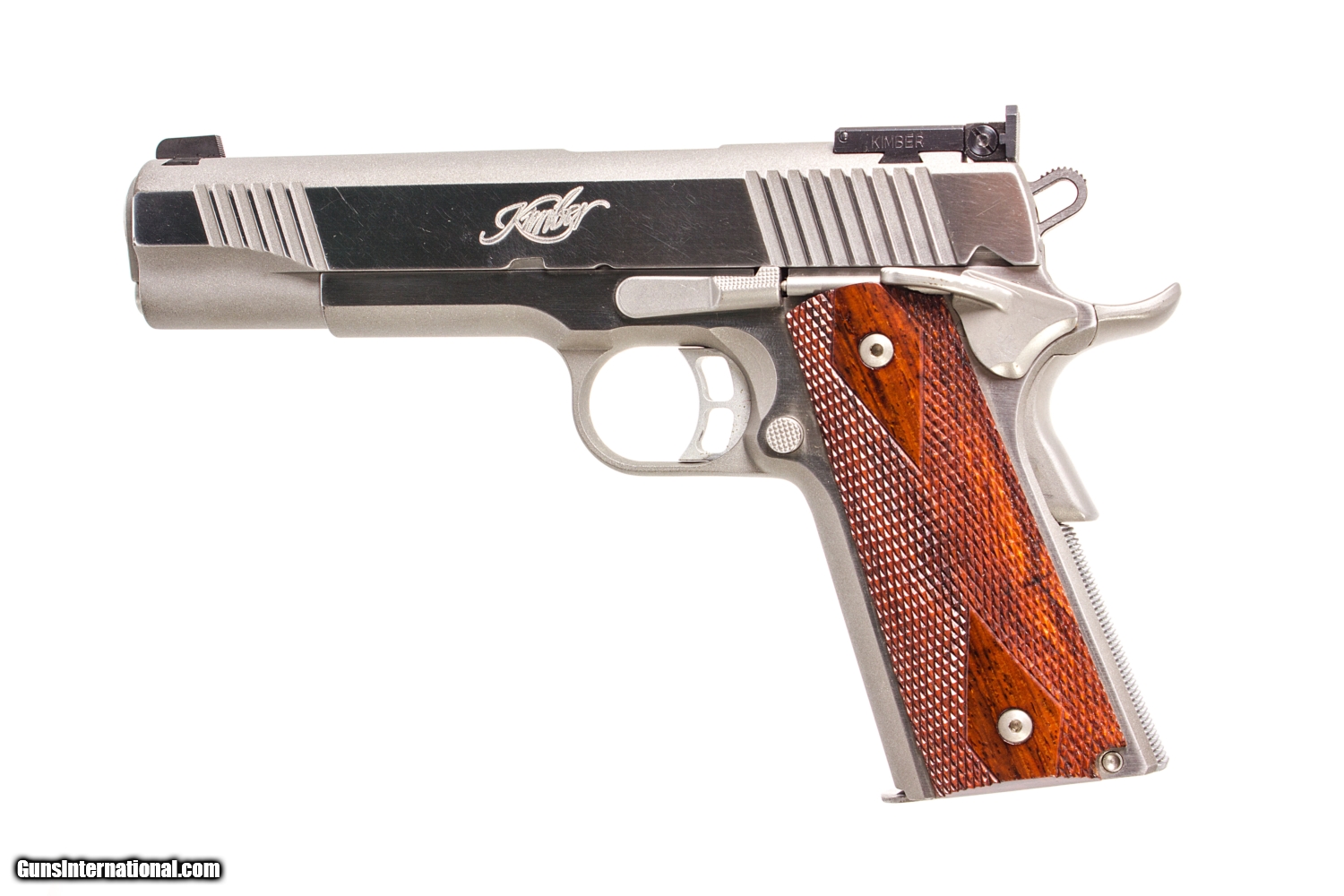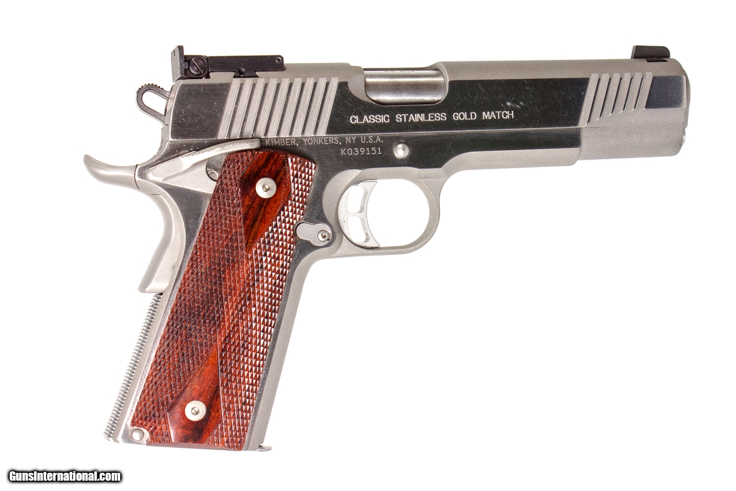 Kimber Classic Stainless Gold Match 45 ACP. 5 inch match barrel, adjustable factory sights, checkered wood grips, has ambidextrous safety, and comes with factory case and 1 magazine.