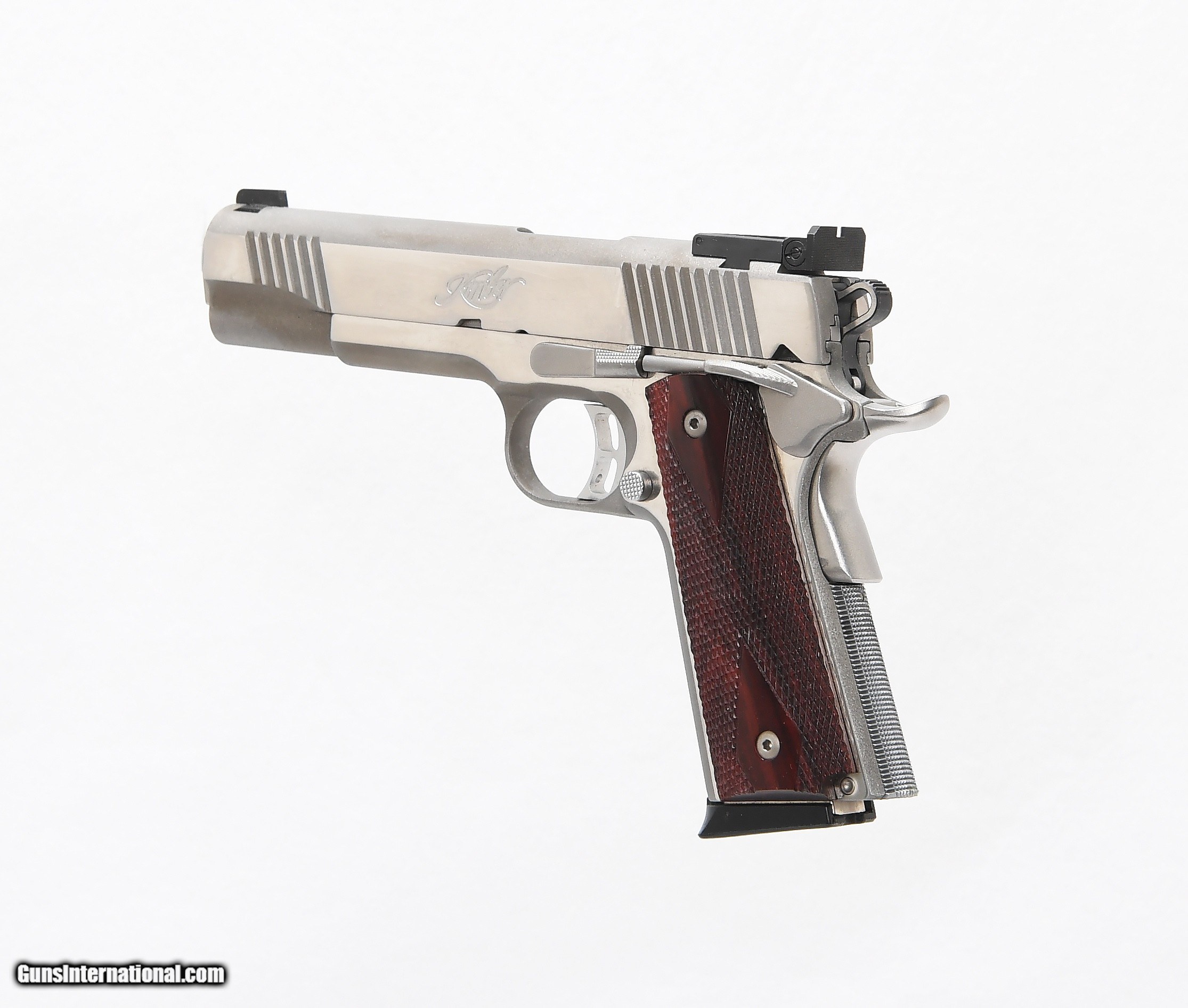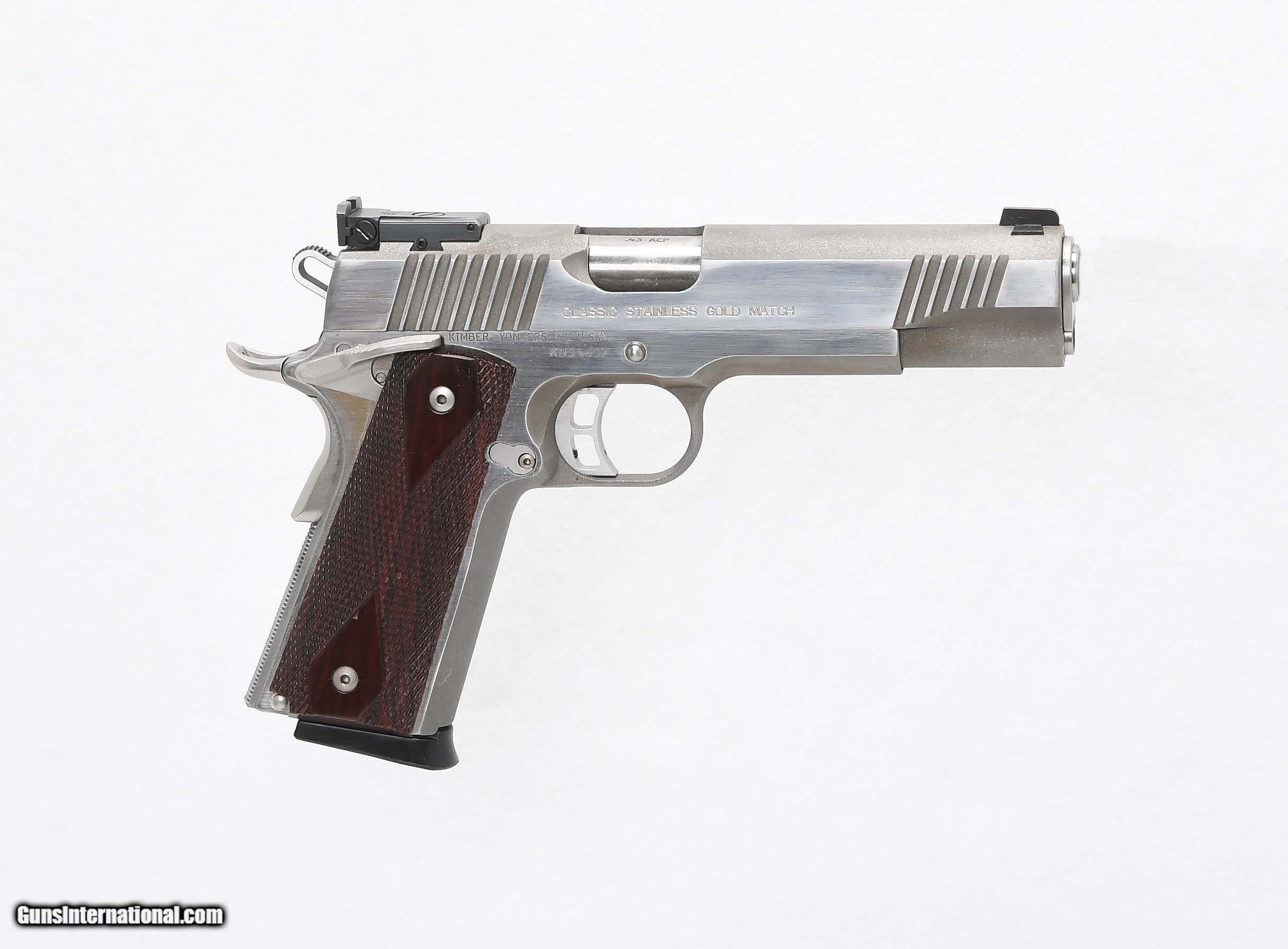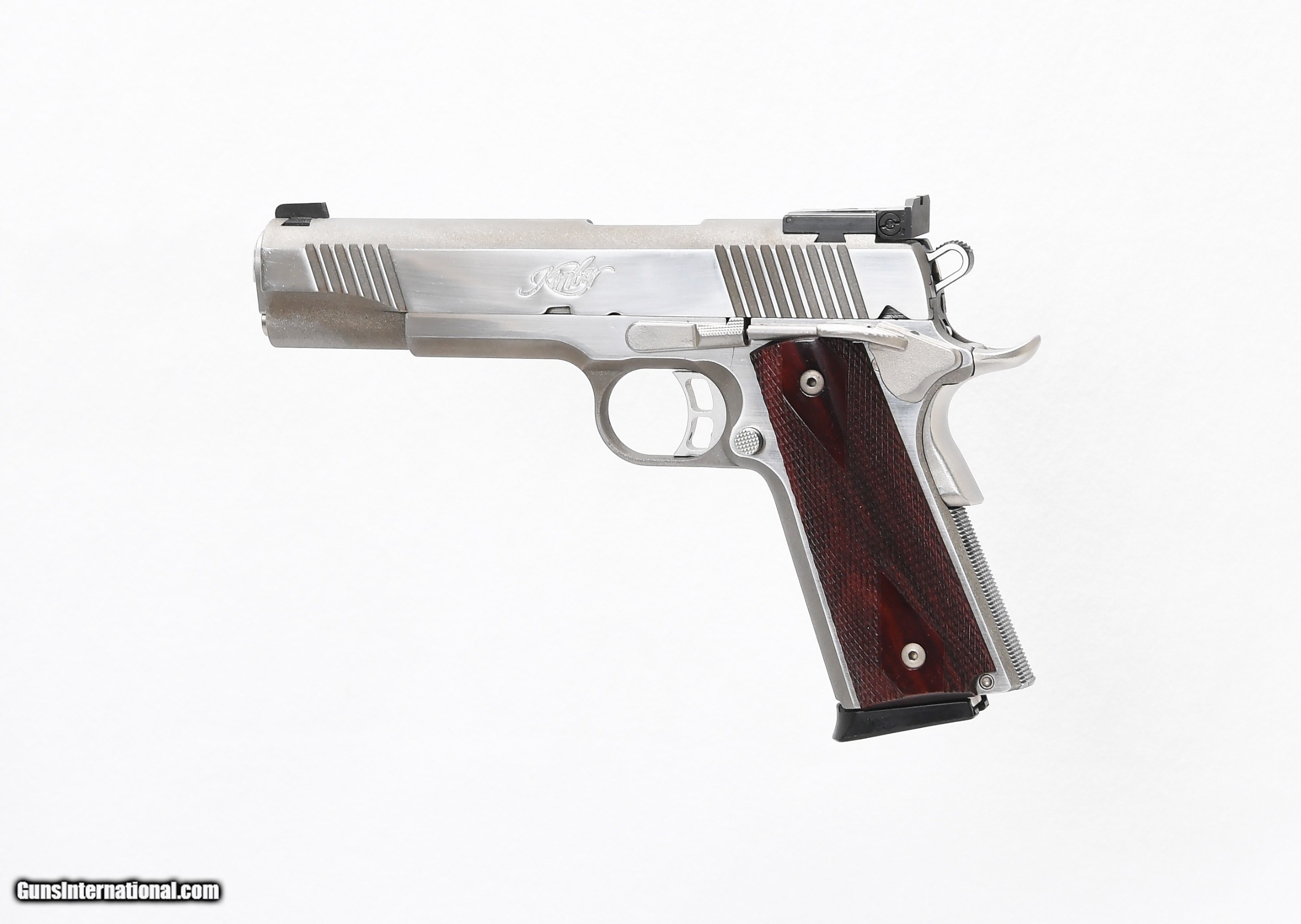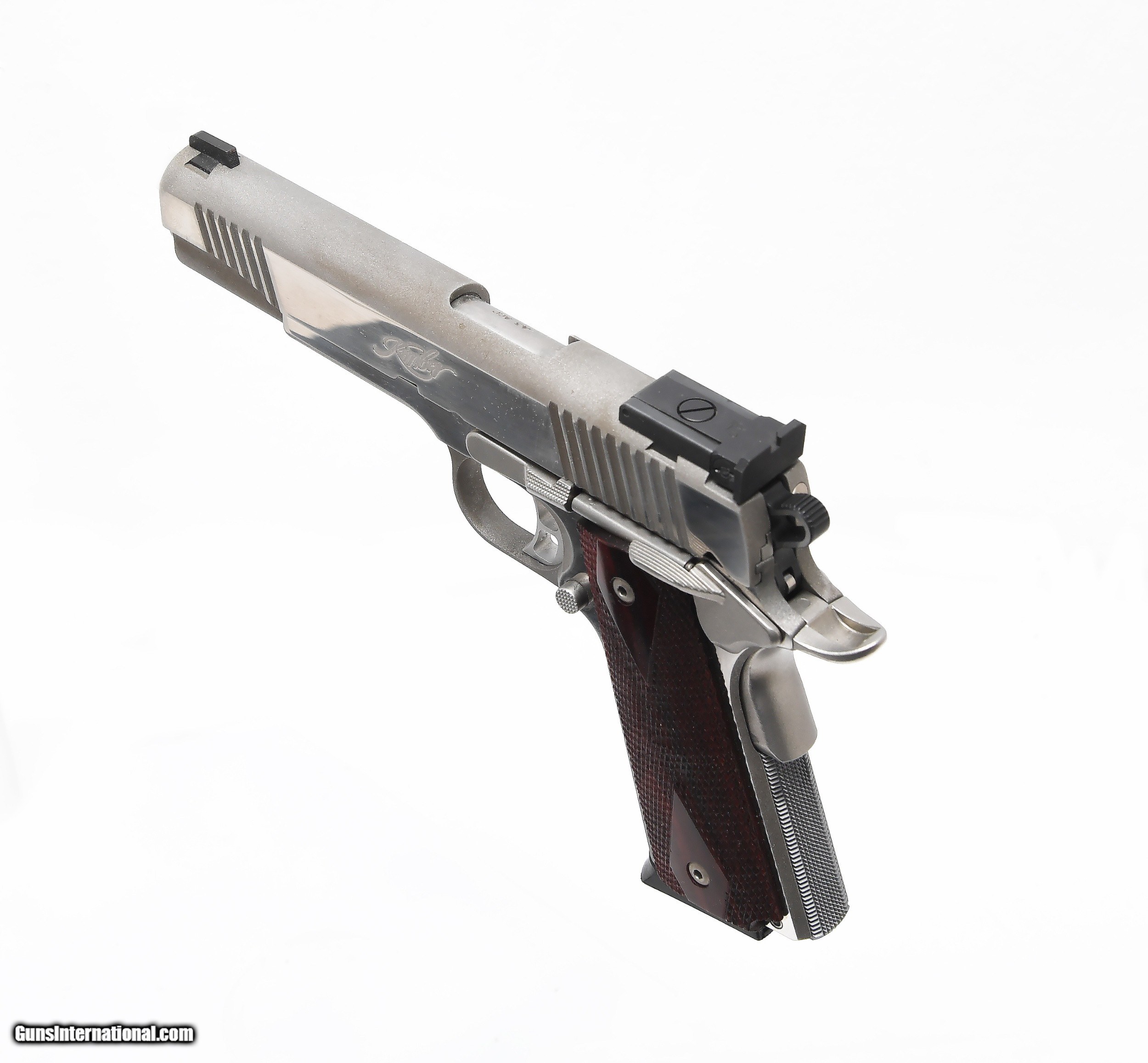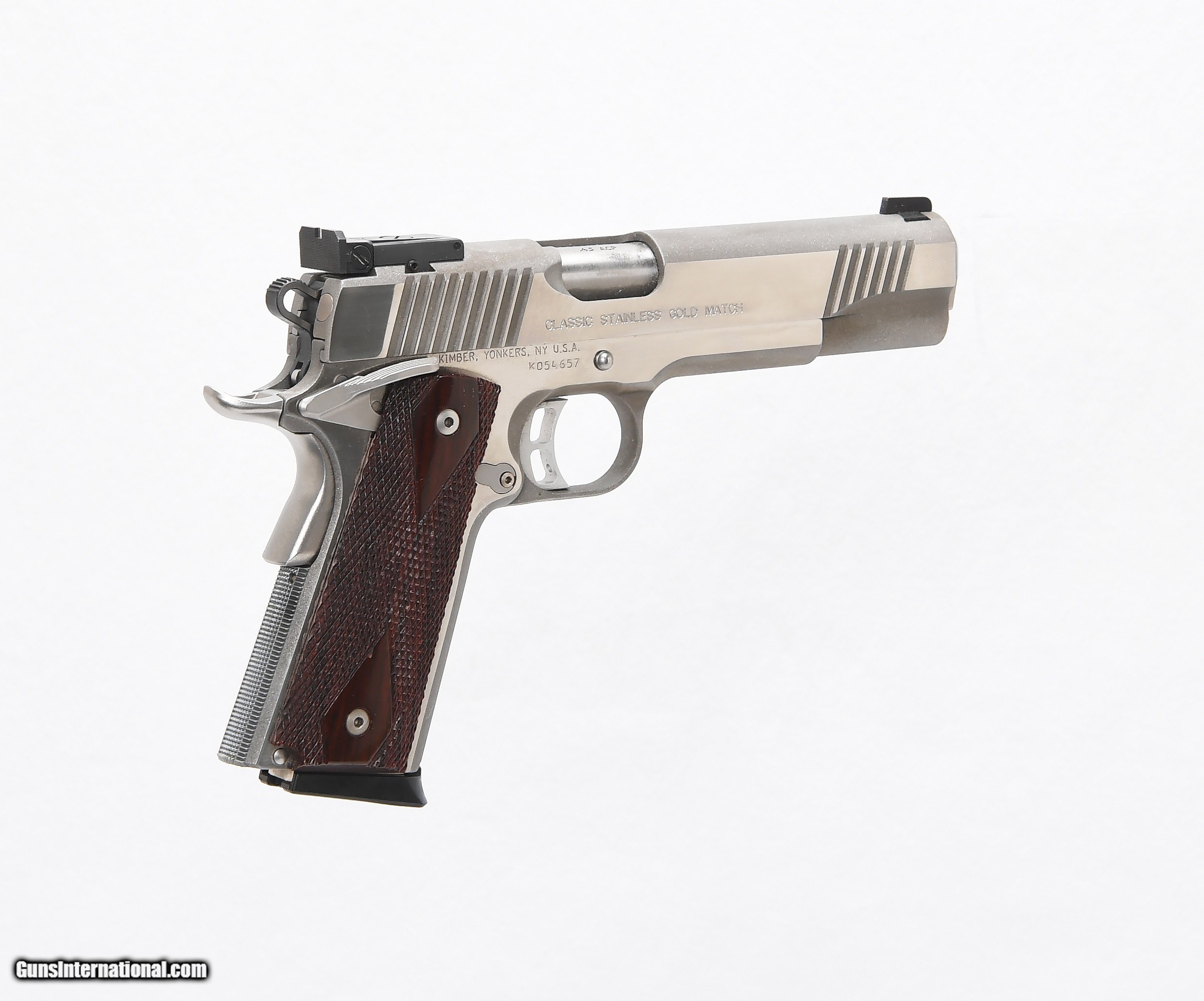 Description: Kimber Classic Stainless Gold Match 1911 pistol in .45 acp. Brilliant bright stainless slide and frame with bead blasting on the top of the slide and the bottom of the frame. It appears to have been test fired only and retains 98%+ original finishes. Mechanically perfect. Original box, magazines, bushing tool and paperwork. $1,250.00 SN: K054657 SOLD |