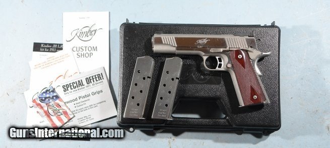 Description: KIMBER CLASSIC STAINLESS GOLD MATCH .45ACP PISTOL IN. BOX. Serial number "K0455XX" with matching plastic box and end label. All factory with various contrasting bright polish/ matte(bead blasted) parts(see photos). Factory adjustable rear target sight and factory front. Lightweight hammer and trigger. Extended grip safety. Ambi safety. Factory checkered wood grips(rosewood color). Flat mainspring housing. I believe all the above factory features. Original magazine with two additional bright polished "KimPro" Tac-Mags. Gun appears slightly used with typical light scratches on slide from use and very little holster wear. Not many miles on it though. In box is collet wrench, tool, blue original Kimber bag, and original Kimber papers and promo material. SOLD |