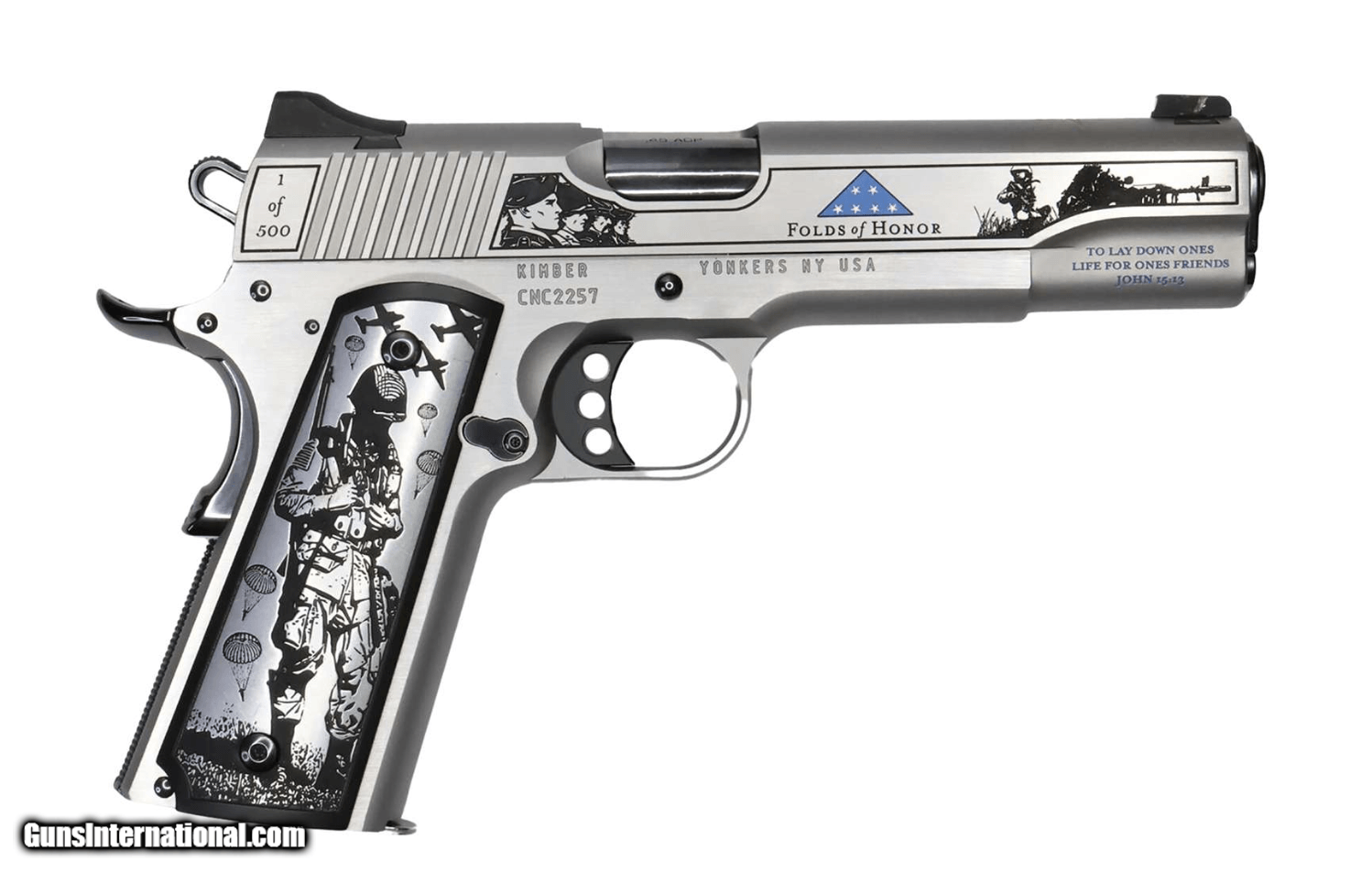 Description: Guns Listing ID: 609273 The CNC Folds of Honor 1911 features a stainless steel slide engraved with the Folds of Honor logo and a scenic sniper engraving. The aluminum grips showcase a custom scene of the iconic Iwo Jima flag-raising Marines and a WWII paratrooper. Etched into the top of the slide is a Gold Star Tribute and an engraved bible verse on the duct cover.*Folds of Honor is a nonprofit organization that provides educational scholarships to the families of fallen or disabled service members and first responders. Folds of Honor has become a symbol of hope, representing the enduring ideals that make this country a beacon of democracy. **Limited Series only 500 sequentially numbered pieces. Manufacturer: KIMBER Model: CNC FOLDS OF HONOR Condition: new Action: SEMI AUTOMATIC Price: $2,299.99 Contact Seller |