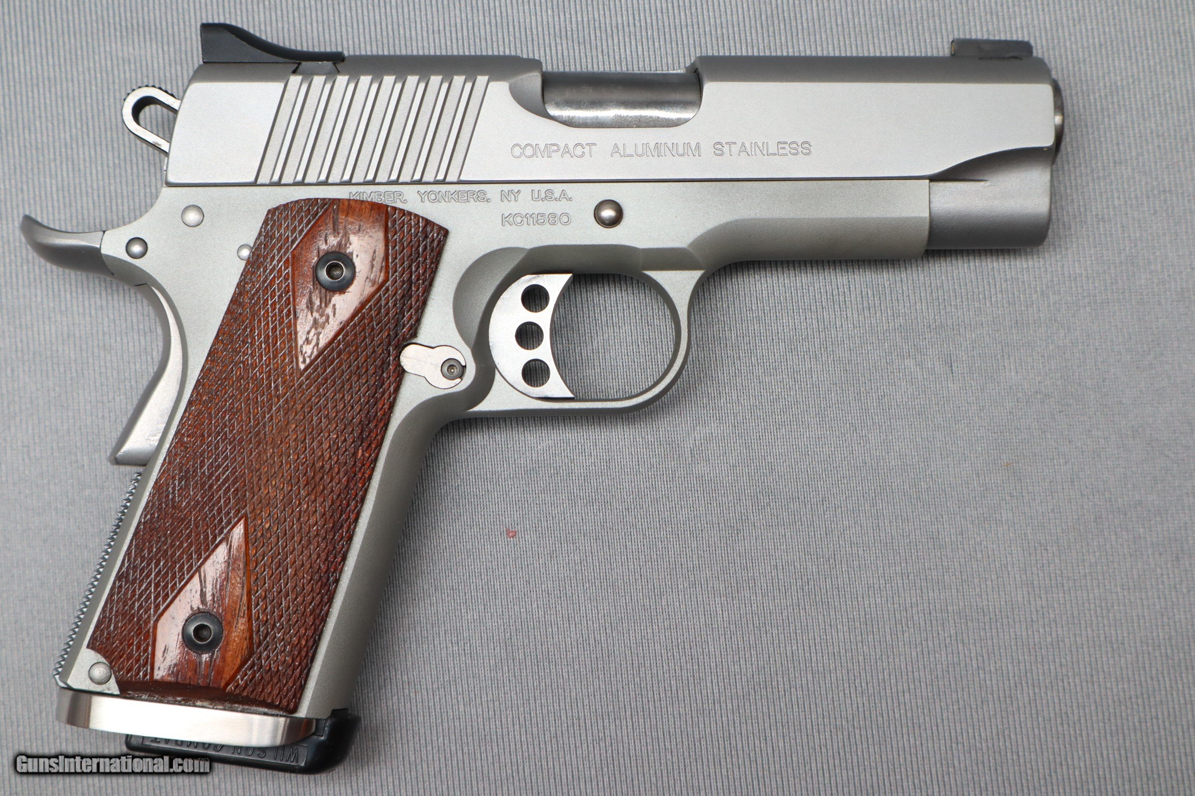 Description: This Kimber Compact 1911 is a right handed, Aluminum framed, hammer fired, semiautomatic pistol chambered in .45 ACP. It is equipped with a manual safety and a grip safety. It has a white residue in the checkering on the grips. .45 ACP SOLD Chambers: .45 ACP Metal Condition: Good Wood Condition: Poor Bore Condition: Good Barrels: 4 Triggers: Single Action Only Weight: 1.8 lbs Sights: Iron Sights Item Location: Missoula, MT |