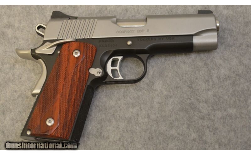 Description: This is a semi-automatic Kimber Compact CDP II chambered in .45 ACP. It has a 4" stainless barrel and a white dot sight. It has wooden pistol grips with fine checkering which are in excellent condition. The metal is also in excellent condition with minimal markings, and the bore is bright and shiny. This pistol comes with the factory case. SOLD Caliber Info: .45 ACP. Chambers: Semi-automatic. Metal Condition: Excellent, with minimal markings. Wood Condition: Excellent, with minimal markings. Bore Condition: Bright and shiny. Barrels: 4" stainless barrel. Triggers: Single curved trigger. Stock: Wooden pistol grips with fine checkering. Weight: 28 oz. Sights: White dot sight. Extras: This pistol comes with the factory case. Item Location: Huntsville, AL |