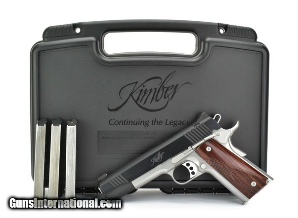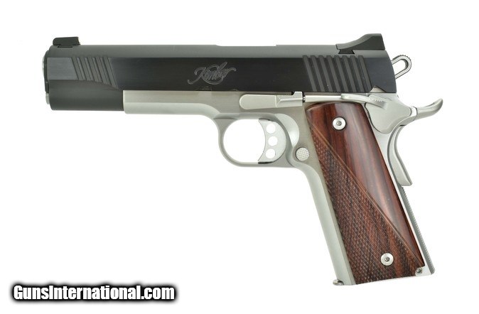 Description: Kimber Custom II .45 ACP caliber pistol. Two-tone model with wood grips and black slide, magazine and box. Excellent condition.