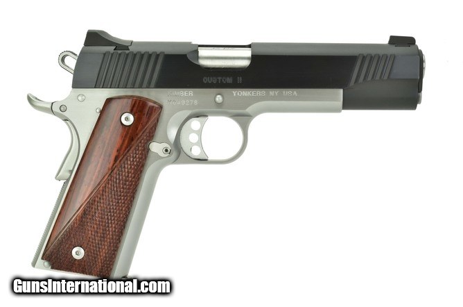 Kimber Custom II .45 ACP caliber pistol. Two-tone model with wood grips and black slide, magazine and box. Excellent condition.